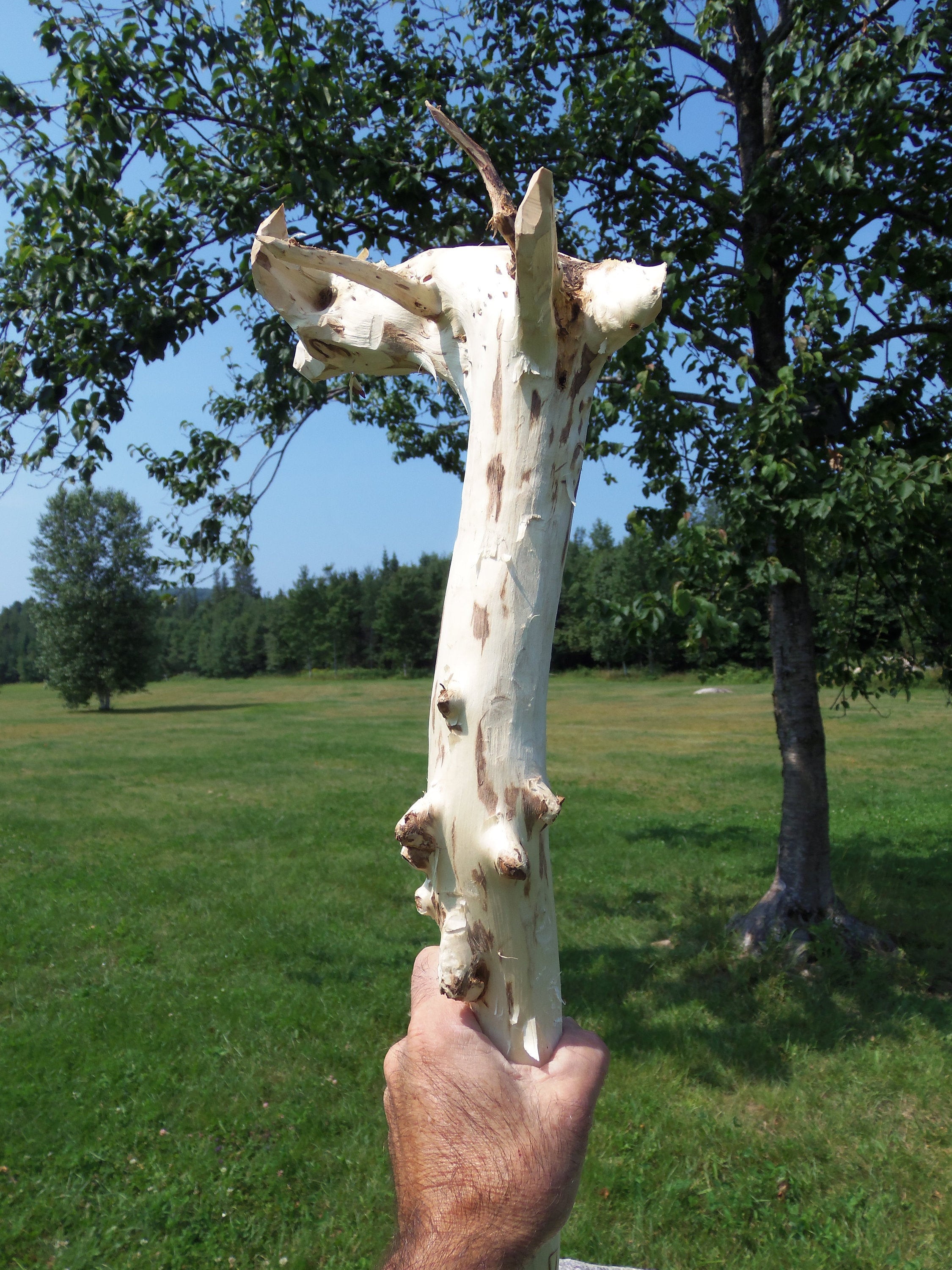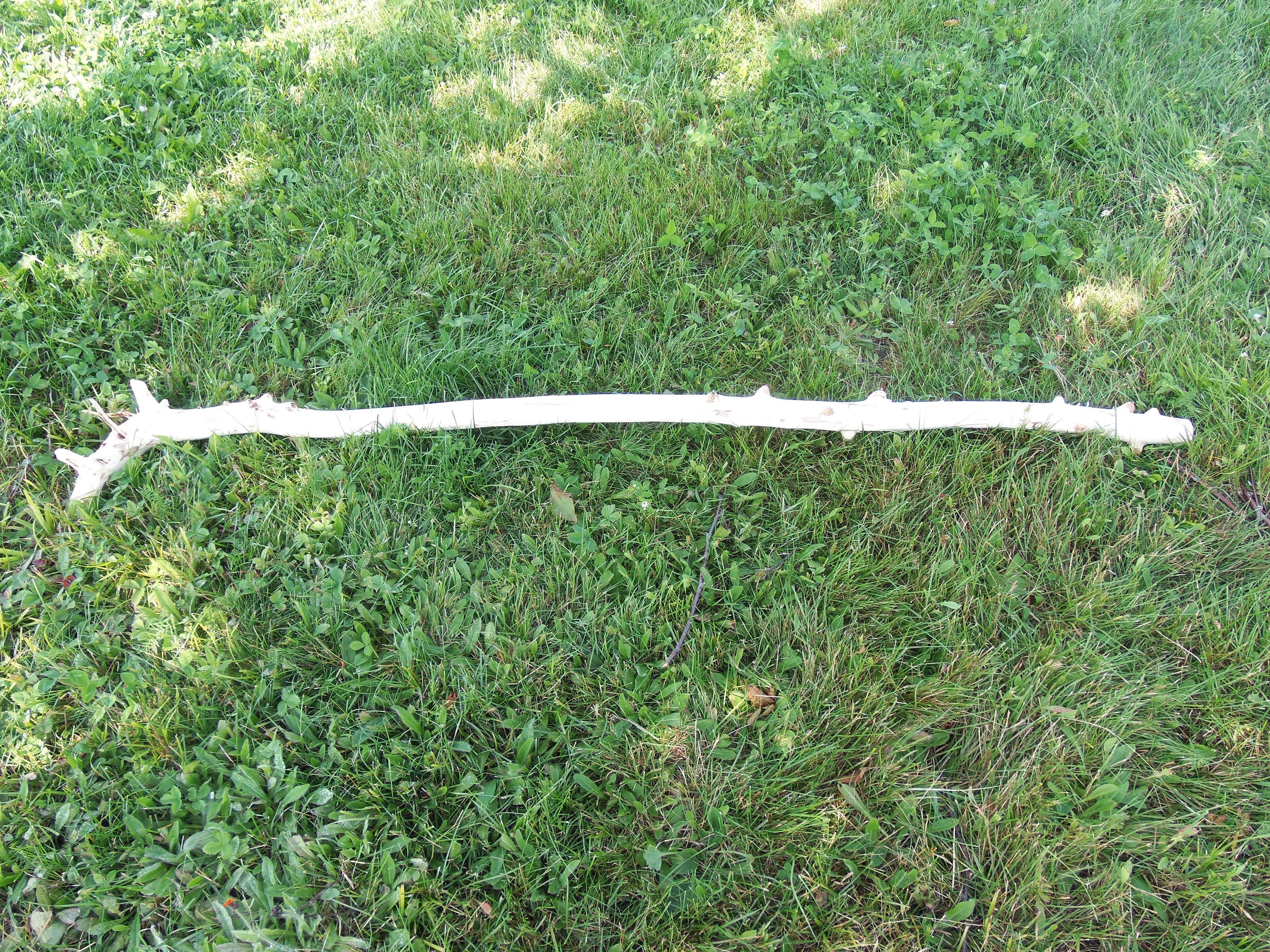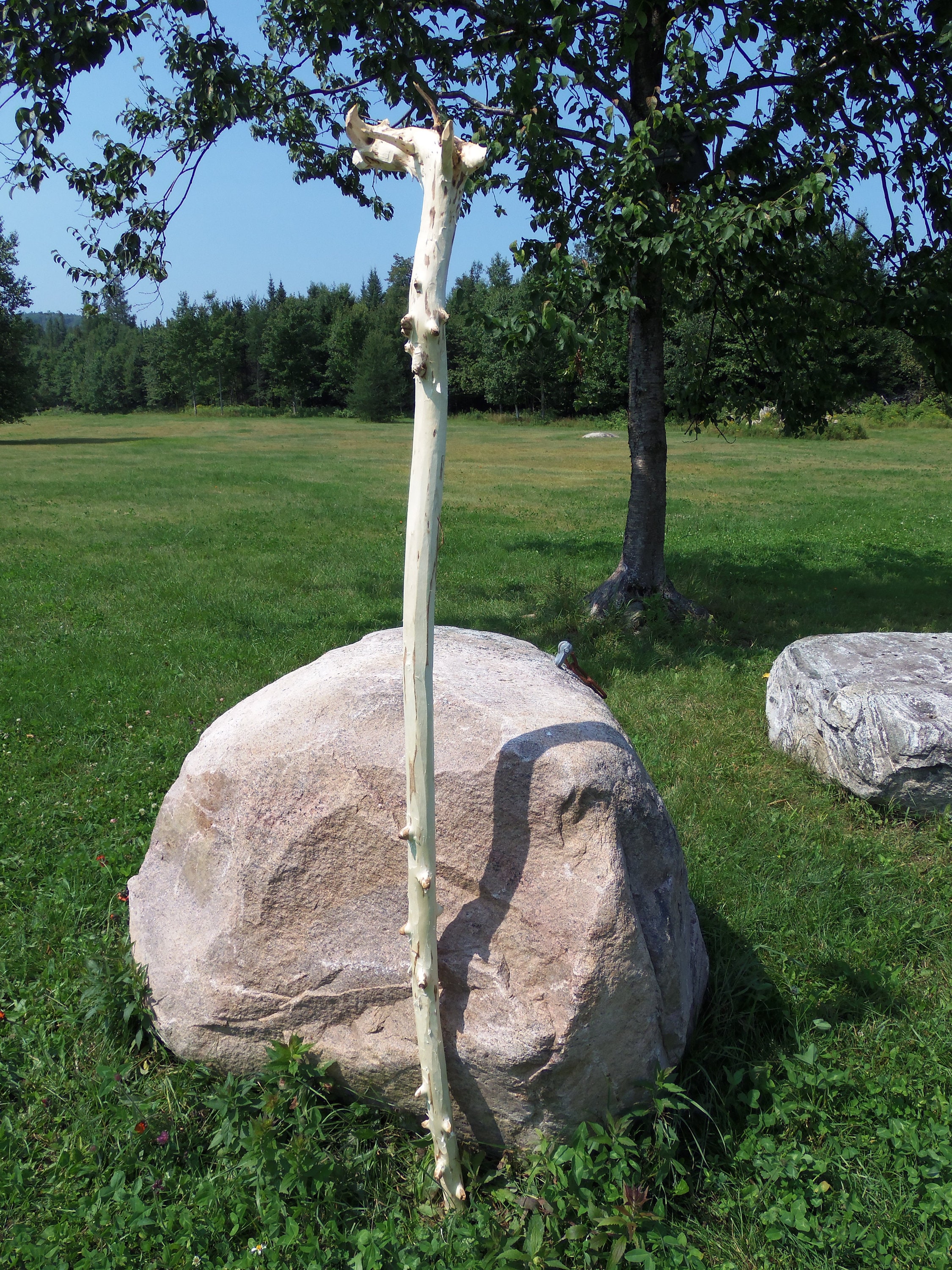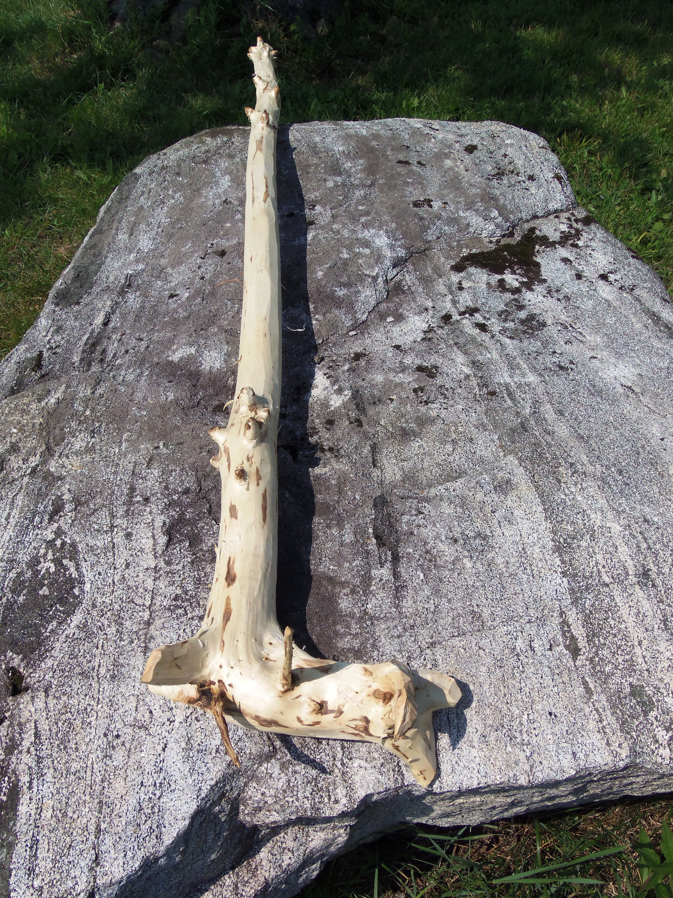 Love this one for the nubs and the simplicity. It is a poplar staff with a sparse horizontal root structure and really cool scarred over dead branch nubs. I have no clue why this species does this. The lower porrion of the staff has 13 nubs and above the grip area ther are 7 smaller nubs. It stands 71-1/2" tall and ranges in diameter from 1-1/2" to 2-1/4". The large horizontal portion has five stubby roots that have shaved nearly off due the shipping constraints as well as two small roots. Poplar absorbs wood stain in a very monotone, deep color. It would probably be excellent for watercolor as well. This was harvested,peeled and dried. It weighs 3#11.4ozs. (ufws104)