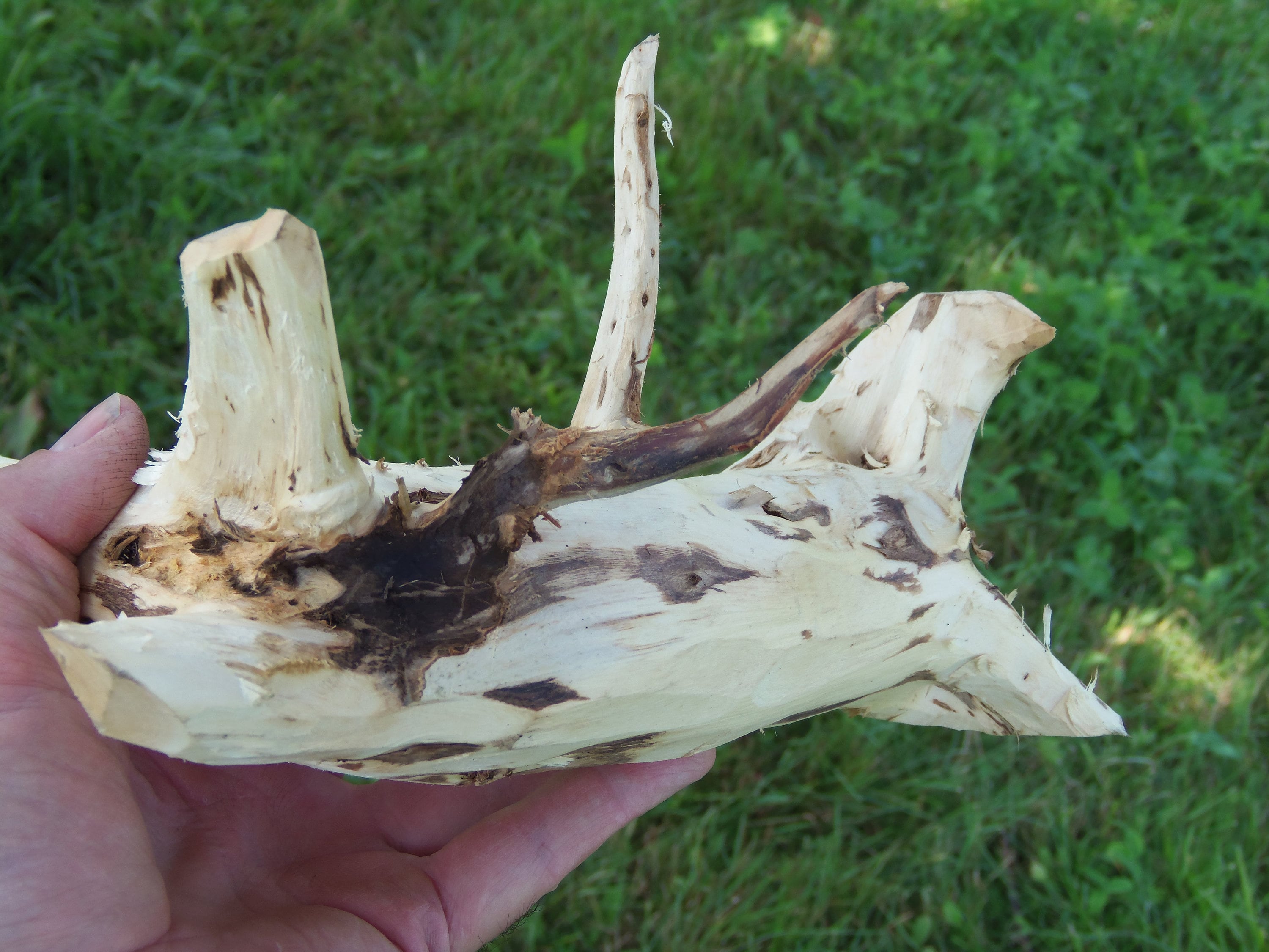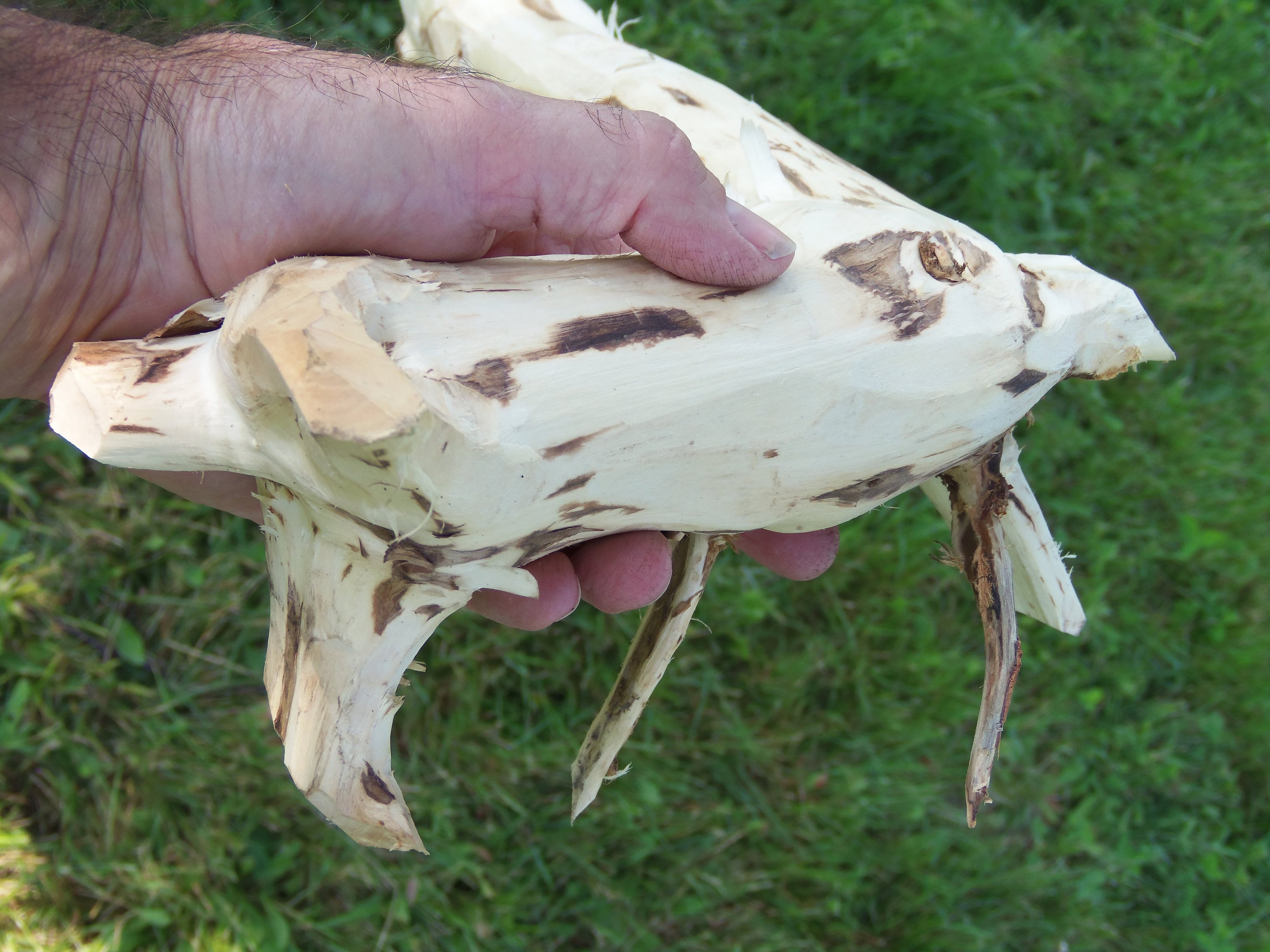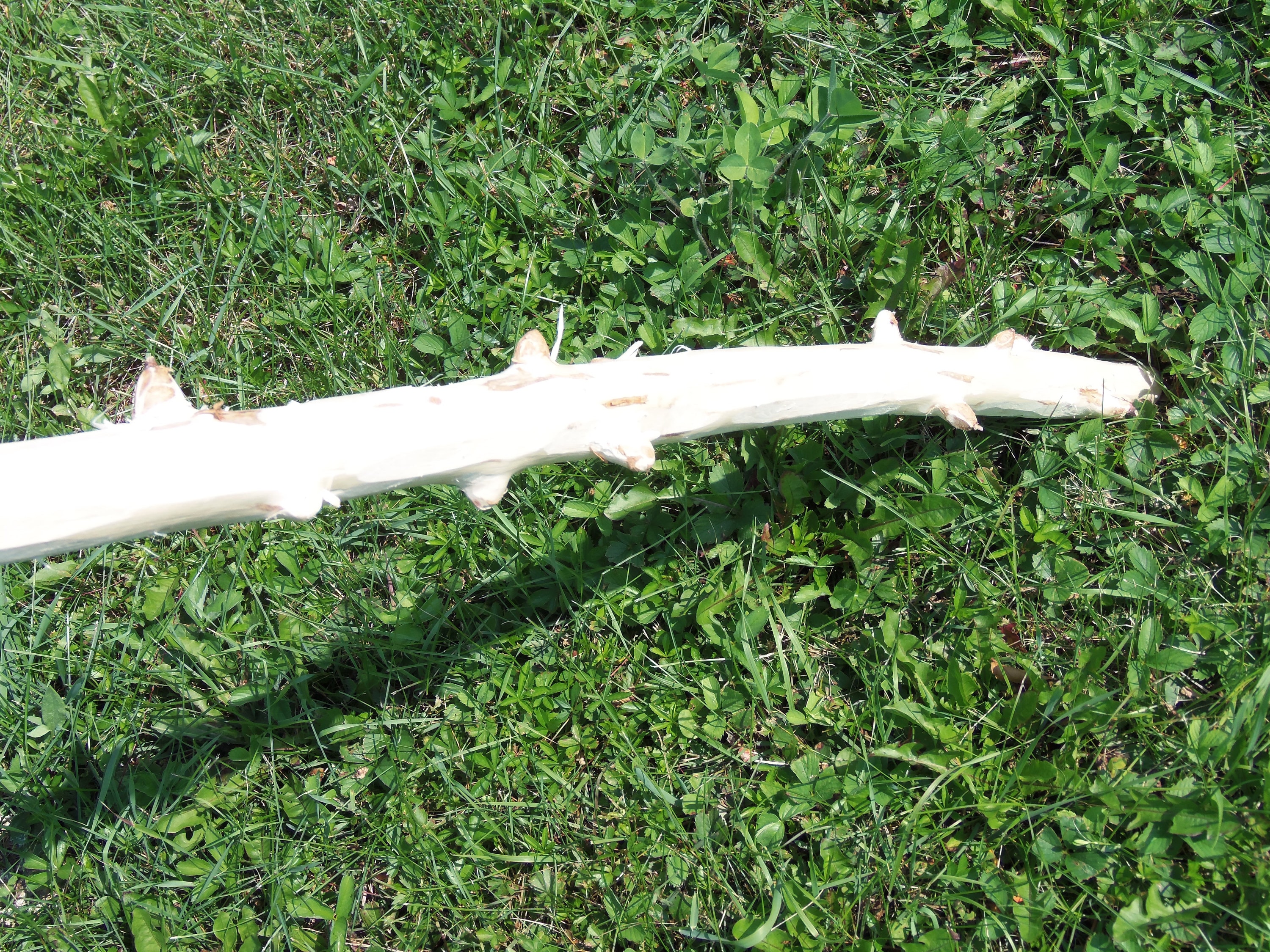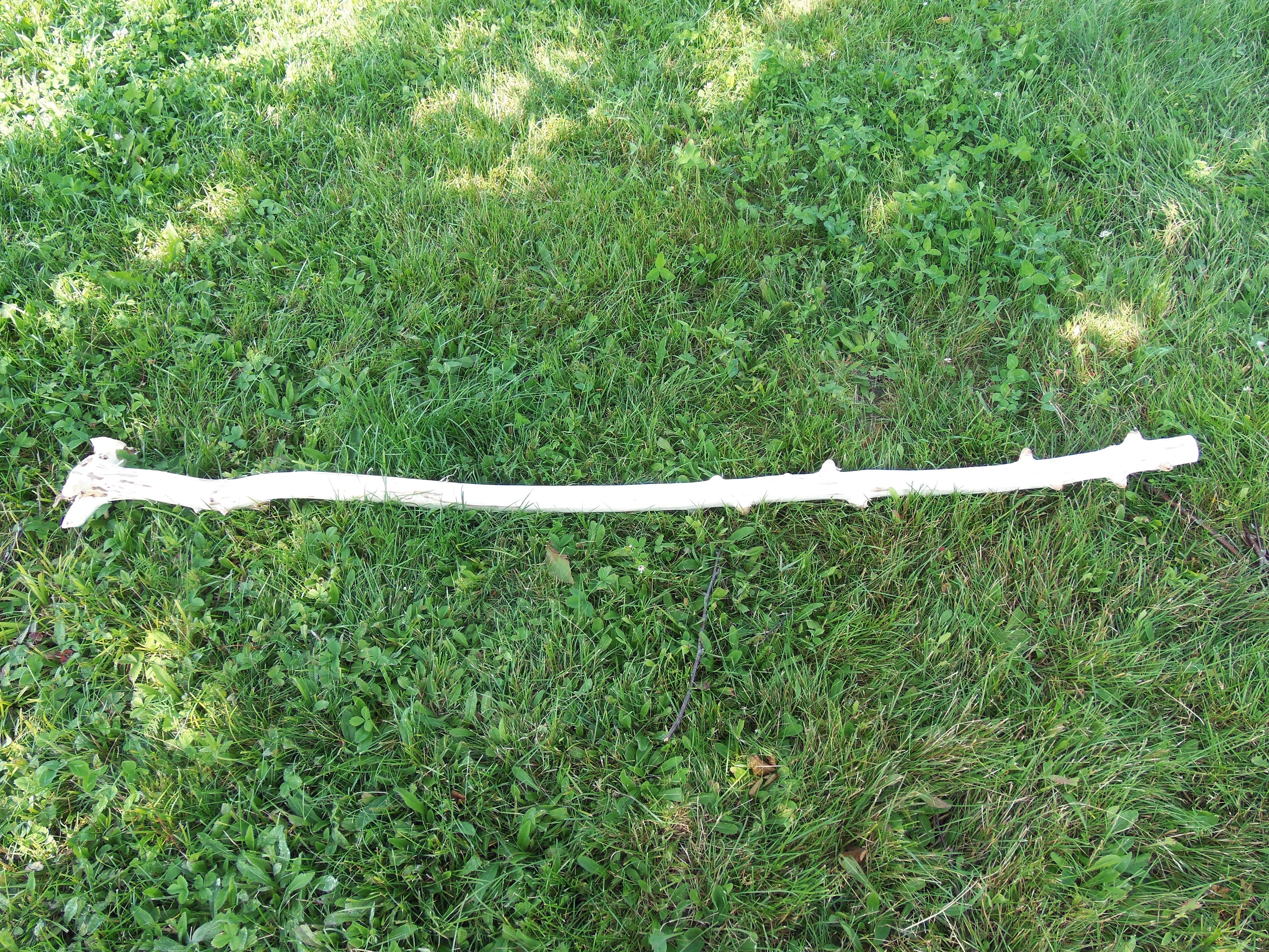 Love this one for the nubs and the simplicity. It is a poplar staff with a sparse horizontal root structure and really cool scarred over dead branch nubs. I have no clue why this species does this. The lower porrion of the staff has 13 nubs and above the grip area ther are 7 smaller nubs. It stands 71-1/2" tall and ranges in diameter from 1-1/2" to 2-1/4". The large horizontal portion has five stubby roots that have shaved nearly off due the shipping constraints as well as two small roots. Poplar absorbs wood stain in a very monotone, deep color. It would probably be excellent for watercolor as well. This was harvested,peeled and dried. It weighs 3#11.4ozs. (ufws104)