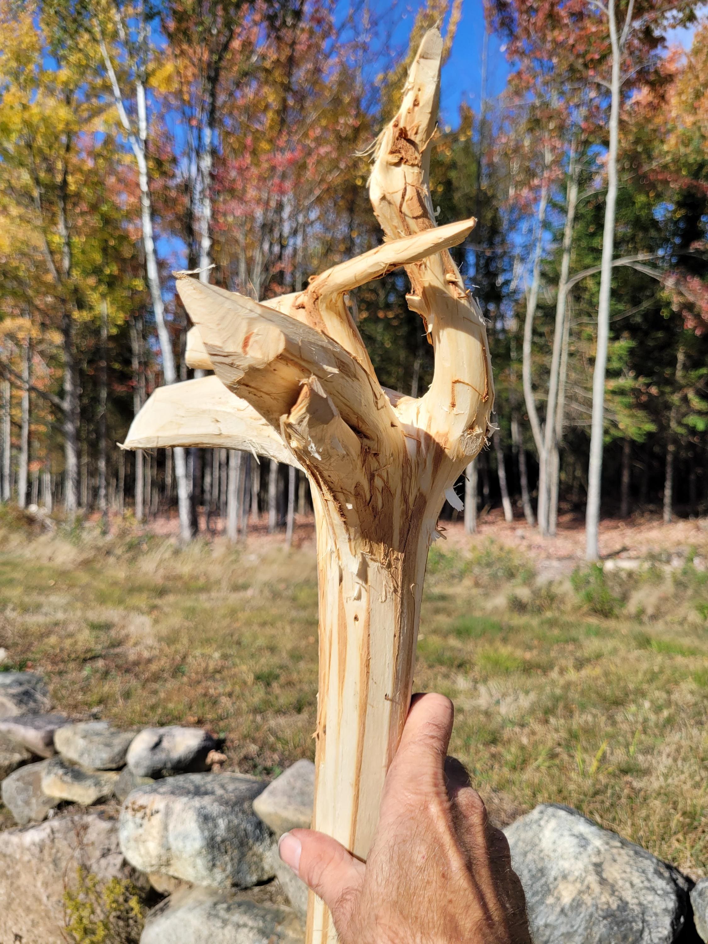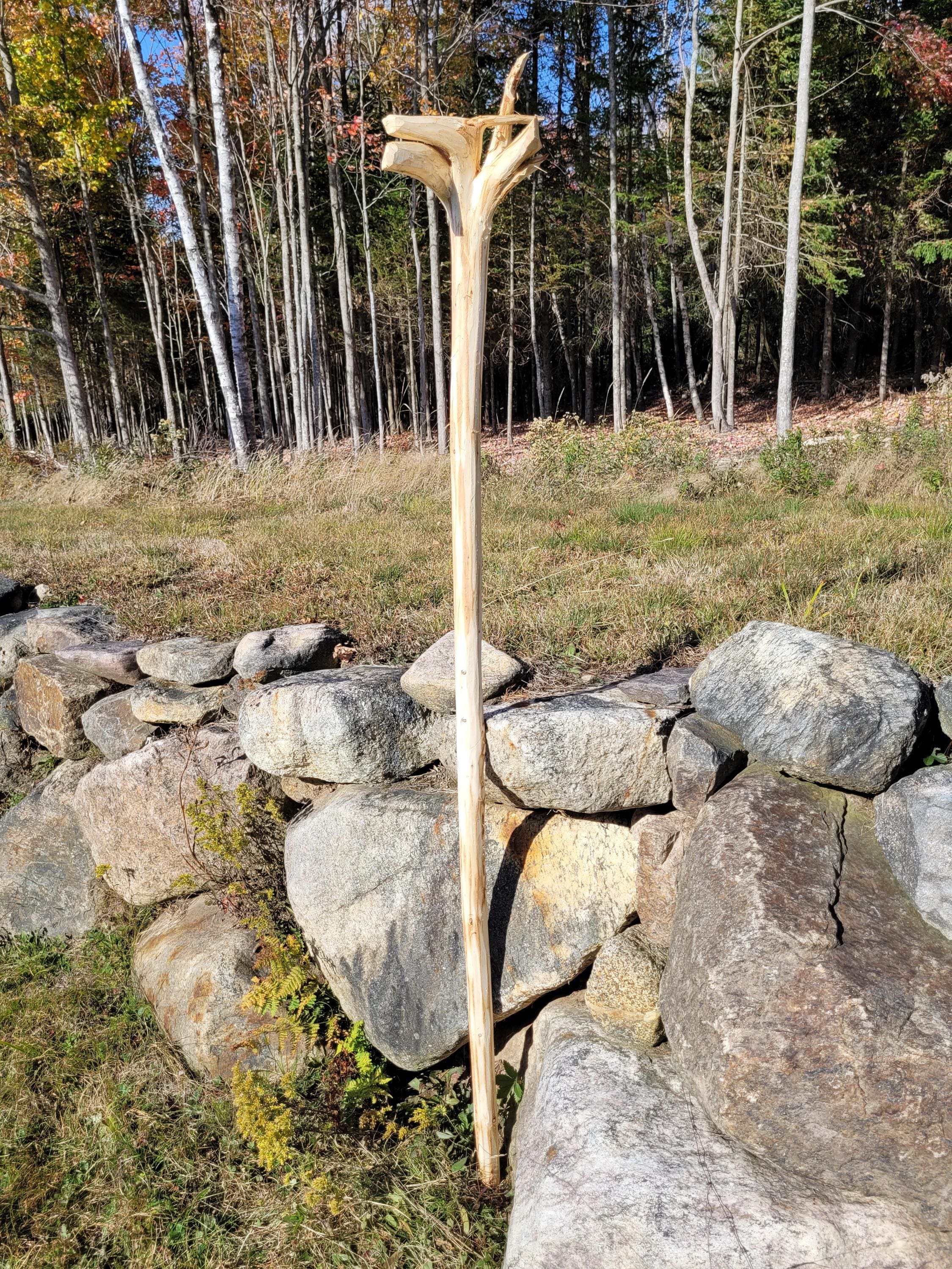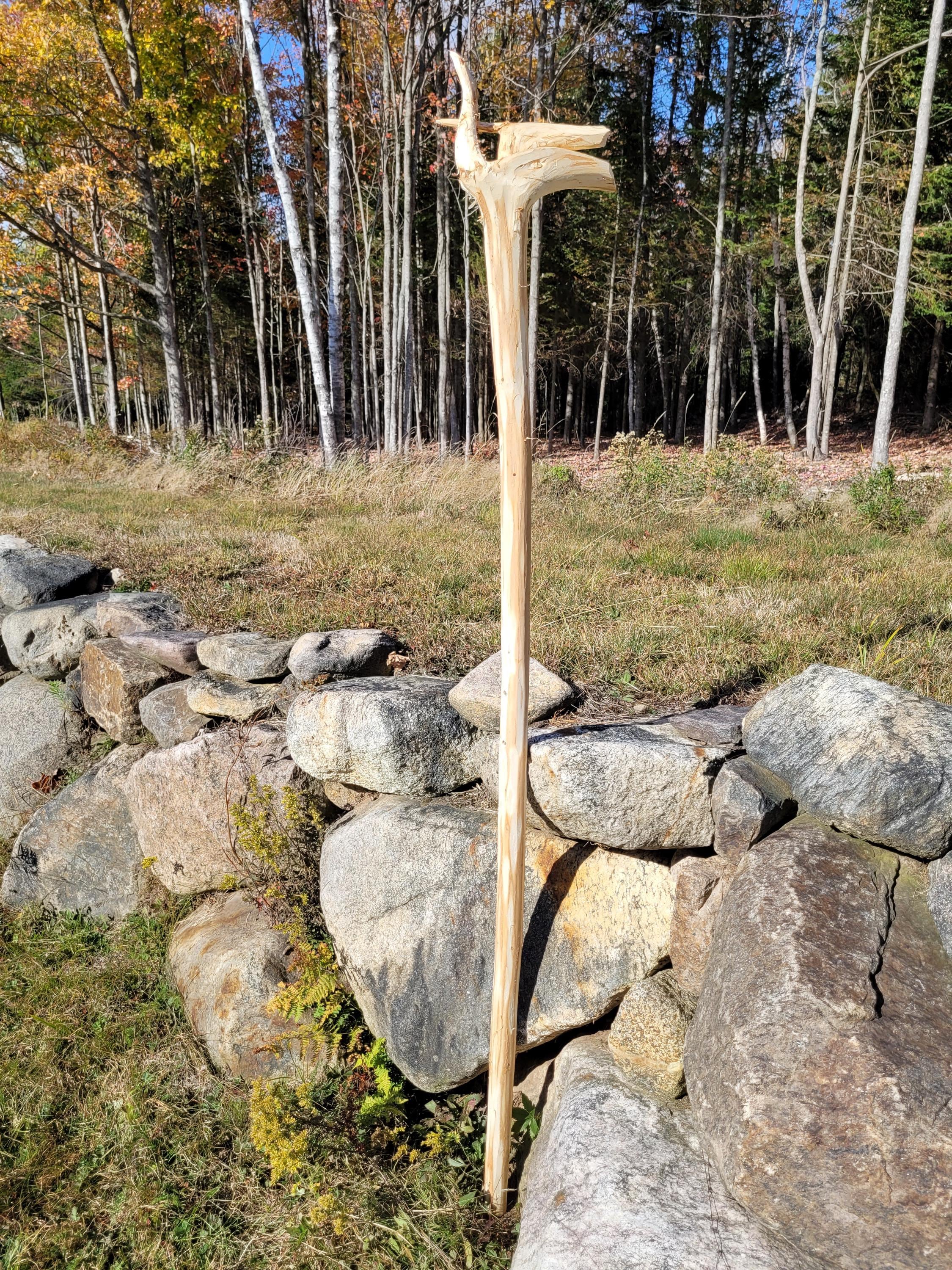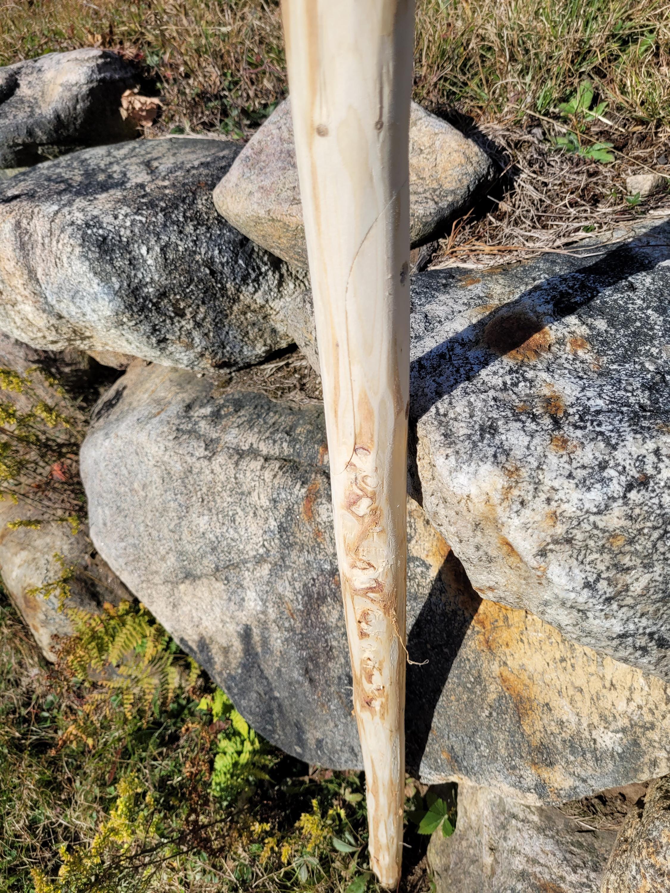Here is another jointed staff to make shipping much cheaper. It will ship in a 40" x 8" x 8" box and when assembled with the included hardware it stands 70-1/2" tall. The specie on this one is Balsam Fir and currently it weighs 3#2ozs. It will lose more moisture weight. The shaft on this one is a comfortable size and it varies in diameter from 1-1/2" up to 2". It is relatively straight and the bark was stripped with a drawknife, hence it has the hand-hewn look. This is a raw material, use it as is or deck it out as you desire. (ufws324)