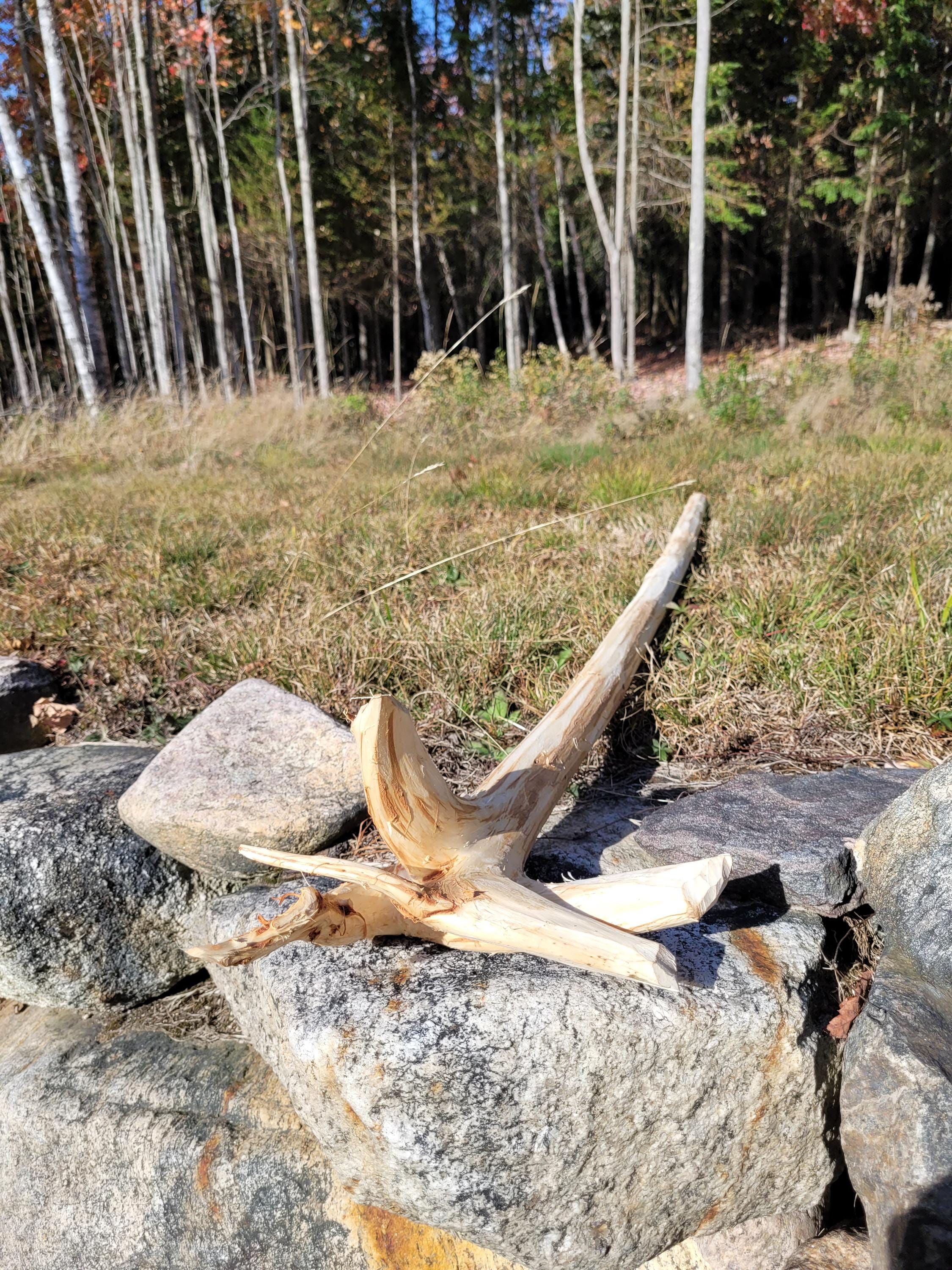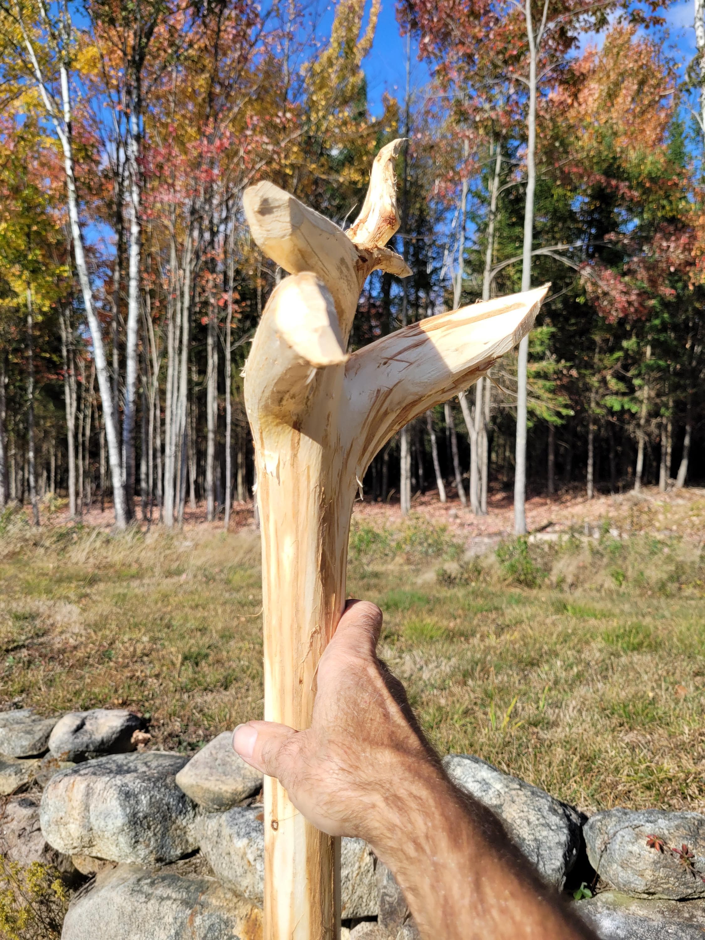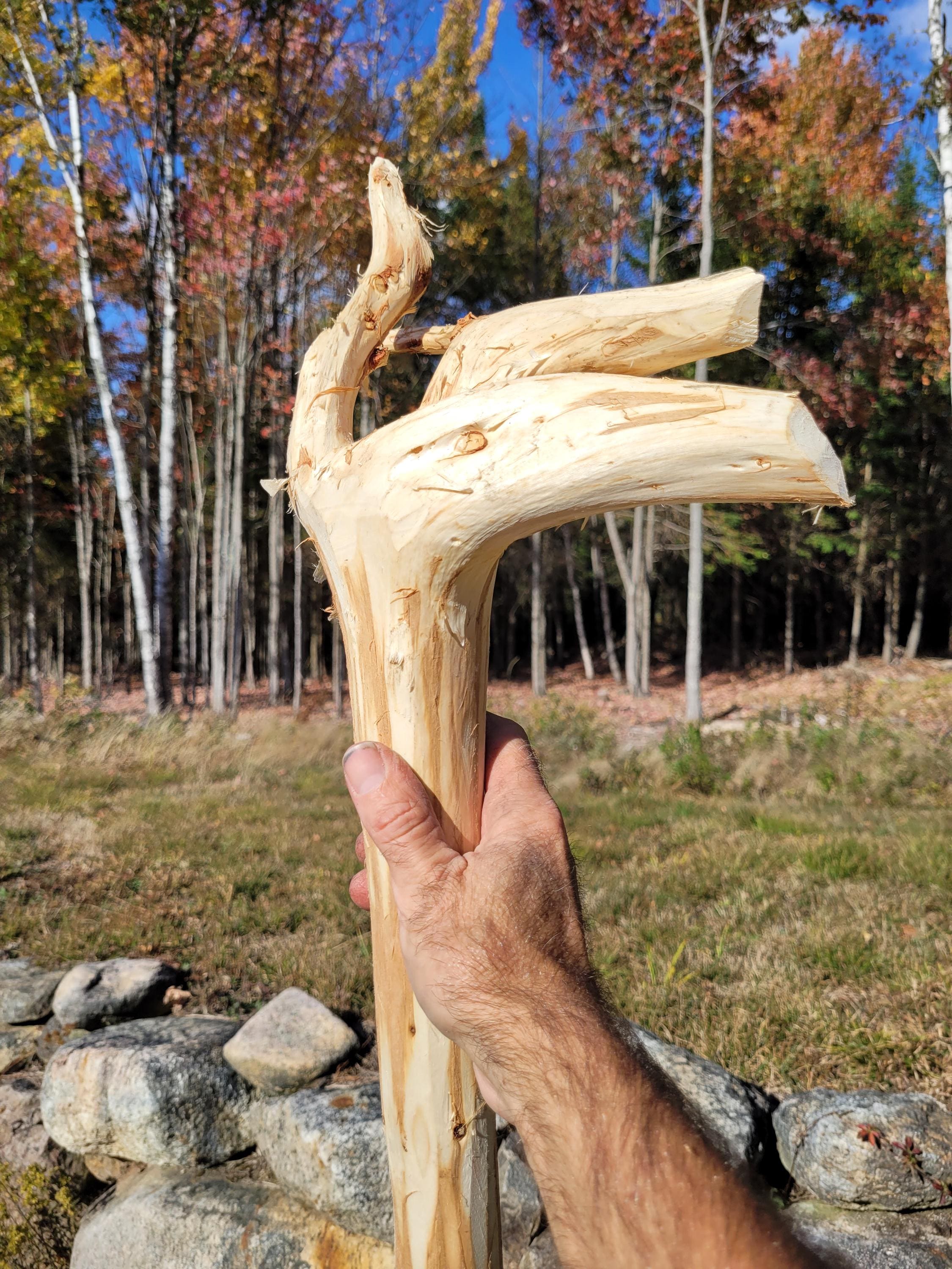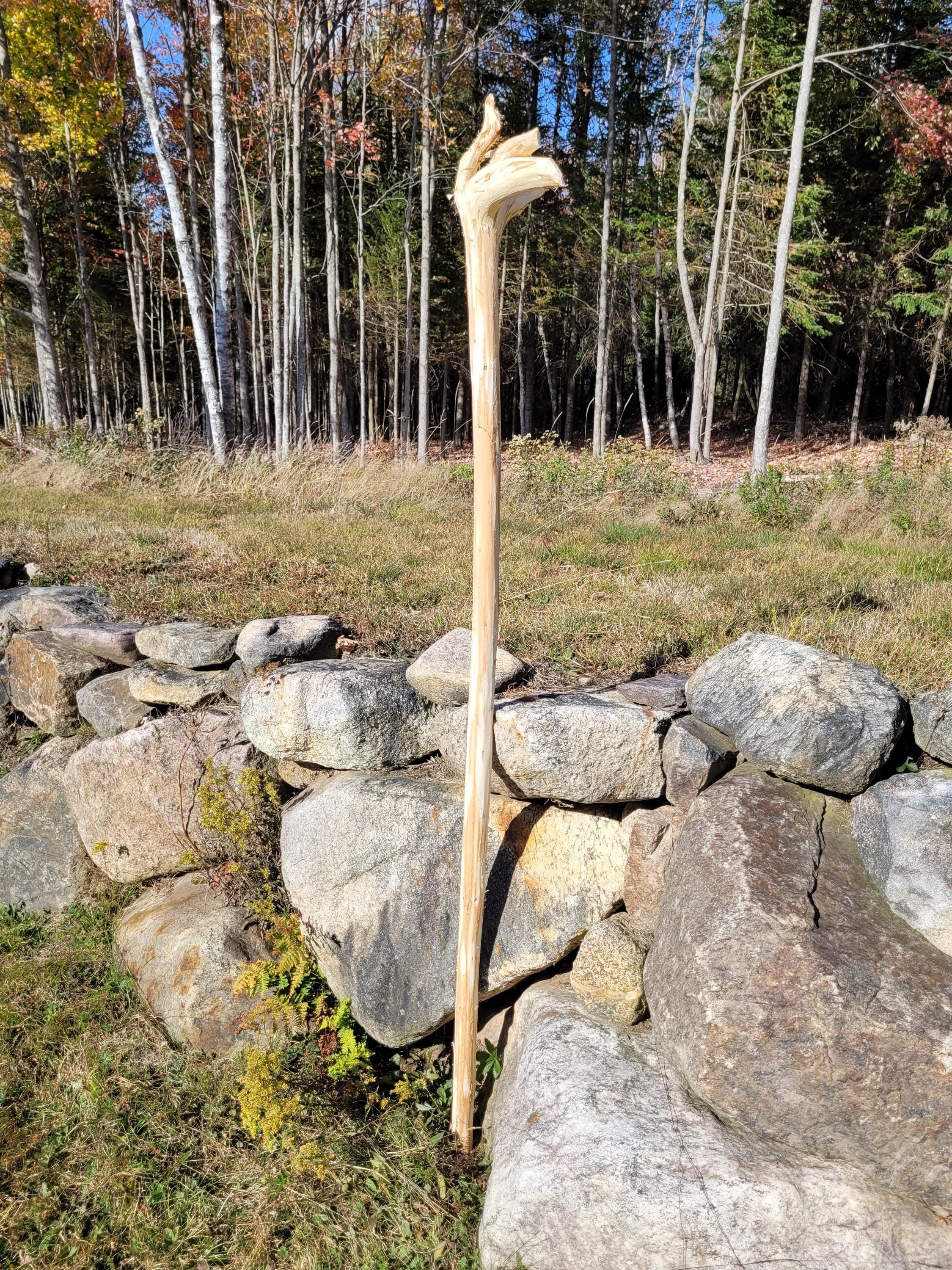 Here is another jointed staff to make shipping much cheaper. It will ship in a 40" x 8" x 8" box and when assembled with the included hardware it stands 70-1/2" tall. The specie on this one is Balsam Fir and currently it weighs 3#2ozs. It will lose more moisture weight. The shaft on this one is a comfortable size and it varies in diameter from 1-1/2" up to 2". It is relatively straight and the bark was stripped with a drawknife, hence it has the hand-hewn look. This is a raw material, use it as is or deck it out as you desire. (ufws324)
