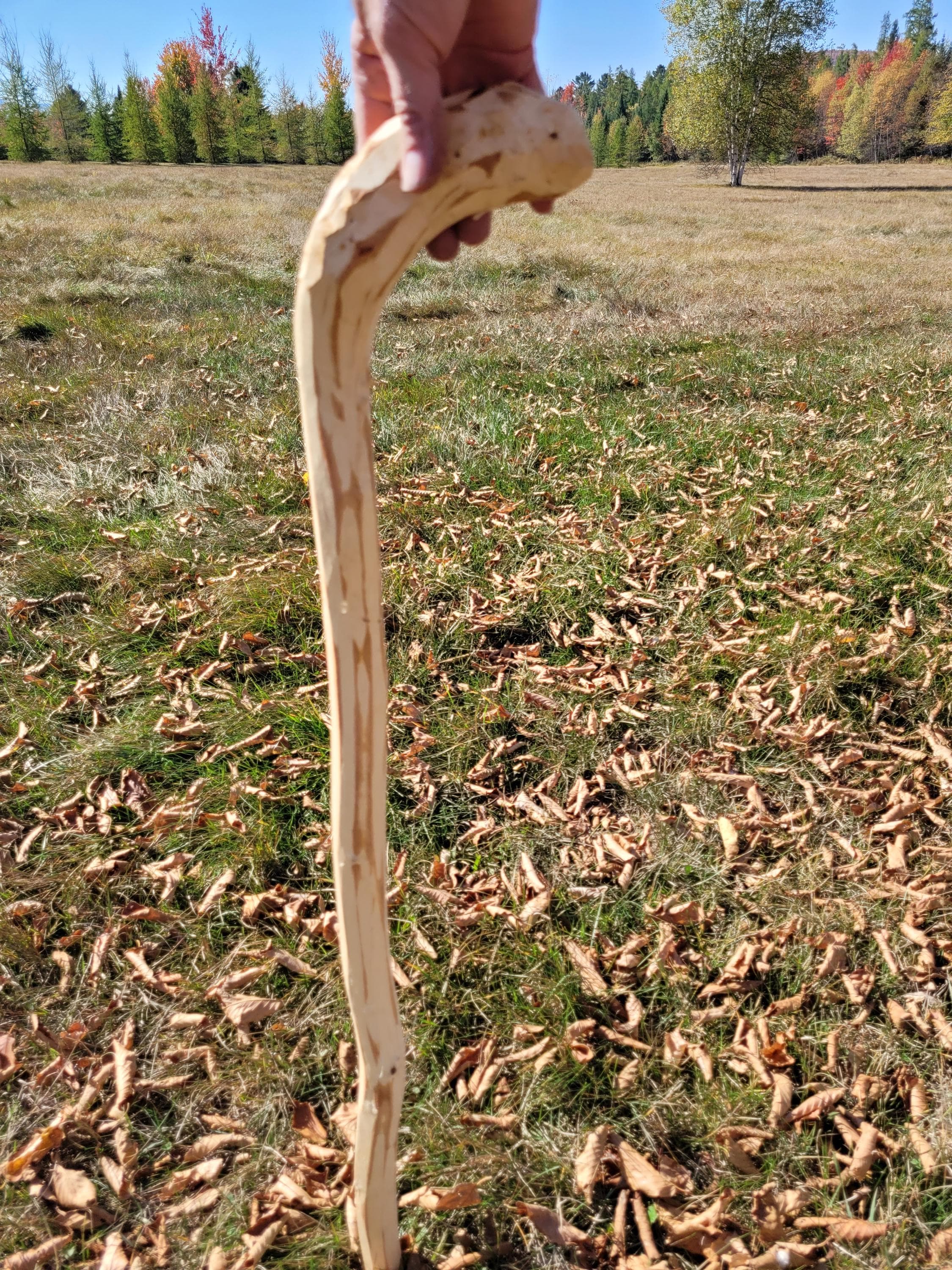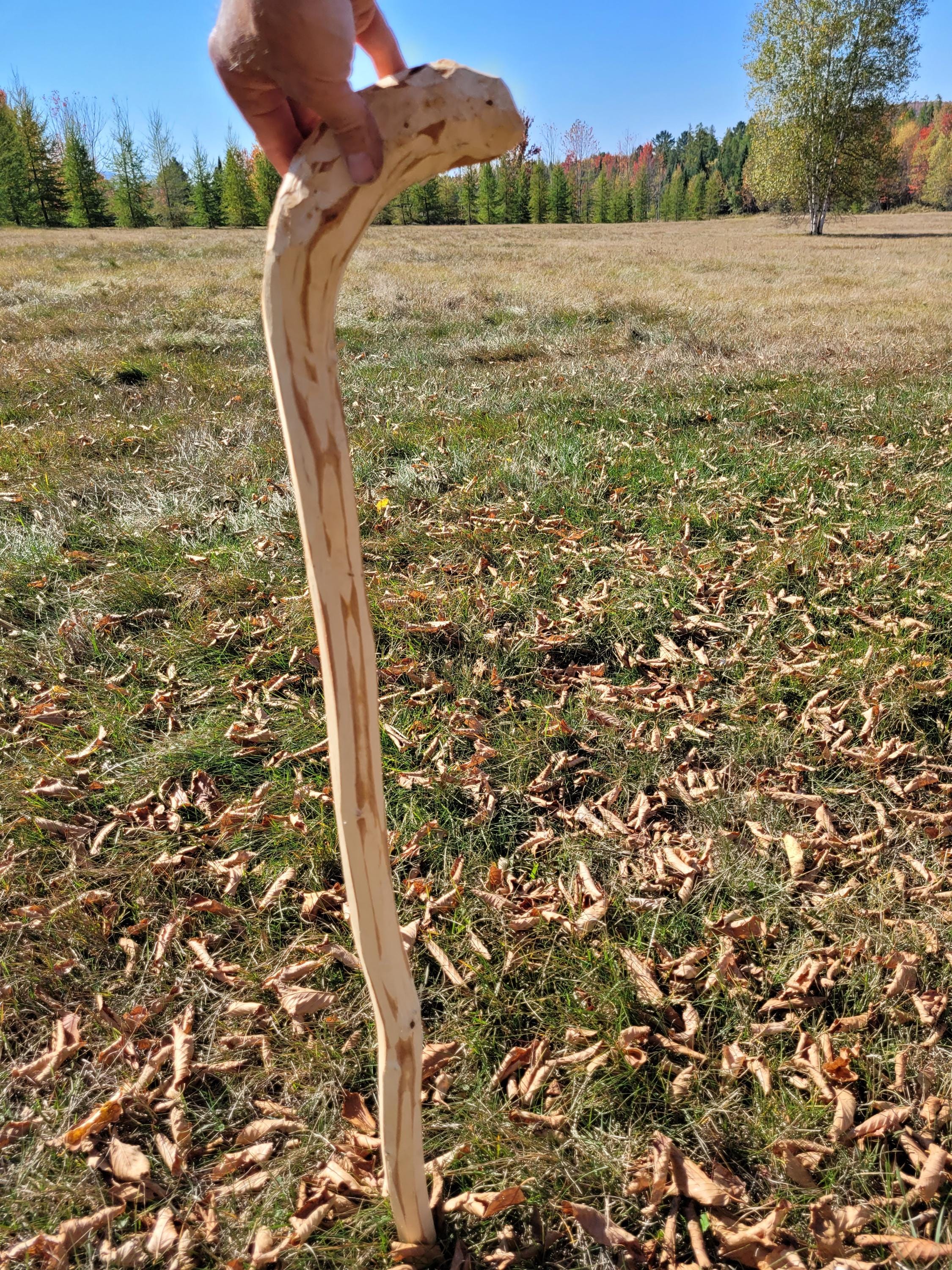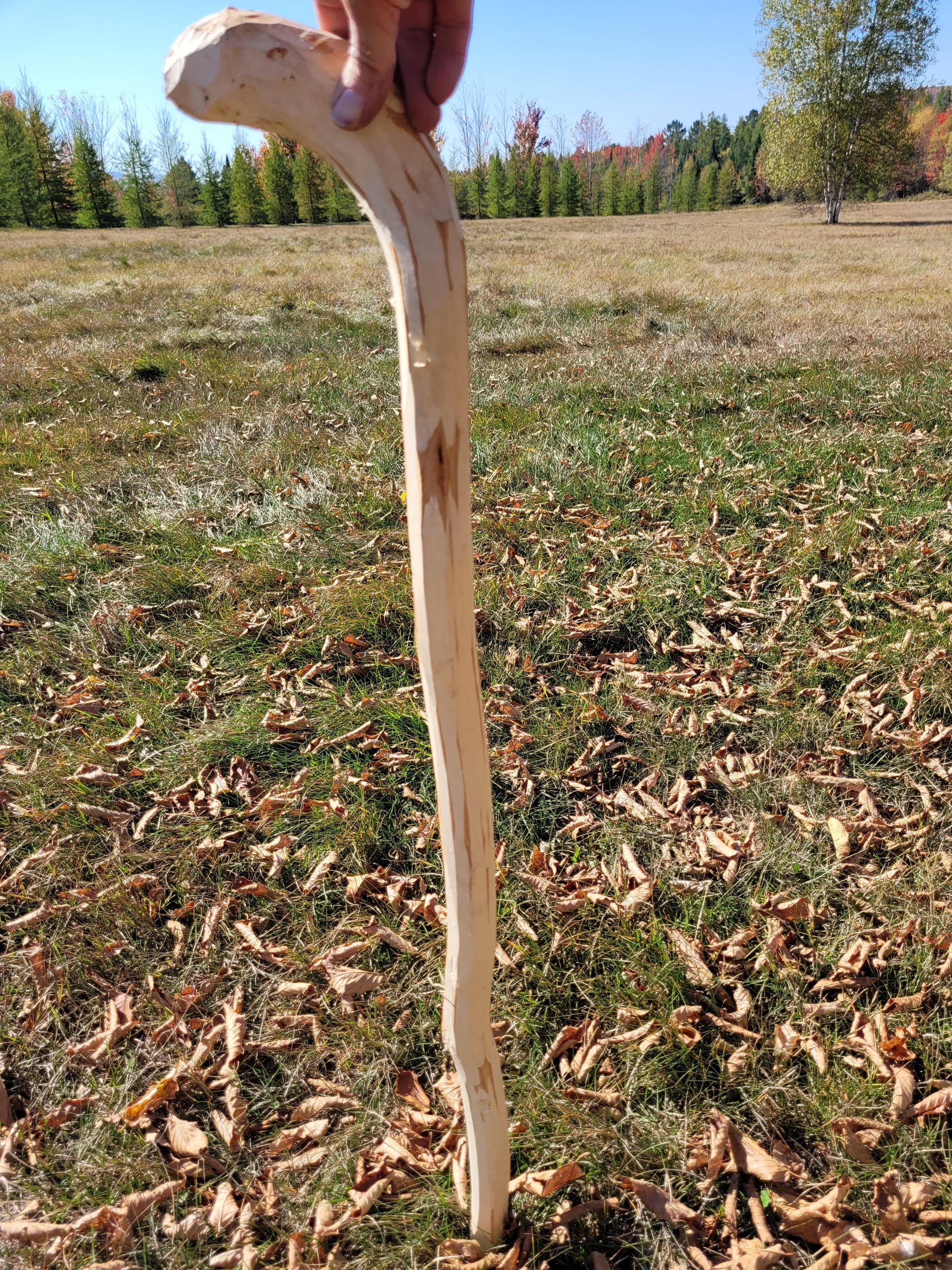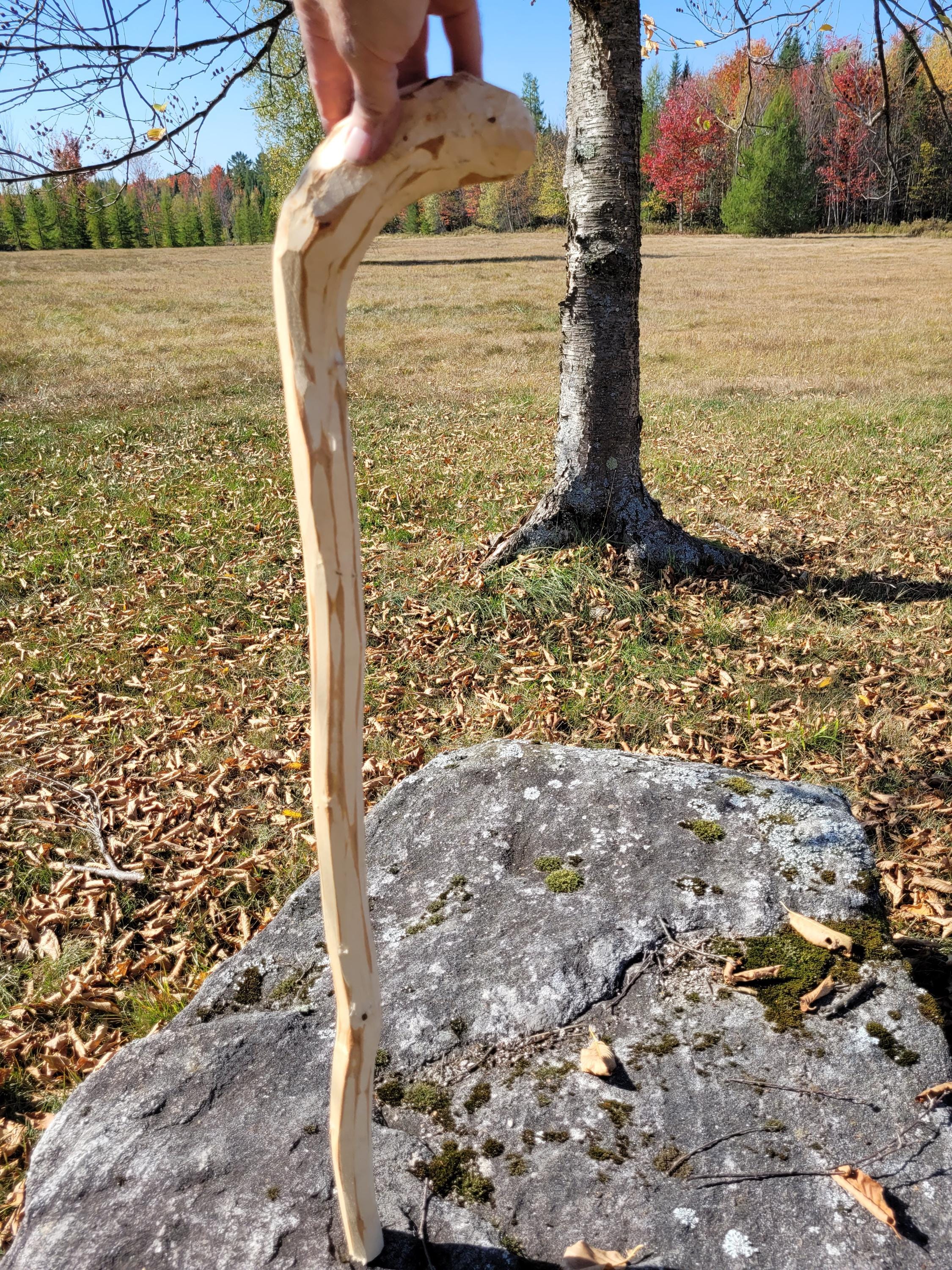 This is a nice beefy , naturally curved cane blank that stands 38" tall. Th shaft on this on varies between 1-1/4" and 1-1/2" in diameter and the grip goes up to about 2" in diameter. It would be suitable for a large hand as-is or it would be a nice carving base. The shaft is primarily straight with a few little wiggles in it. It weighs 1# 6ozs. This curved sapling was harvested and the bark was stripped with a drawknife so it is covered in subtle facets. This is a raw material that has to be finished. (uc50)