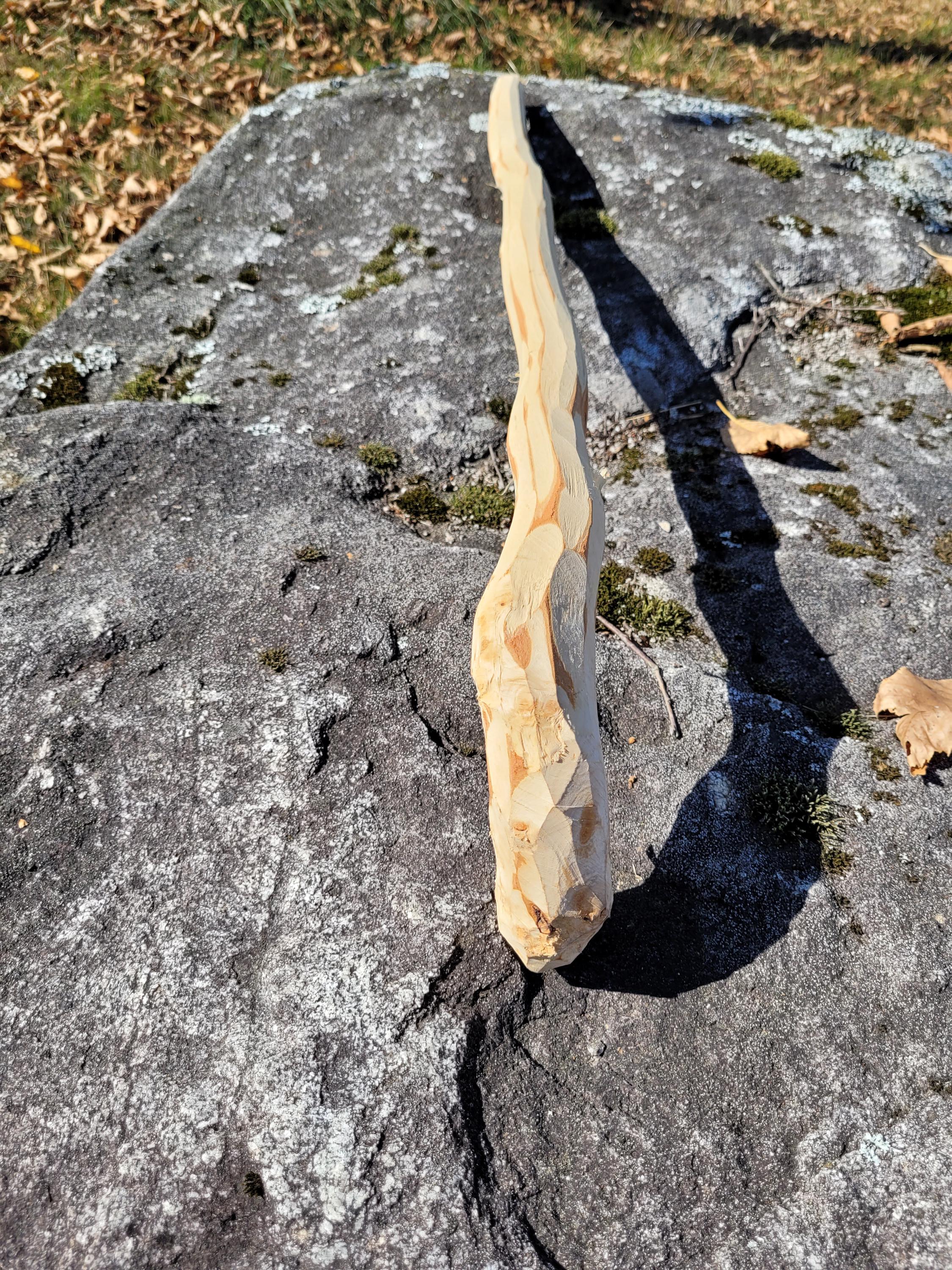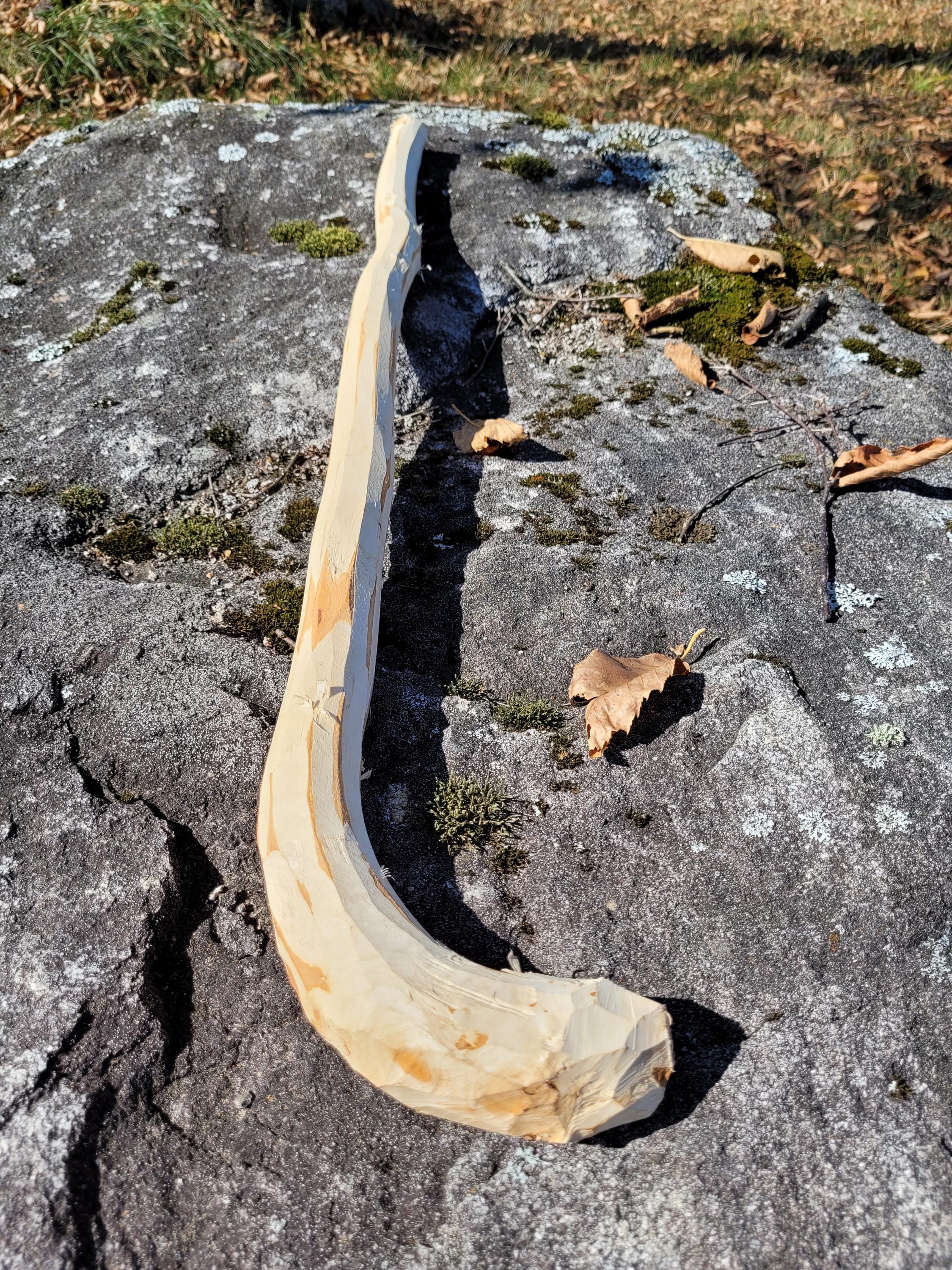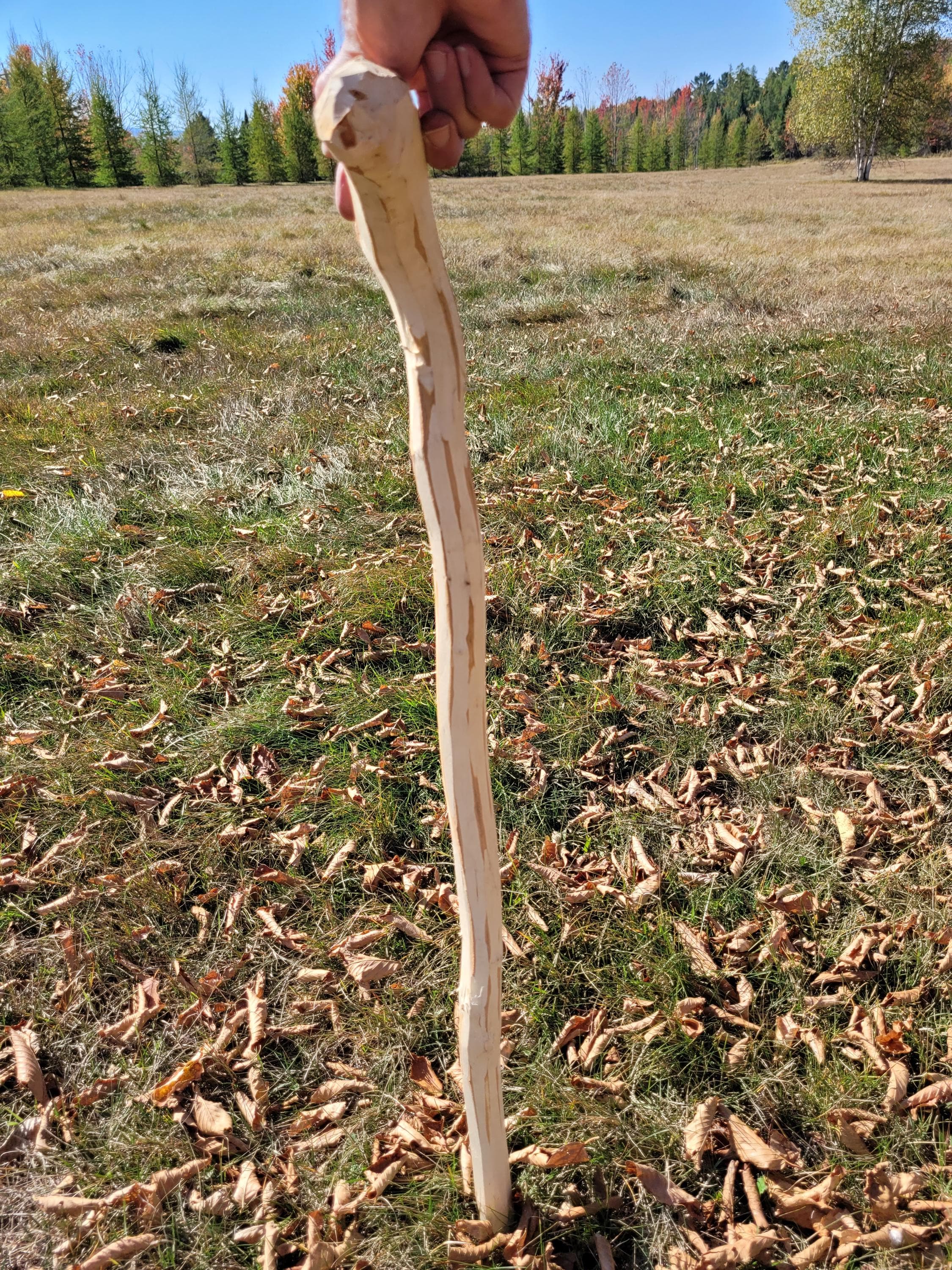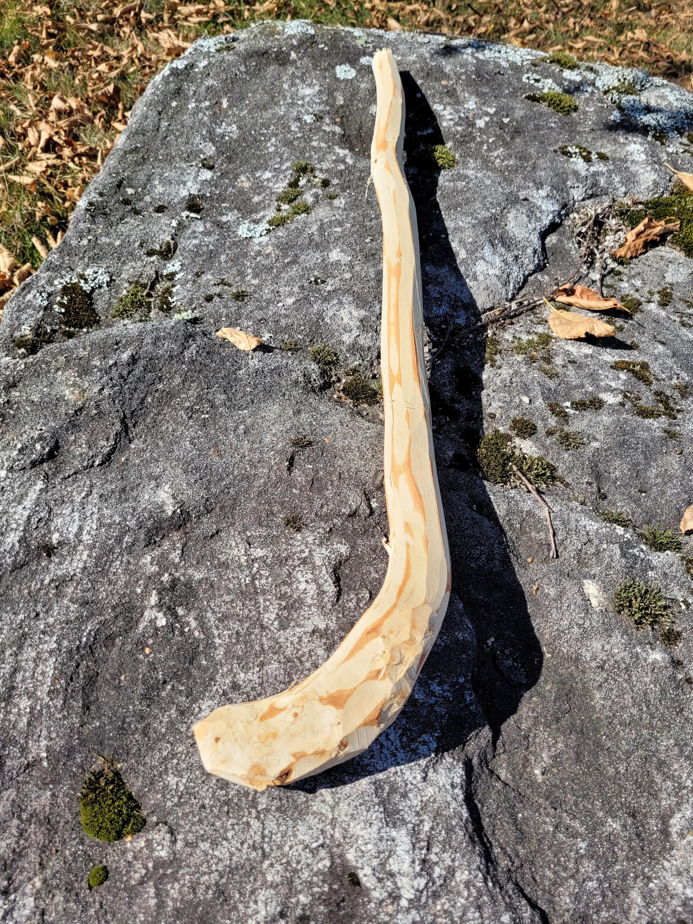 This is a nice beefy , naturally curved cane blank that stands 38" tall. Th shaft on this on varies between 1-1/4" and 1-1/2" in diameter and the grip goes up to about 2" in diameter. It would be suitable for a large hand as-is or it would be a nice carving base. The shaft is primarily straight with a few little wiggles in it. It weighs 1# 6ozs. This curved sapling was harvested and the bark was stripped with a drawknife so it is covered in subtle facets. This is a raw material that has to be finished. (uc50)