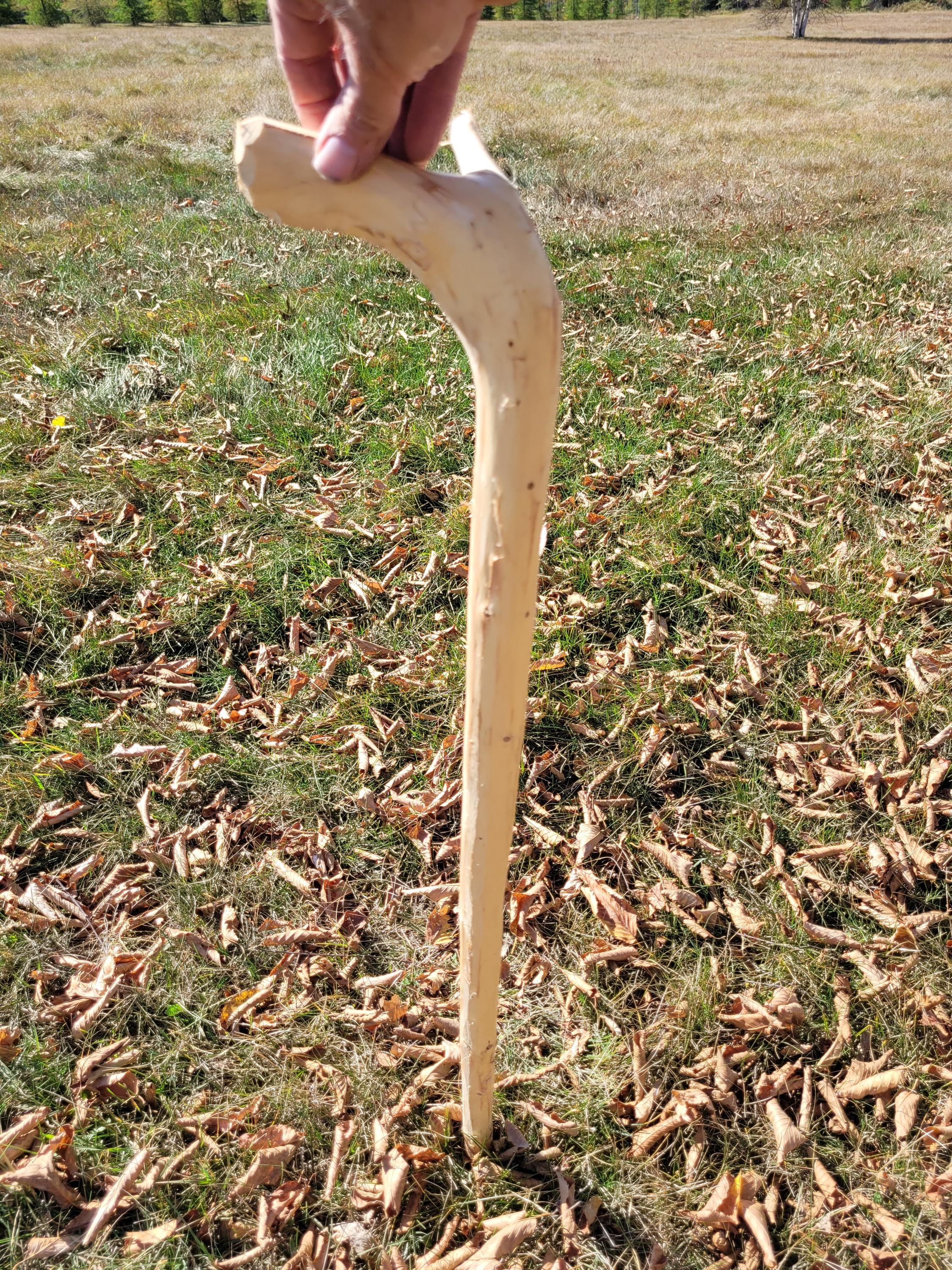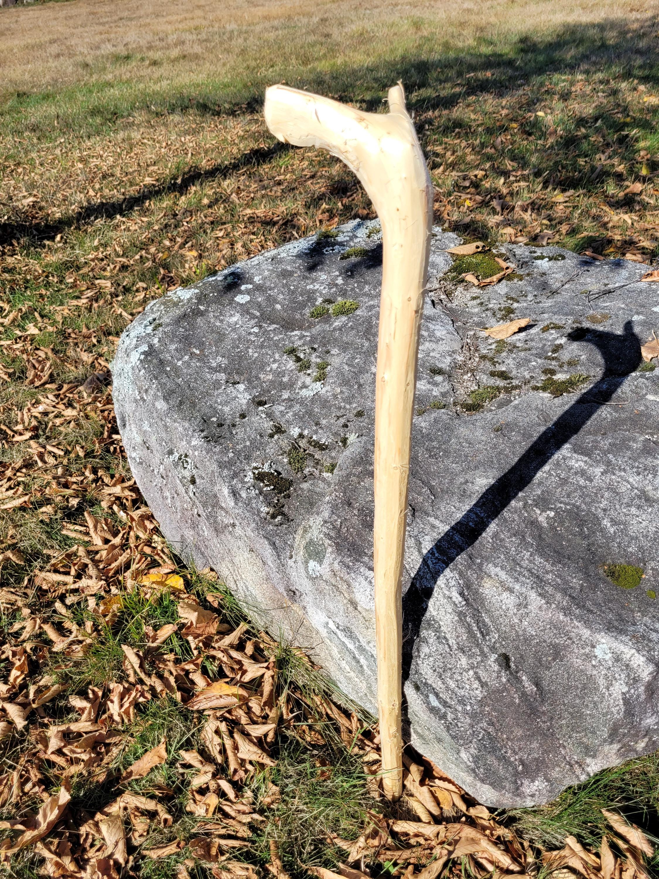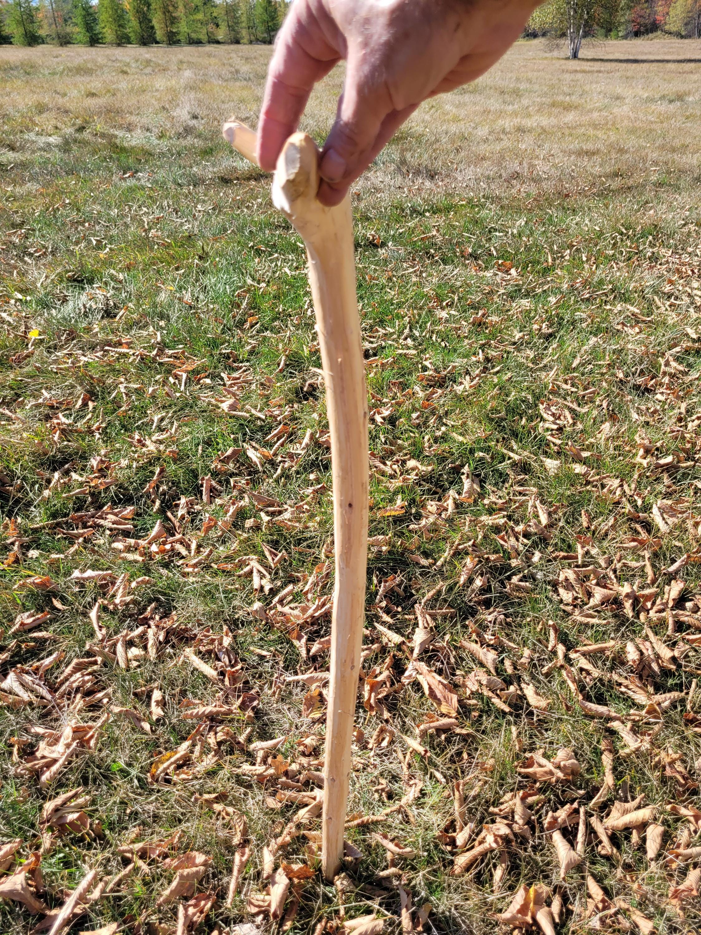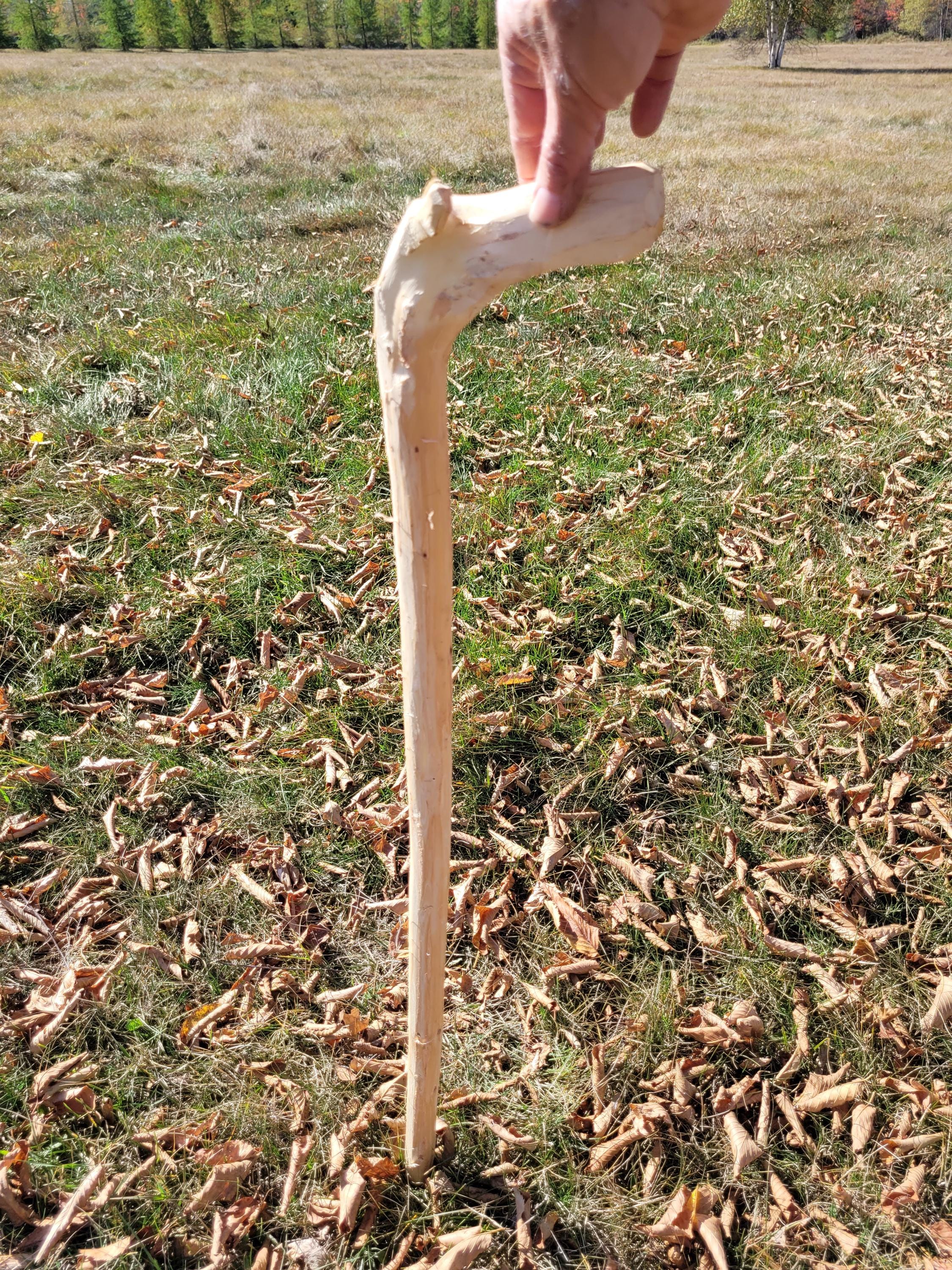 Here is a nice light (14 oz.) Balsam Fir cane blank that seems suitable for the right hand only because of the little spur off the side. It stands 37" tall as is and the entire shaft has a slight curve. The tip of this one is about 1" in diameter and the shaft goes up to about1-1/2". The grip is a little flattened oval profile more suitable for a smaller hand. This was harvested and the bark was stripped with a drawknife so there are tooling marks. It is a raw material and nothing else has been done to it.(uc52)