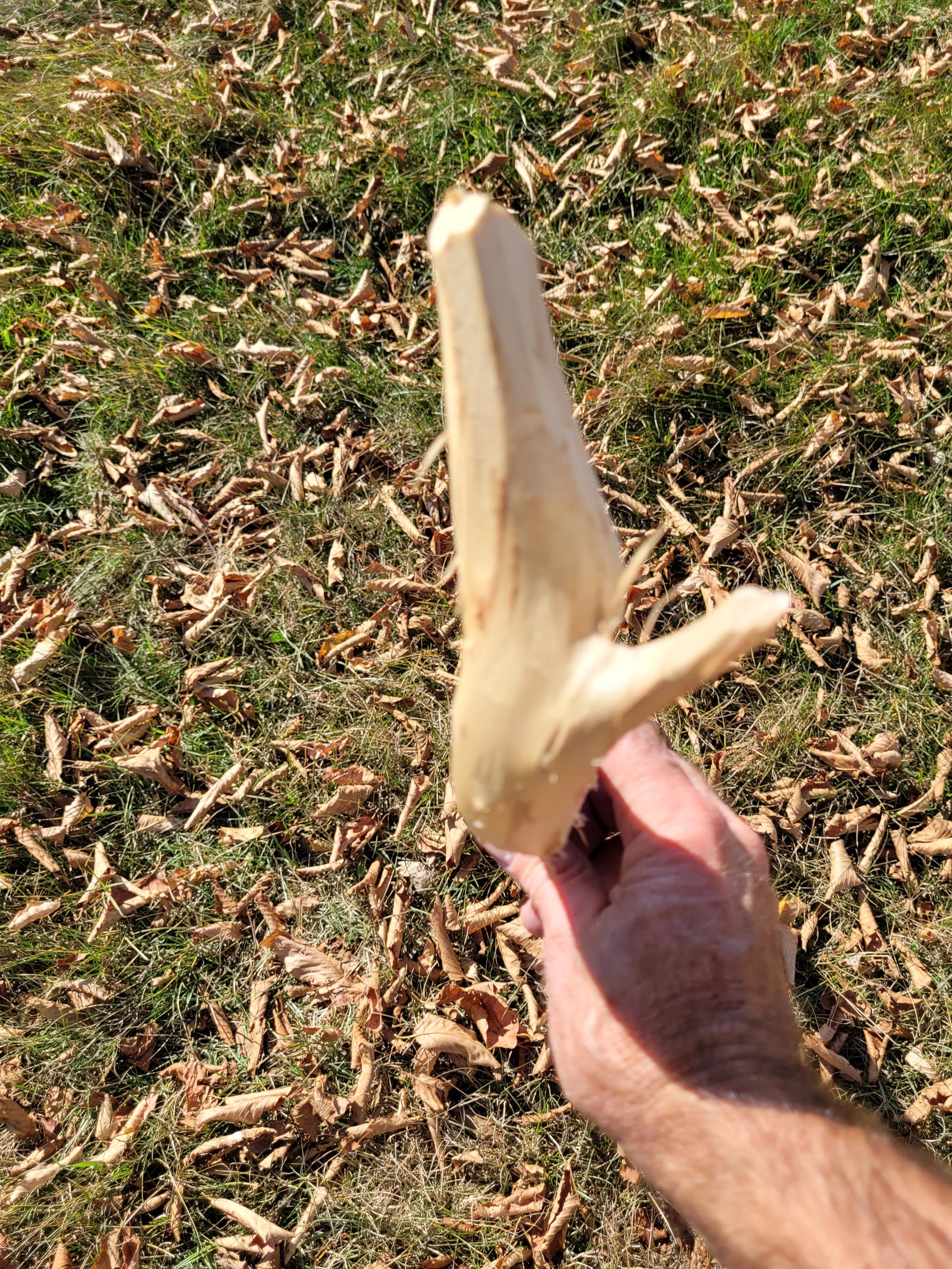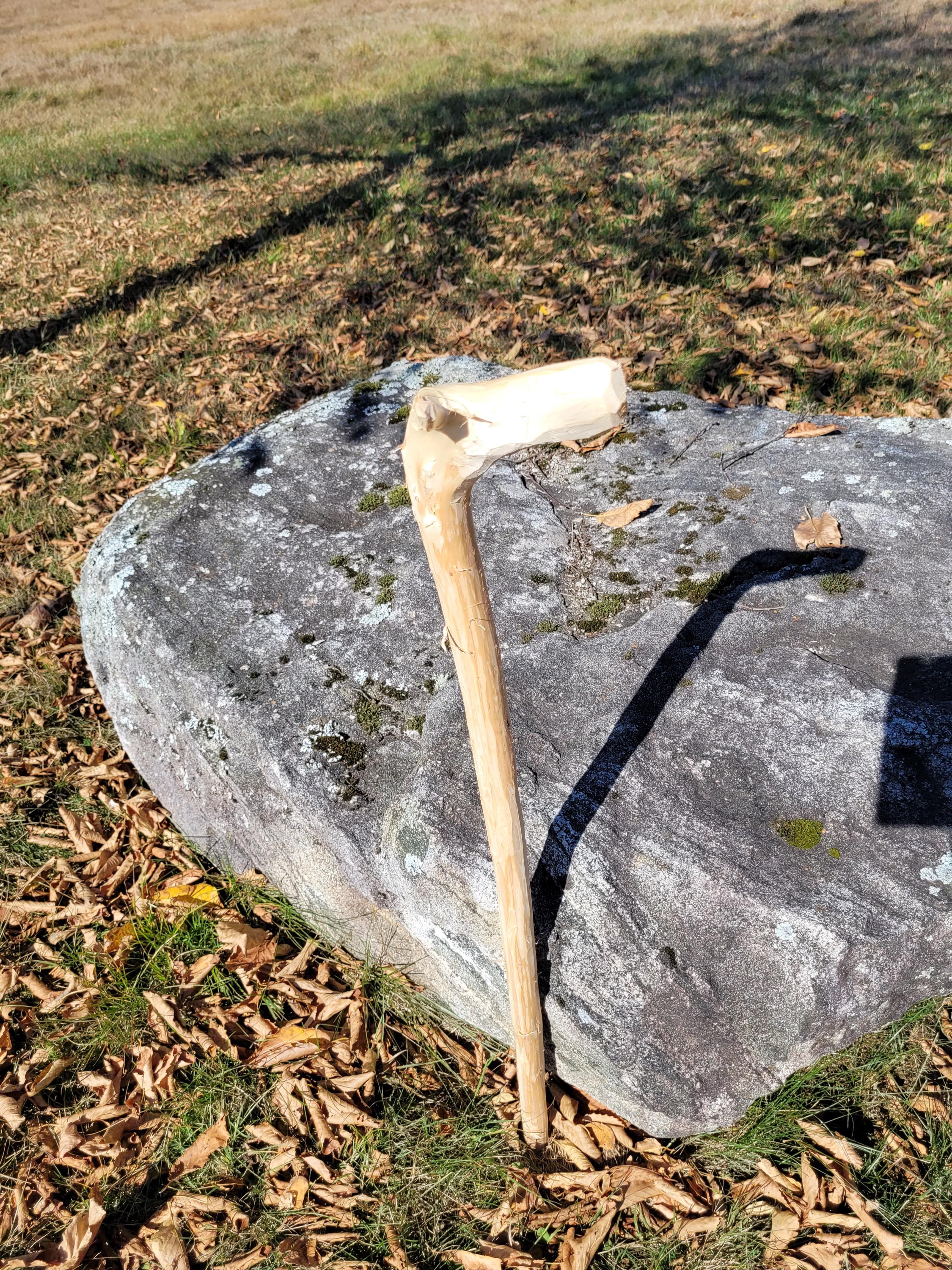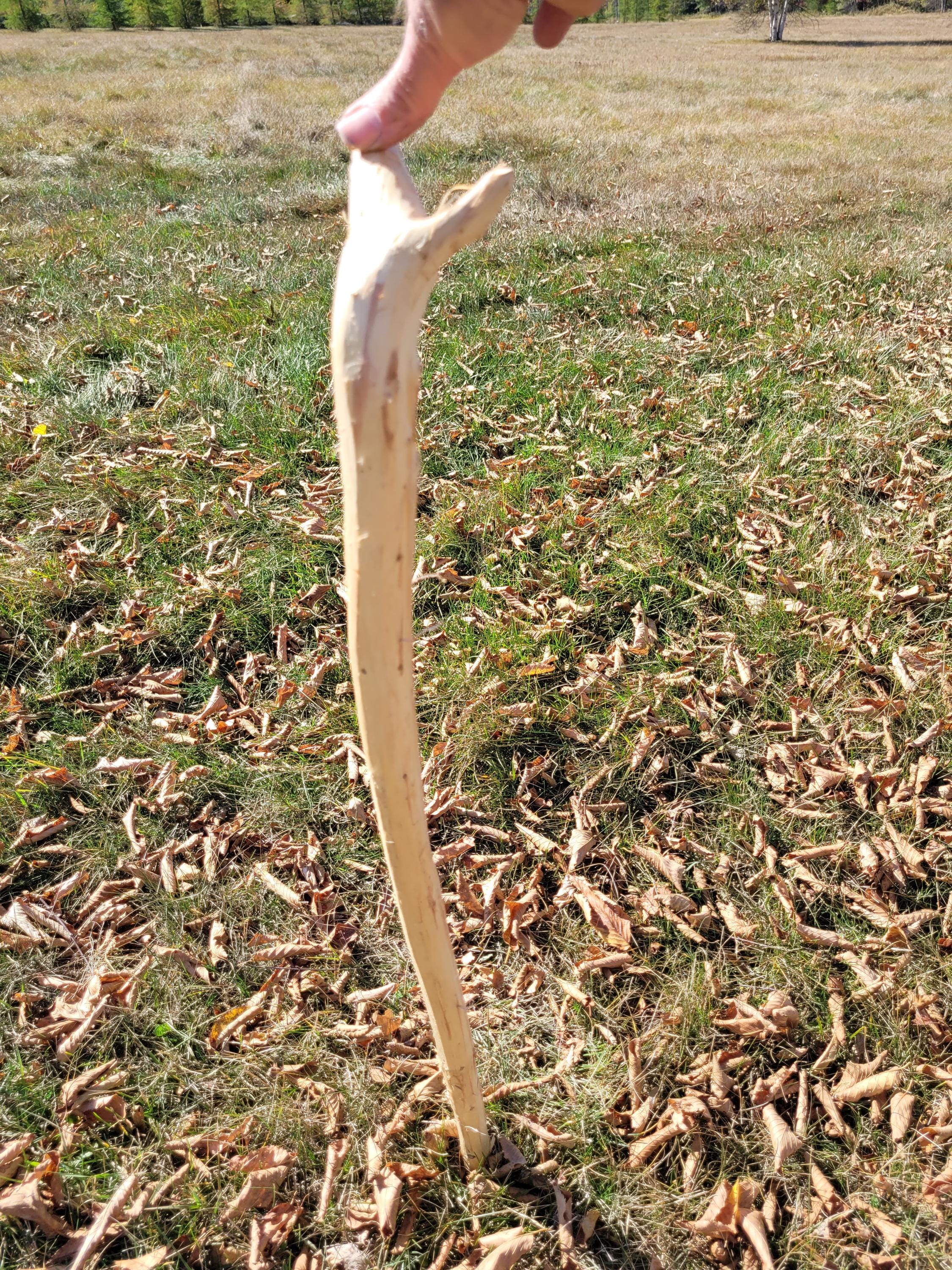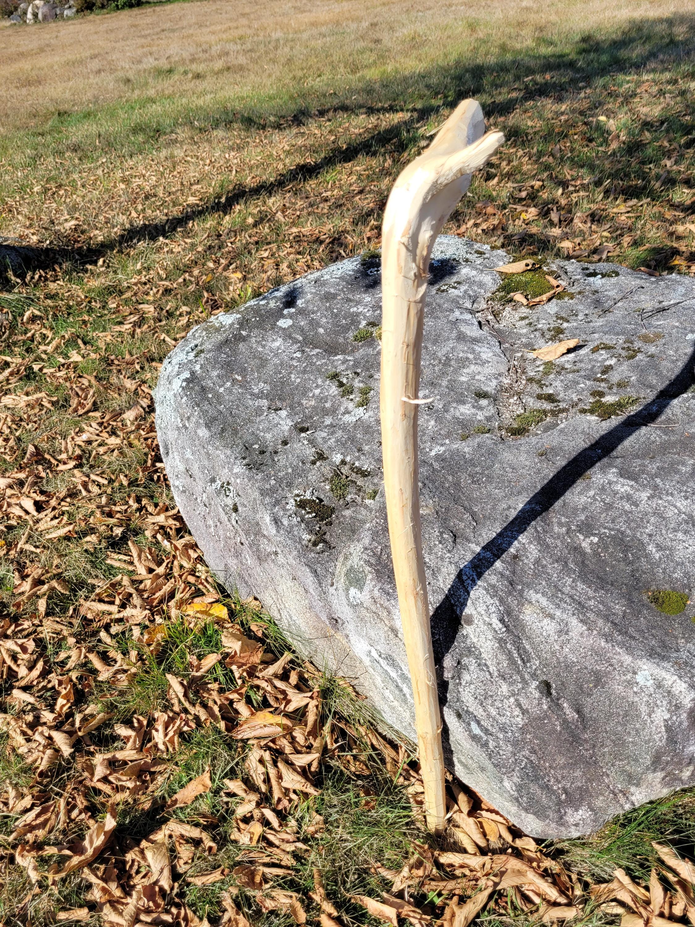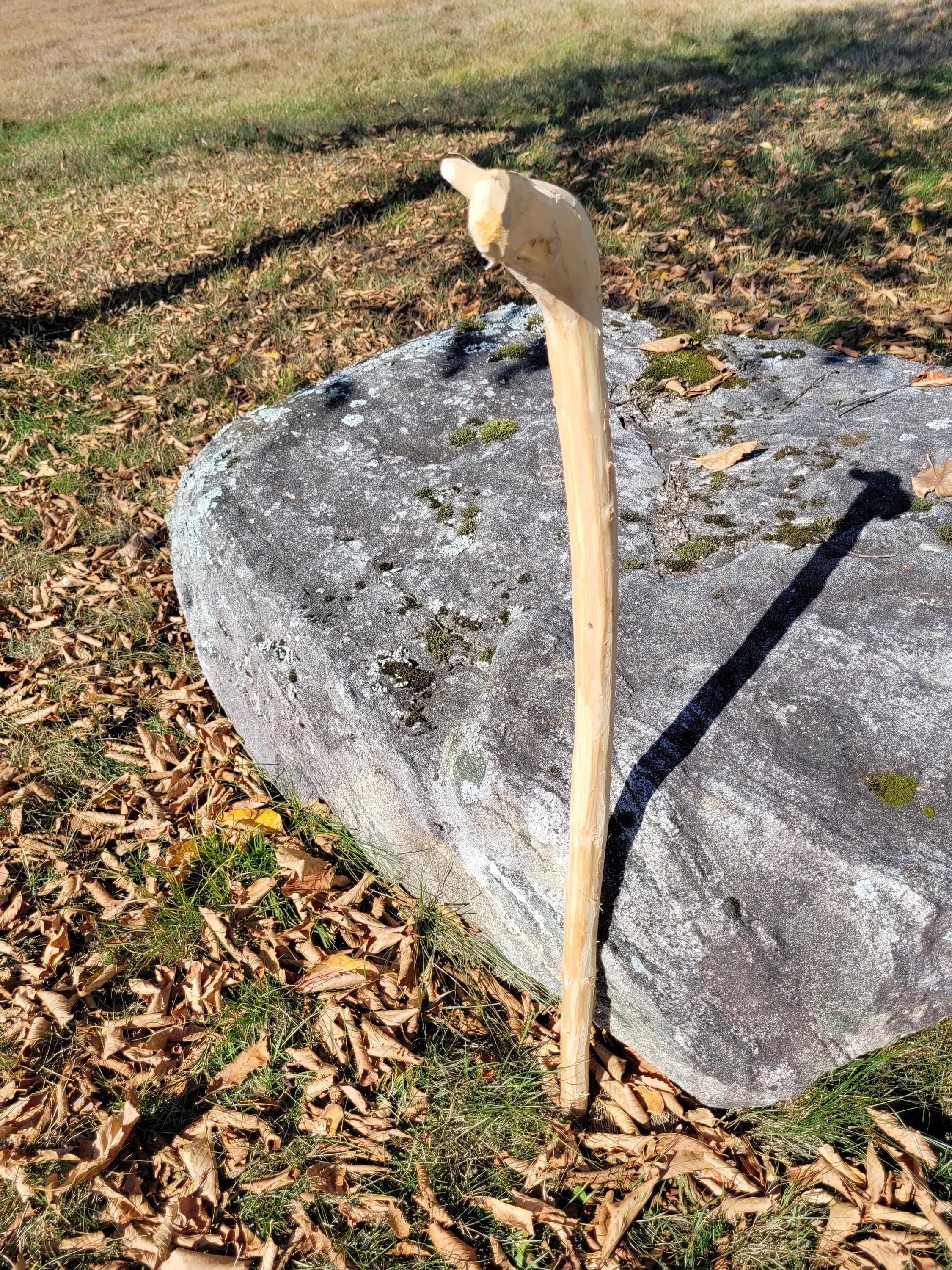 Here is a nice light (14 oz.) Balsam Fir cane blank that seems suitable for the right hand only because of the little spur off the side. It stands 37" tall as is and the entire shaft has a slight curve. The tip of this one is about 1" in diameter and the shaft goes up to about1-1/2". The grip is a little flattened oval profile more suitable for a smaller hand. This was harvested and the bark was stripped with a drawknife so there are tooling marks. It is a raw material and nothing else has been done to it.(uc52)
