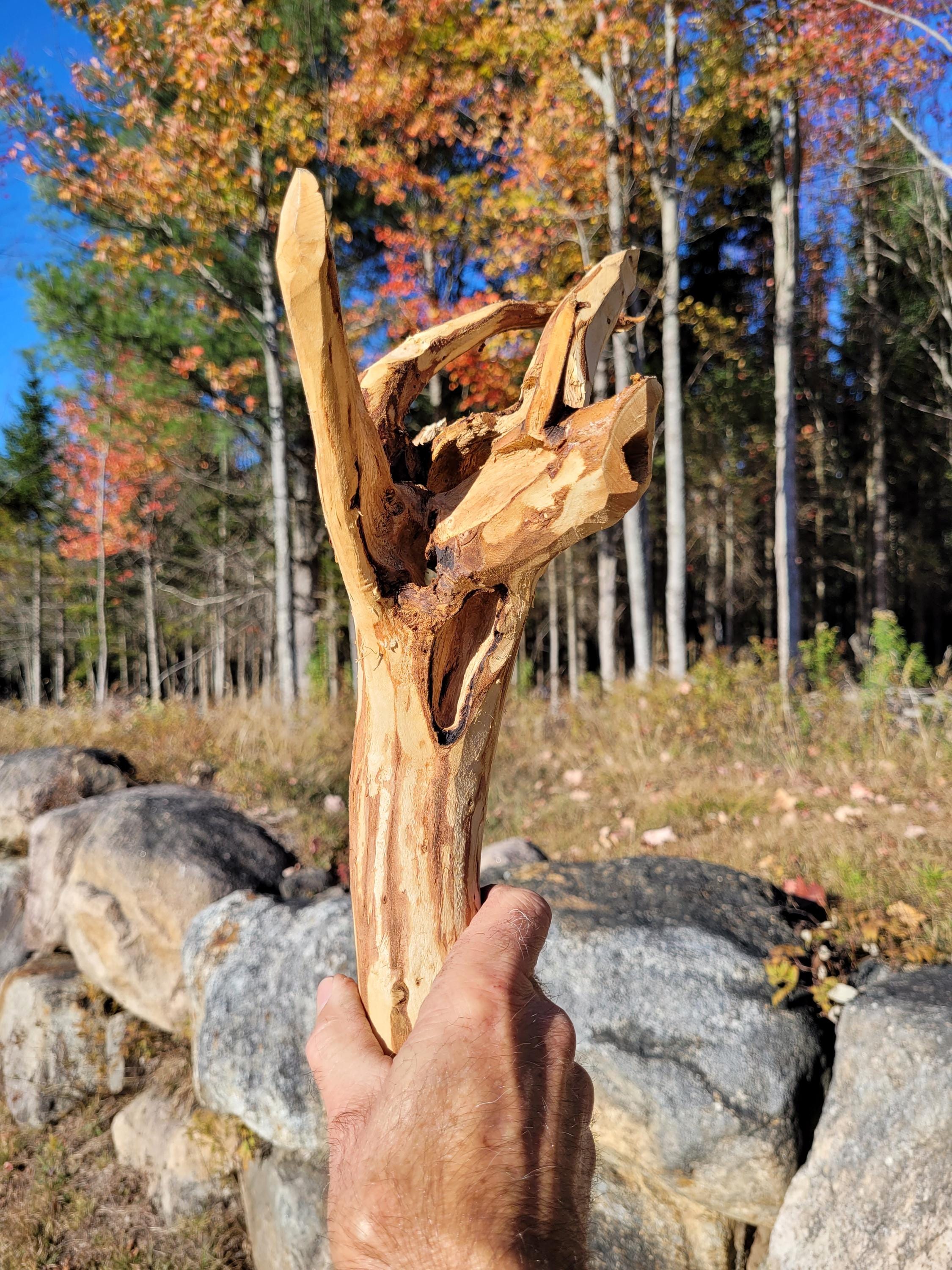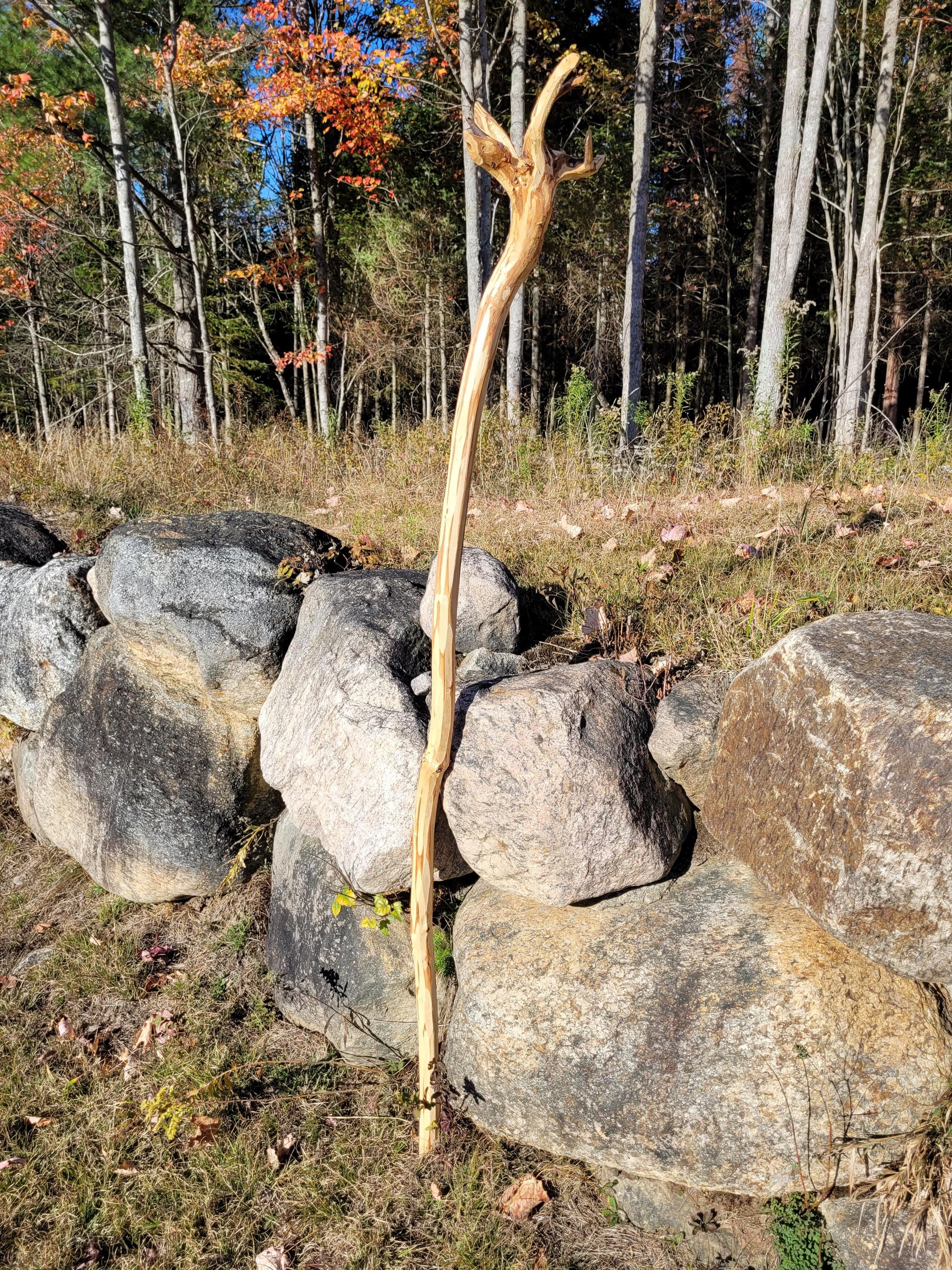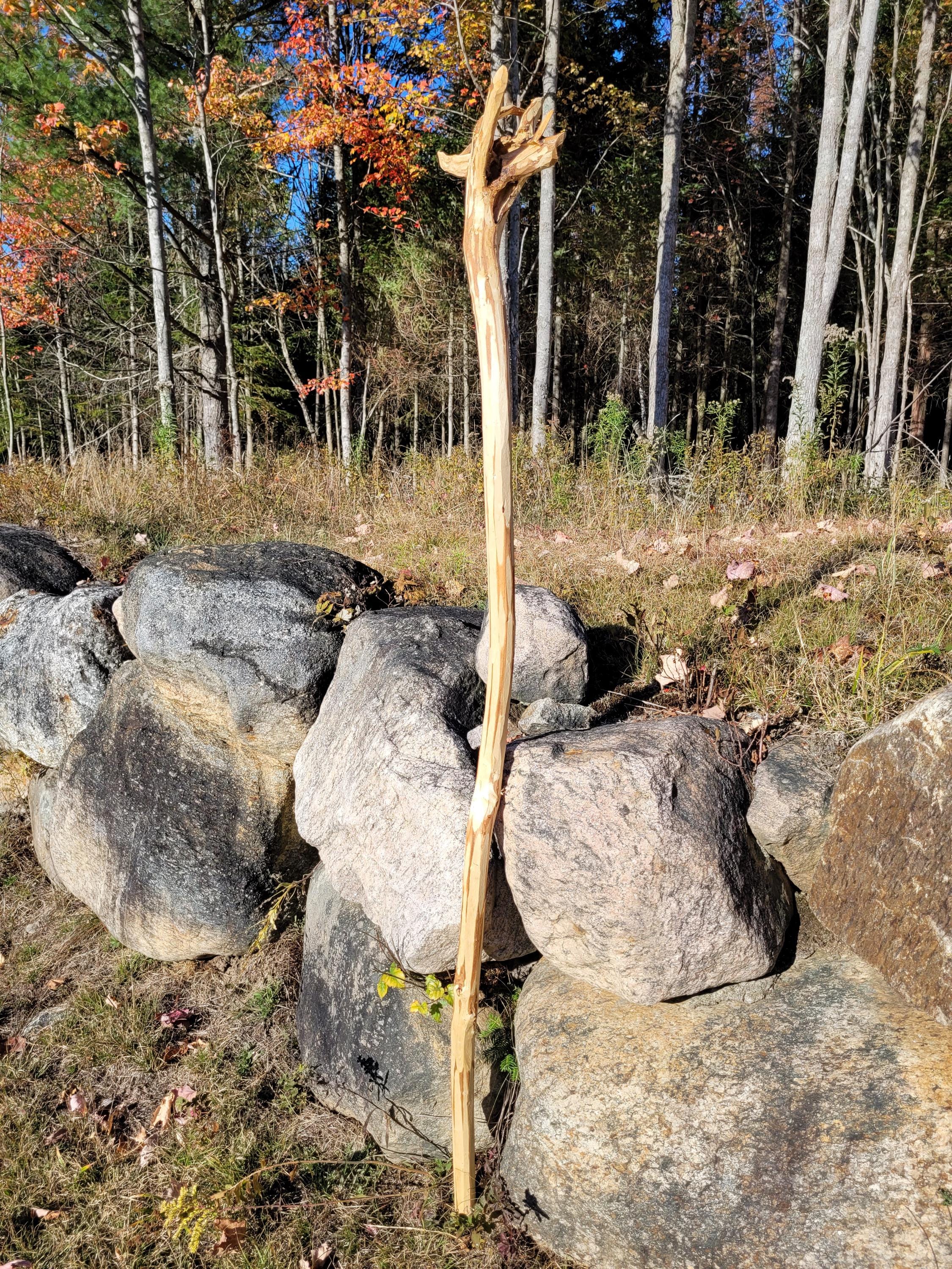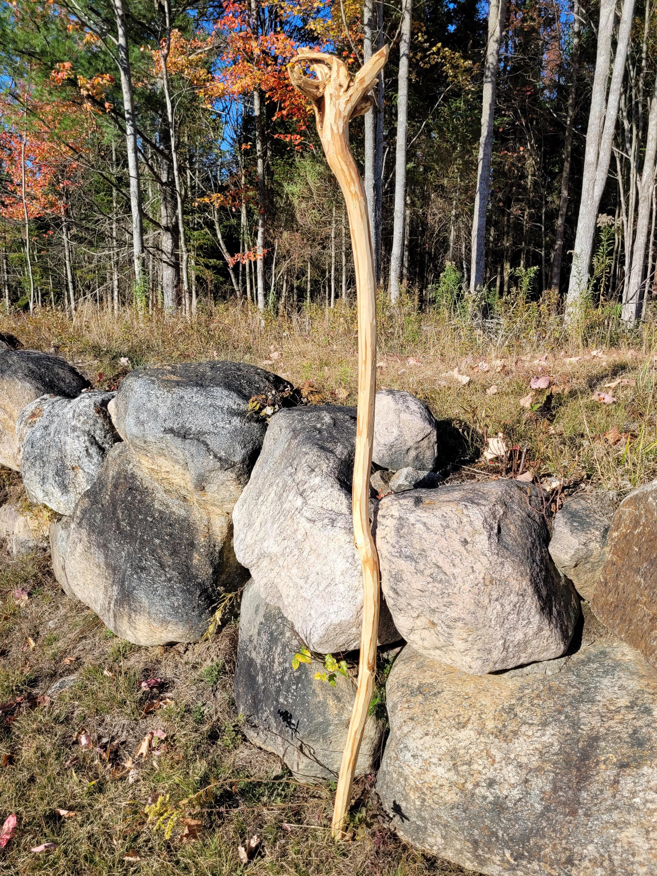 Here is a creepy root staff with a lot of missing mass. If I recall it was a Black Cherry and it had a lot of isolated rotten holes yet it was still clinging to life. As I thin the overgrown thickets I remove the damaged and deformed saplings to improve the stand. This one was both. Yes, the strength is compromised (only at the roots) but it creates cool caverns and holes. I see possibilities to back-light a gem in the fairy hole or maybe even a crystal sphere on the top strapped in. It doesn't have a full "cradle" to hold a sphere but it's acceptable for a tennis ball size (ball for reference only). It stands 71" tall and weighs just under 3#. The shaft varies in diameter from 1-1/4" to 2" in diameter. It was harvested and the bark was stripped with a drawknife before it was put up to dry. The drawknife leaves subtle facets as well as some cambium behind to give it a rustic appearance. This is a raw material ready to be customized. (ufws328)