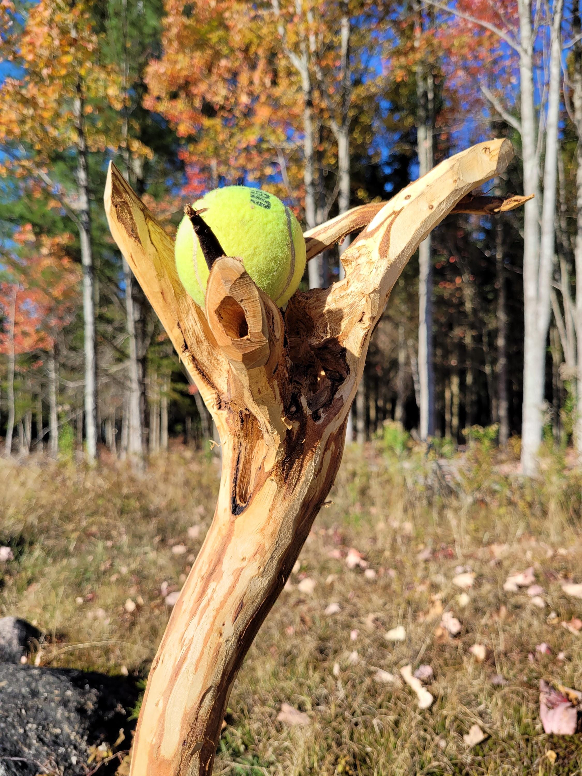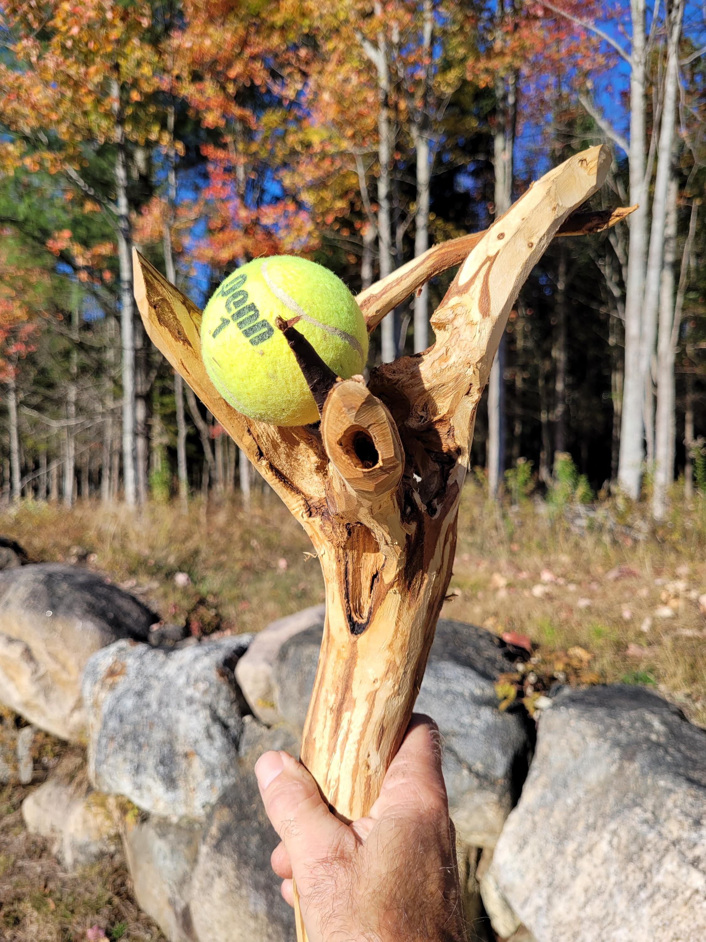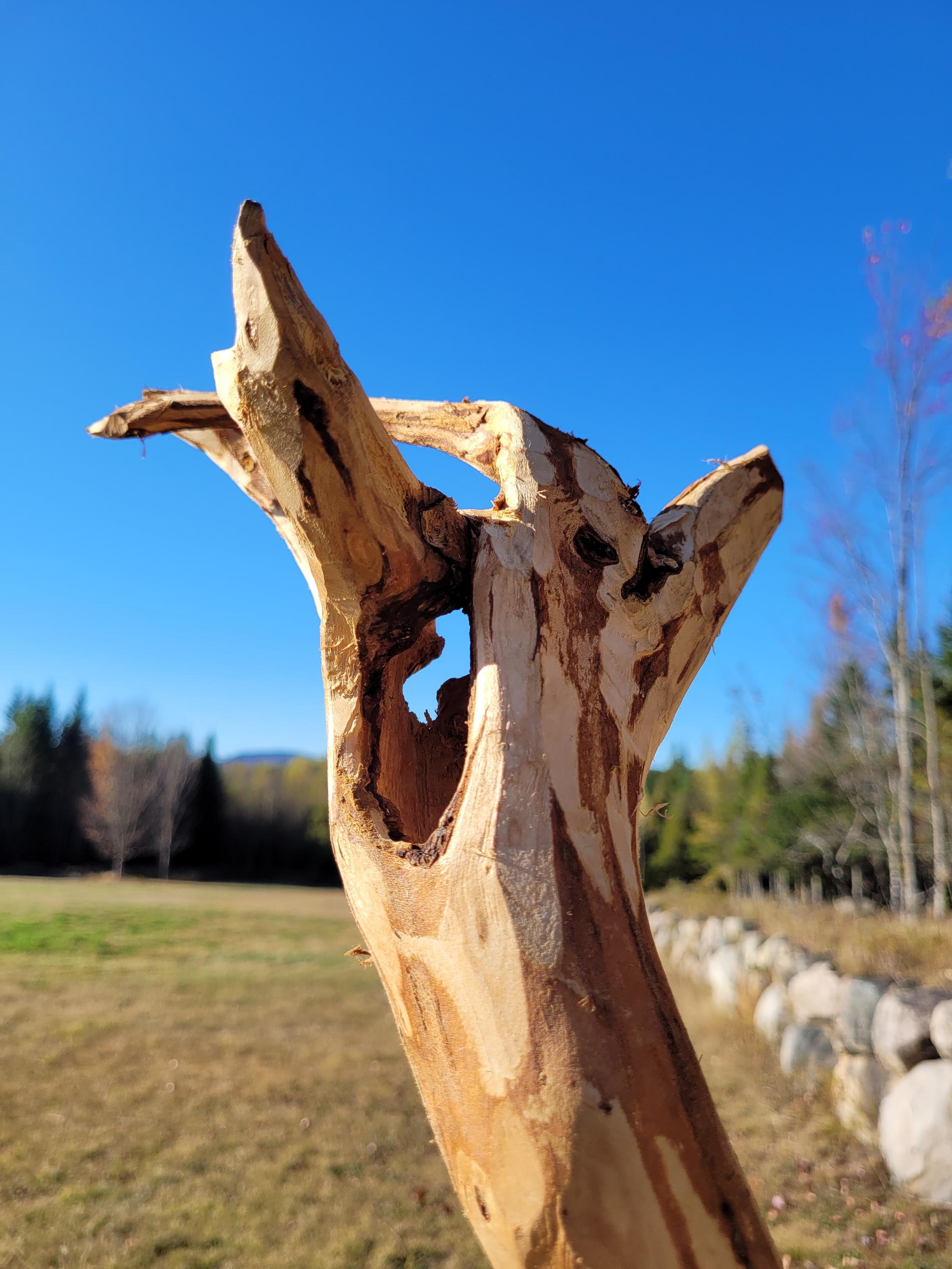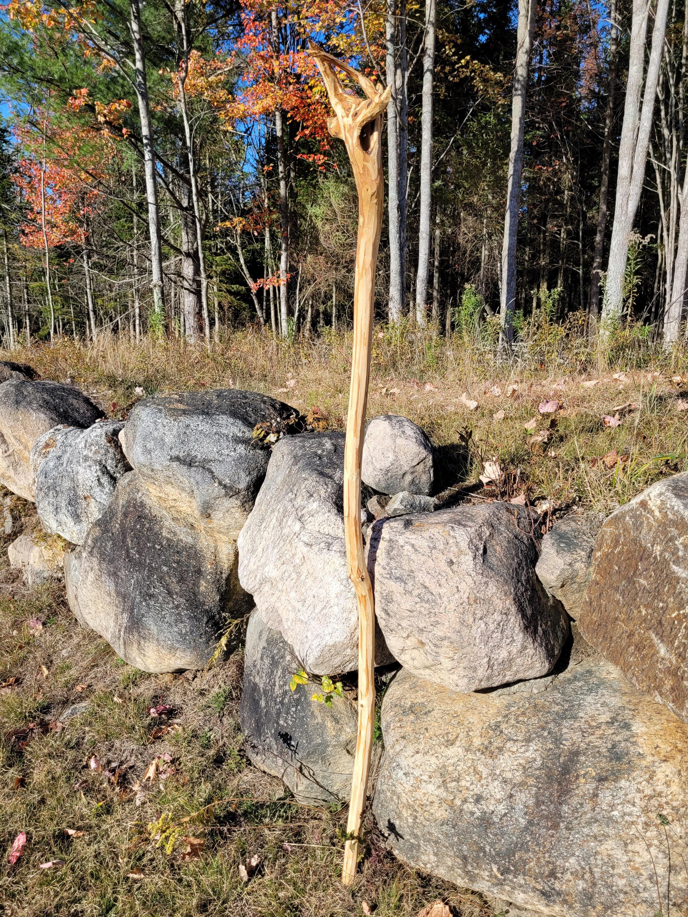 Here is a creepy root staff with a lot of missing mass. If I recall it was a Black Cherry and it had a lot of isolated rotten holes yet it was still clinging to life. As I thin the overgrown thickets I remove the damaged and deformed saplings to improve the stand. This one was both. Yes, the strength is compromised (only at the roots) but it creates cool caverns and holes. I see possibilities to back-light a gem in the fairy hole or maybe even a crystal sphere on the top strapped in. It doesn't have a full "cradle" to hold a sphere but it's acceptable for a tennis ball size (ball for reference only). It stands 71" tall and weighs just under 3#. The shaft varies in diameter from 1-1/4" to 2" in diameter. It was harvested and the bark was stripped with a drawknife before it was put up to dry. The drawknife leaves subtle facets as well as some cambium behind to give it a rustic appearance. This is a raw material ready to be customized. (ufws328)