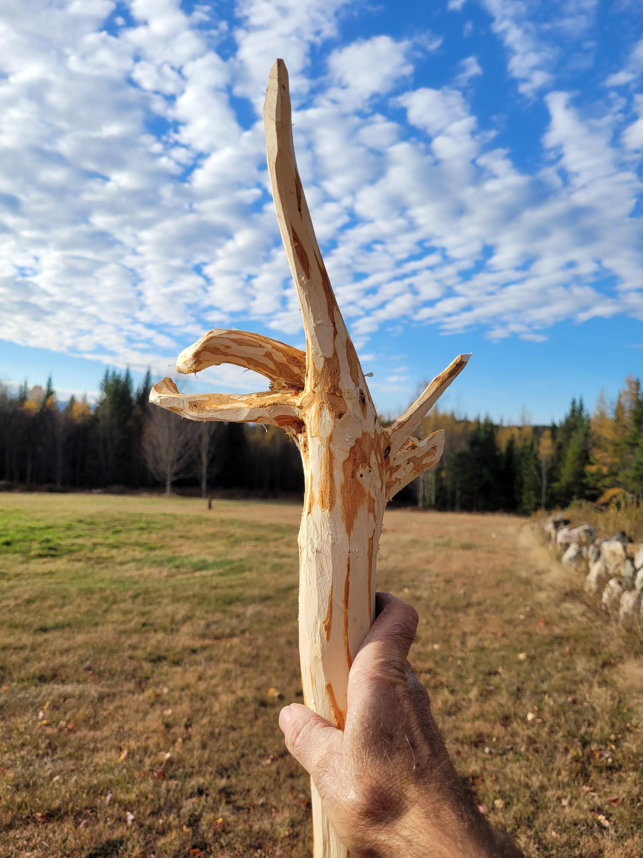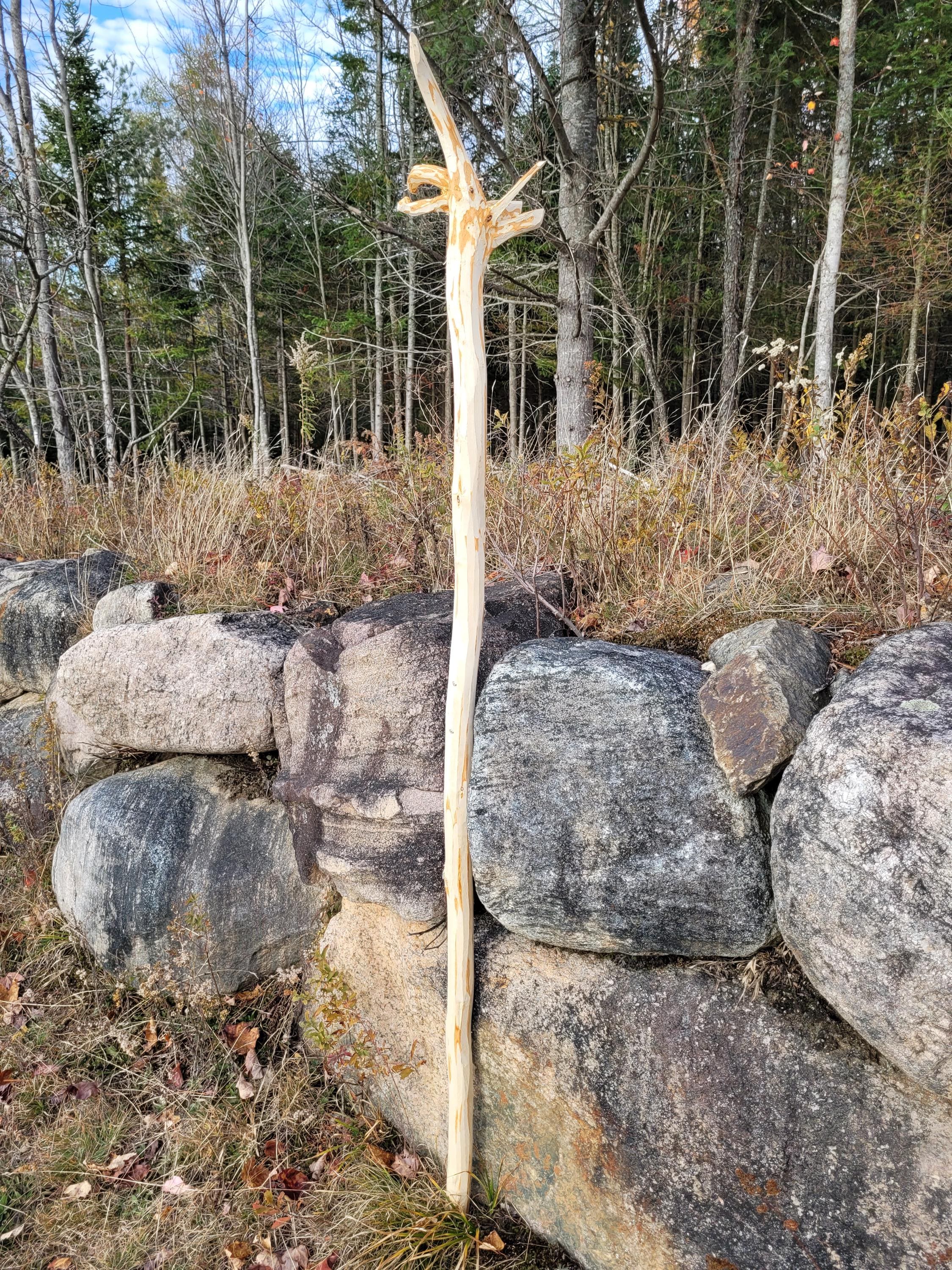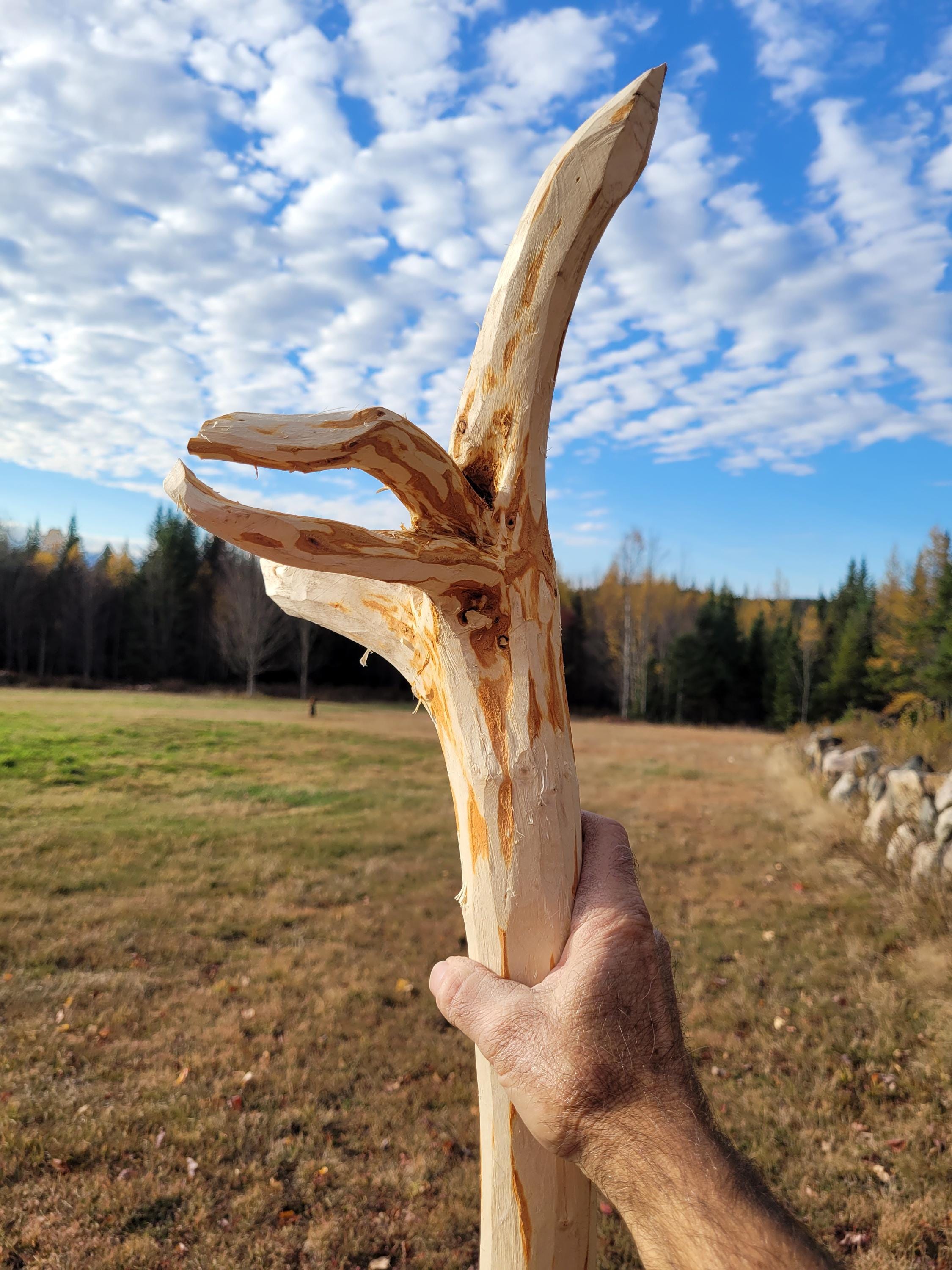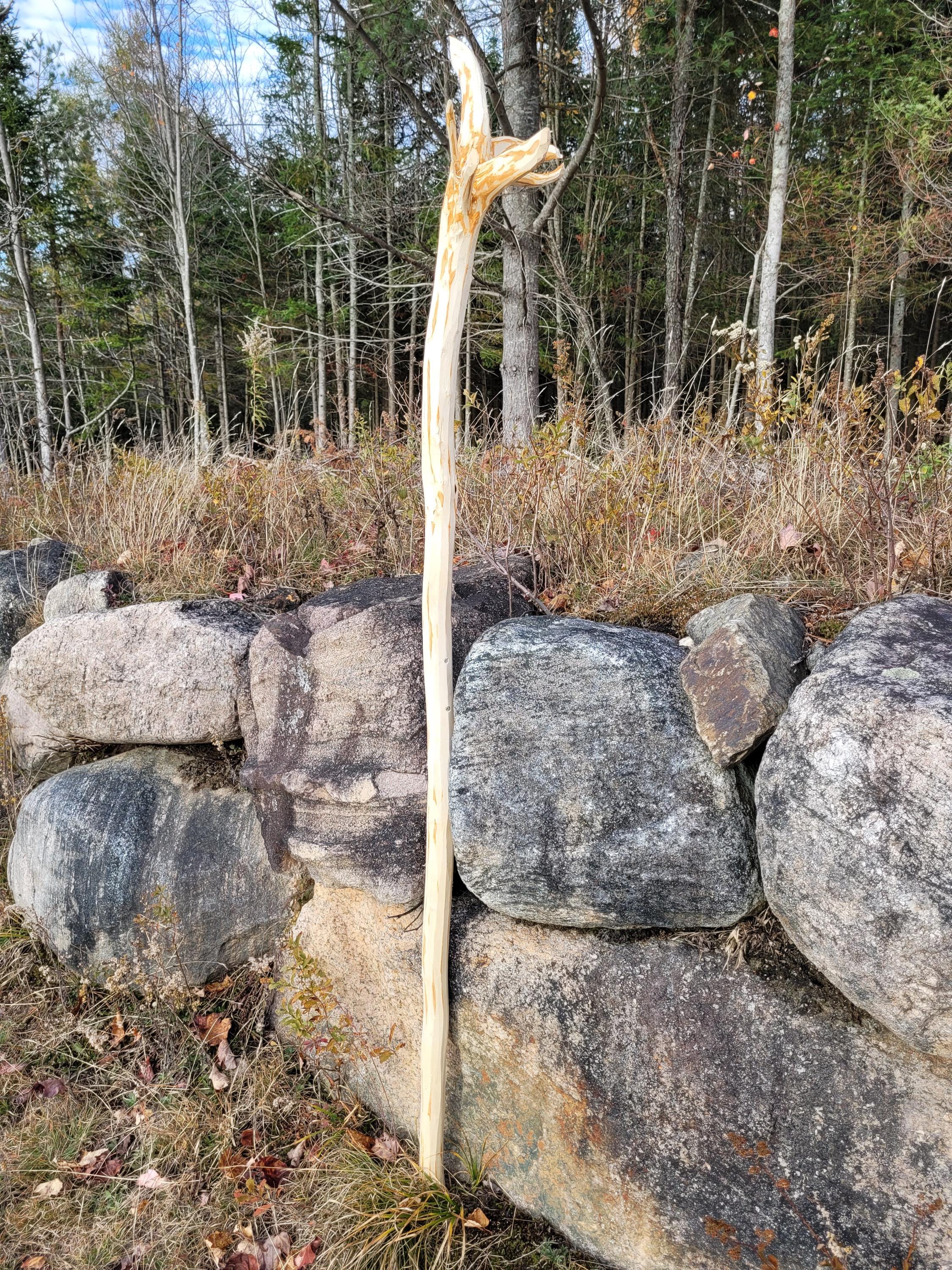 Here is another root staff with a knock-down joint so it'll ship for a lot less in a 40" long box rather than a 72" long box. This one is a birch sapling that's a little on the thick side. It stands a half inch shy of six feet when assembled with the provided hardware. It has a nice curved tap root and the shaft varies in diameter from 1-1/2" up to about 2". Like most of my other raw material staffs it was harvested and the dry bark was stripped with a drawknife which leaves and array of flat facets and tooling marks. It weighs 4#1 oz. currently. This is a raw material for you to work with.(ufws336)