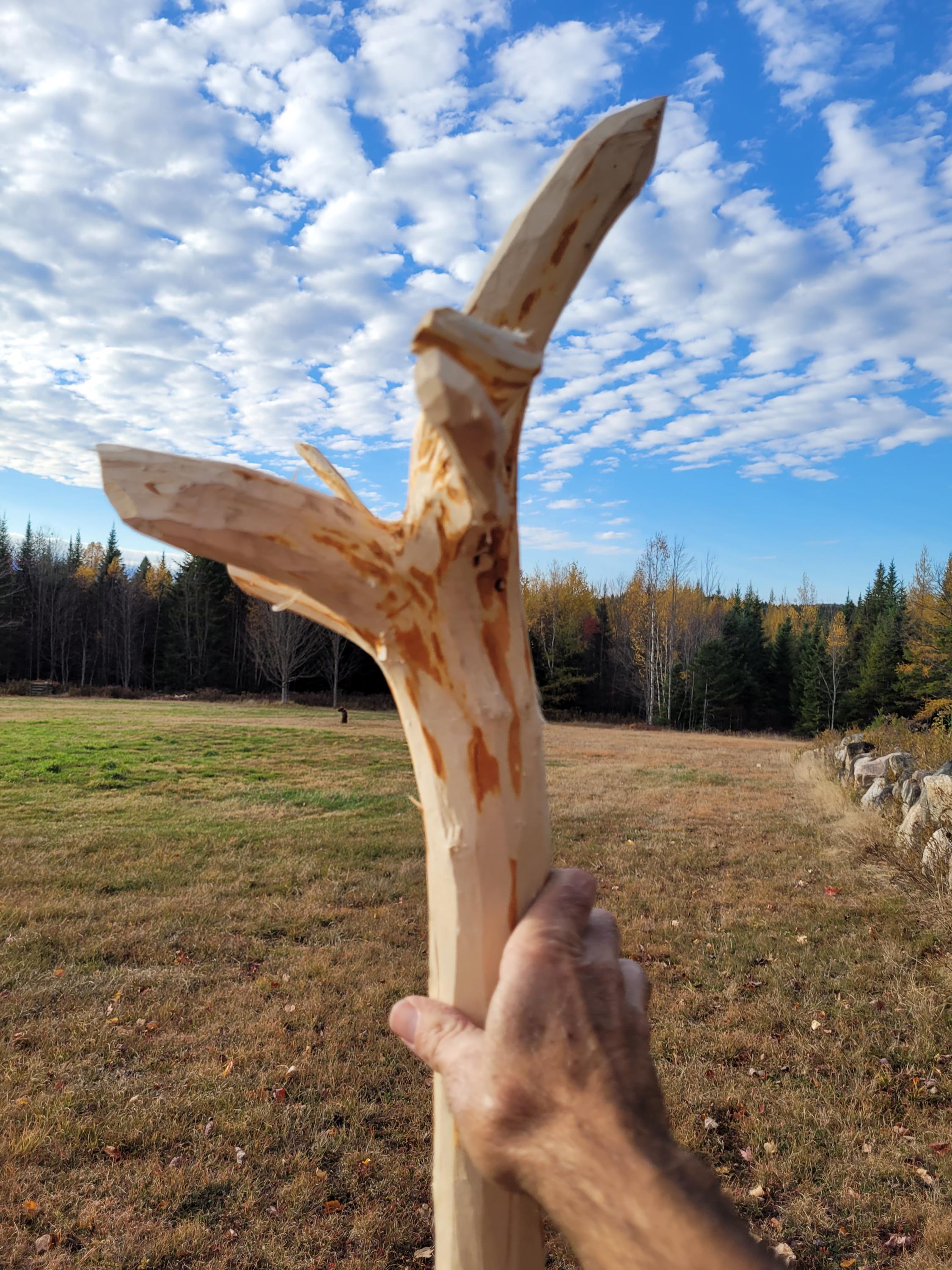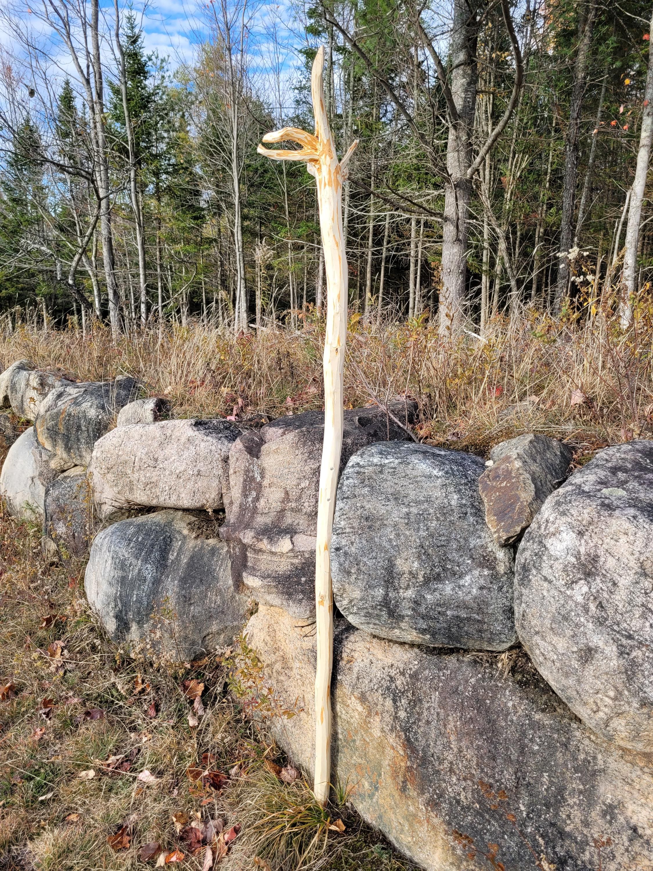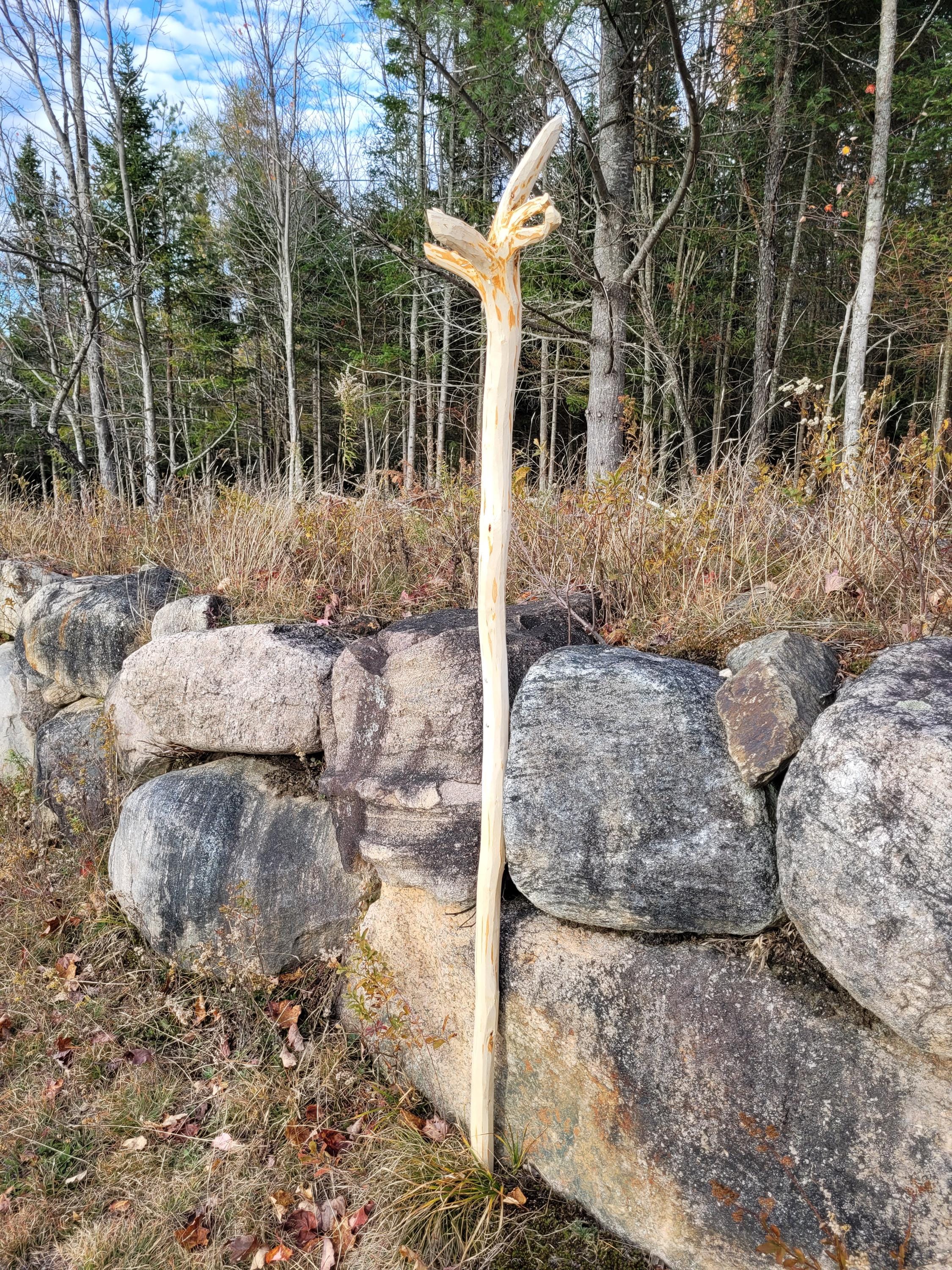 Here is another root staff with a knock-down joint so it'll ship for a lot less in a 40" long box rather than a 72" long box. This one is a birch sapling that's a little on the thick side. It stands a half inch shy of six feet when assembled with the provided hardware. It has a nice curved tap root and the shaft varies in diameter from 1-1/2" up to about 2". Like most of my other raw material staffs it was harvested and the dry bark was stripped with a drawknife which leaves and array of flat facets and tooling marks. It weighs 4#1 oz. currently. This is a raw material for you to work with.(ufws336)