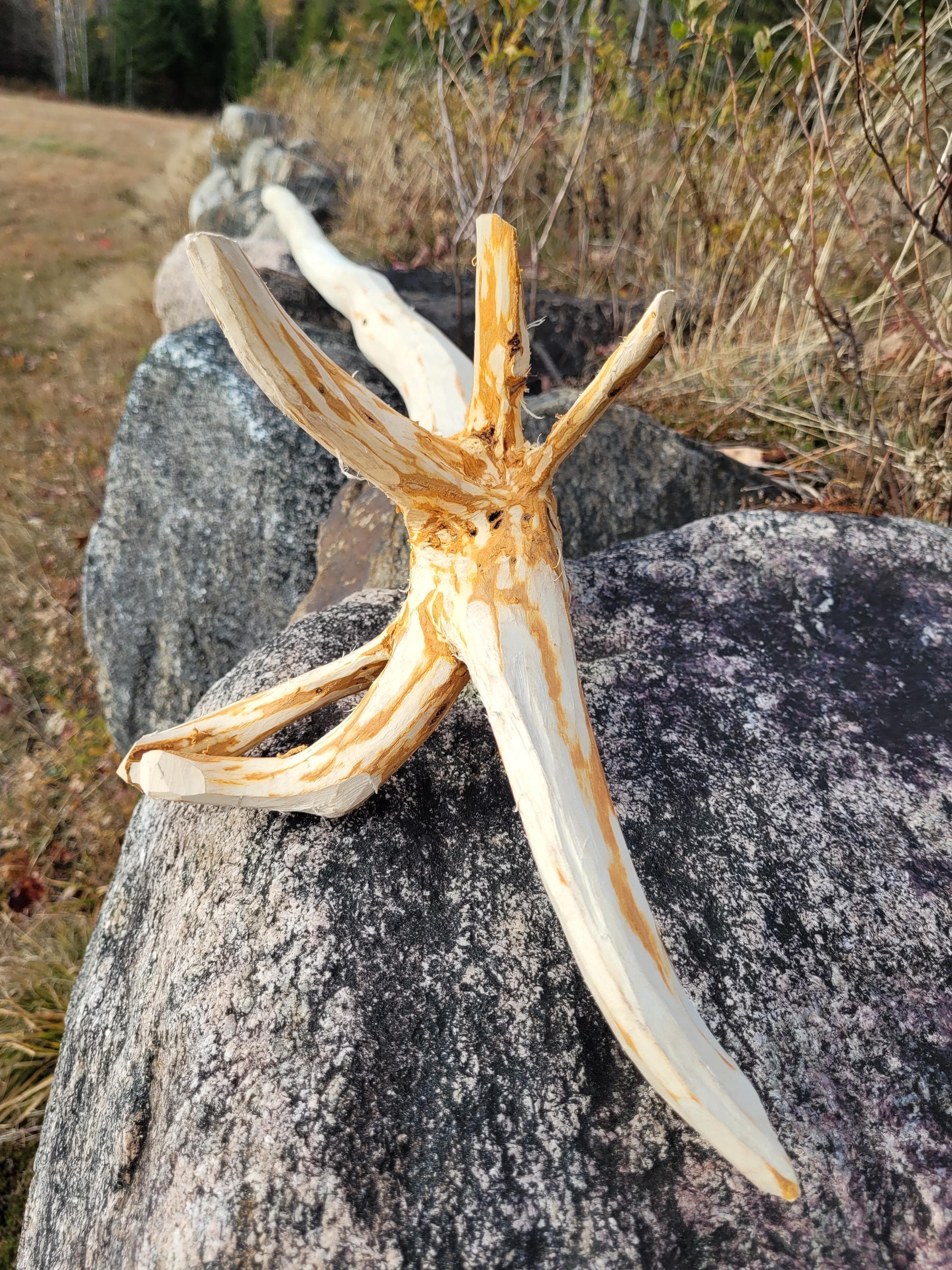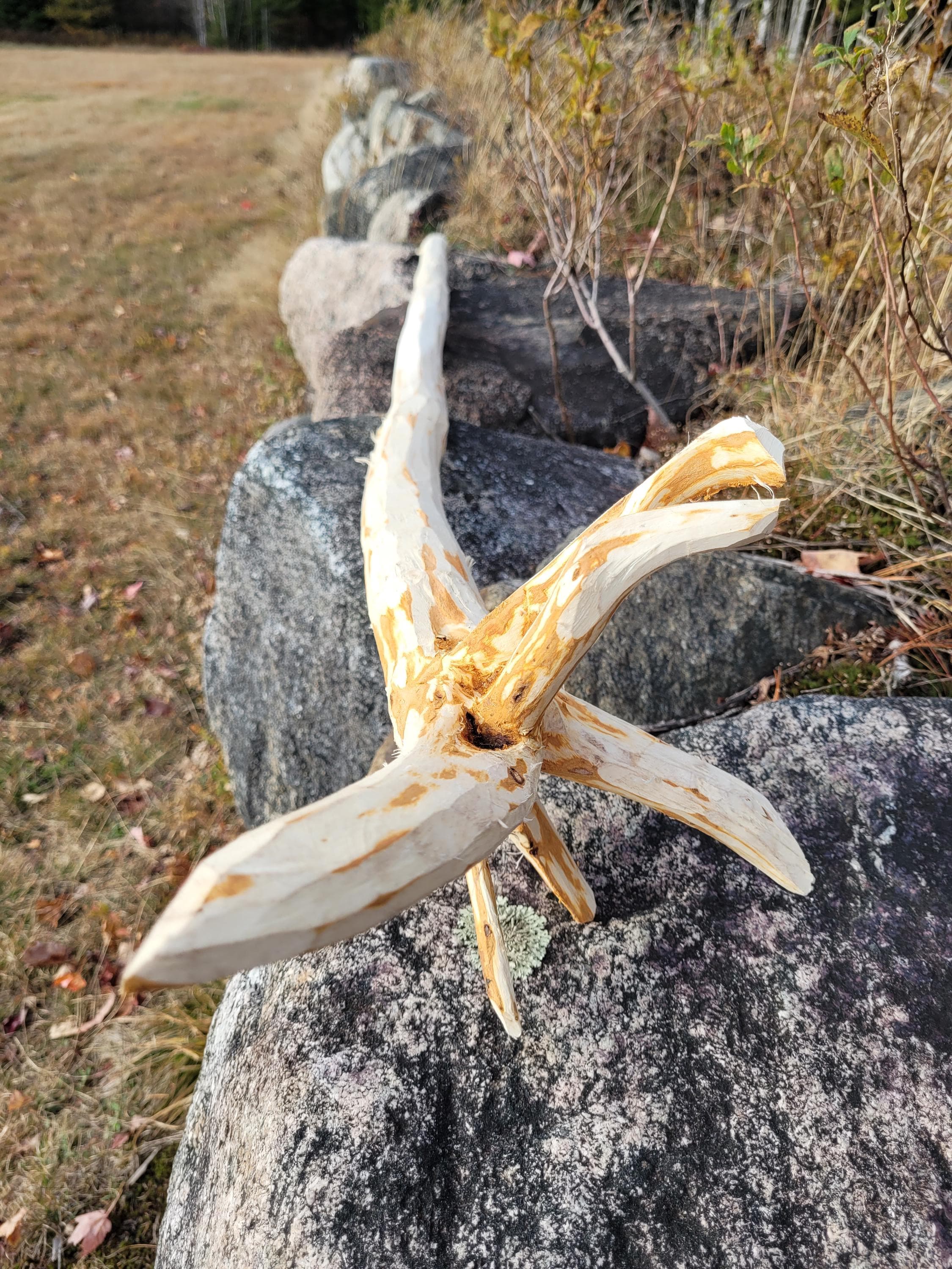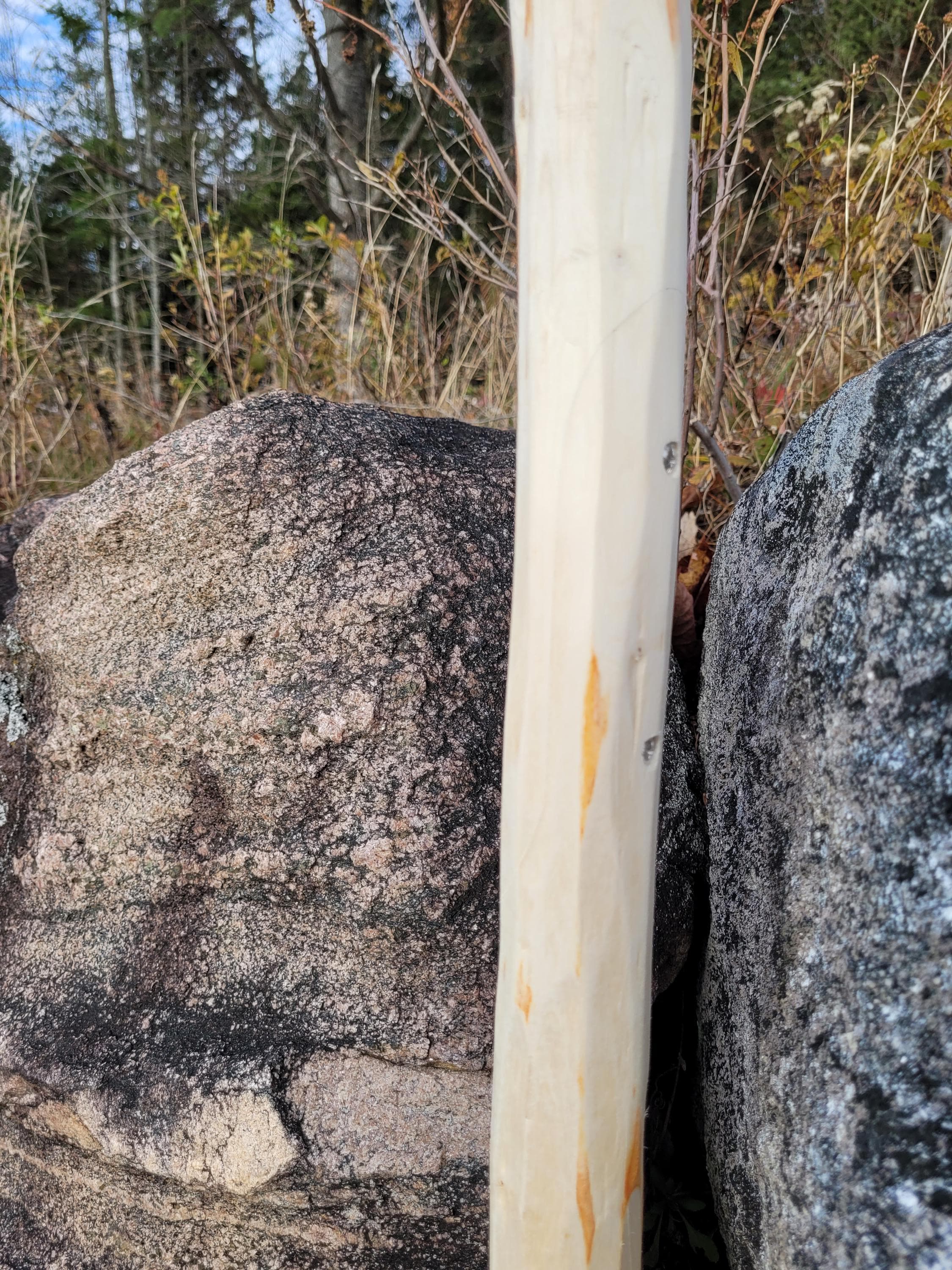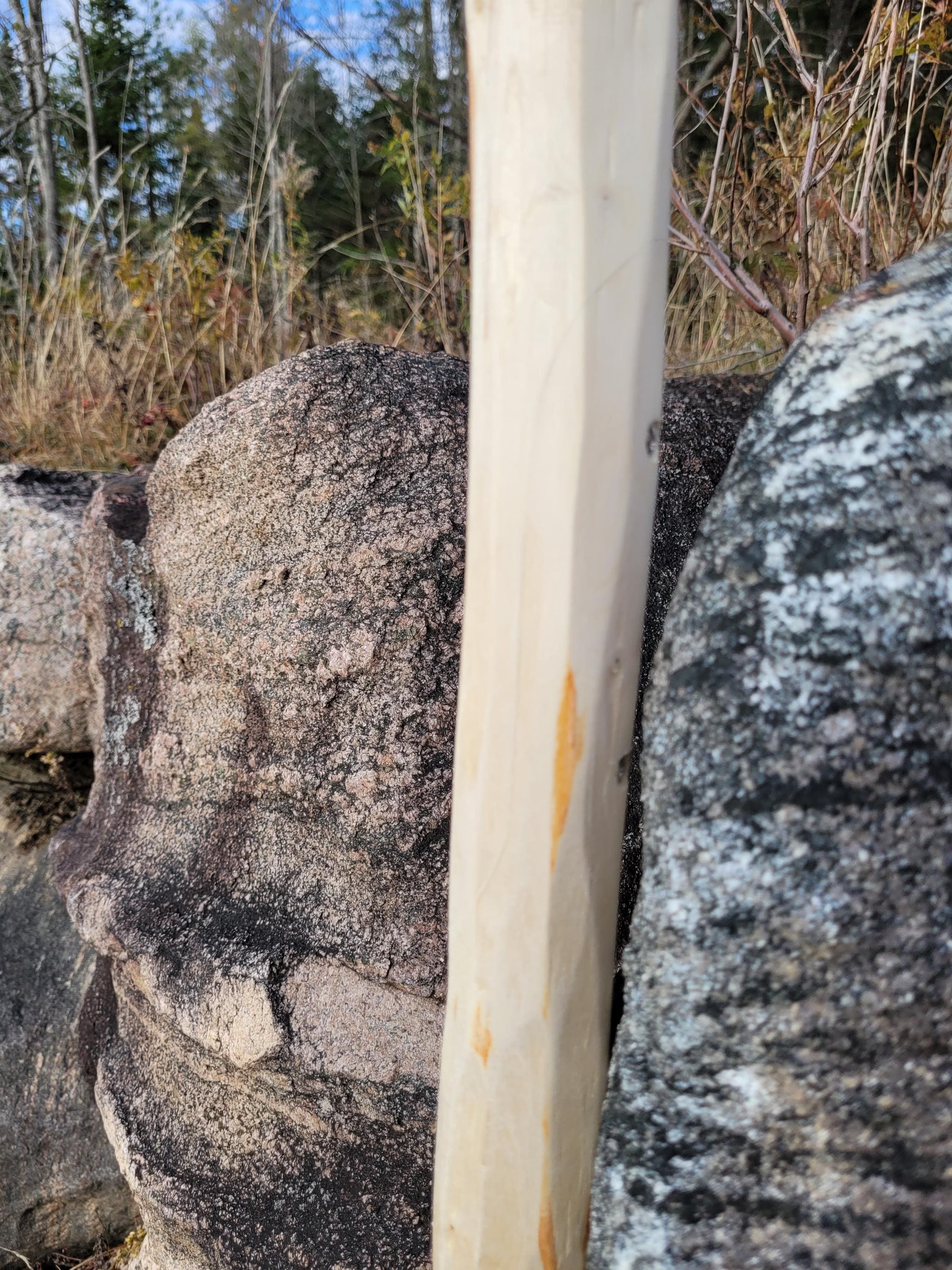 Here is another root staff with a knock-down joint so it'll ship for a lot less in a 40" long box rather than a 72" long box. This one is a birch sapling that's a little on the thick side. It stands a half inch shy of six feet when assembled with the provided hardware. It has a nice curved tap root and the shaft varies in diameter from 1-1/2" up to about 2". Like most of my other raw material staffs it was harvested and the dry bark was stripped with a drawknife which leaves and array of flat facets and tooling marks. It weighs 4#1 oz. currently. This is a raw material for you to work with.(ufws336)