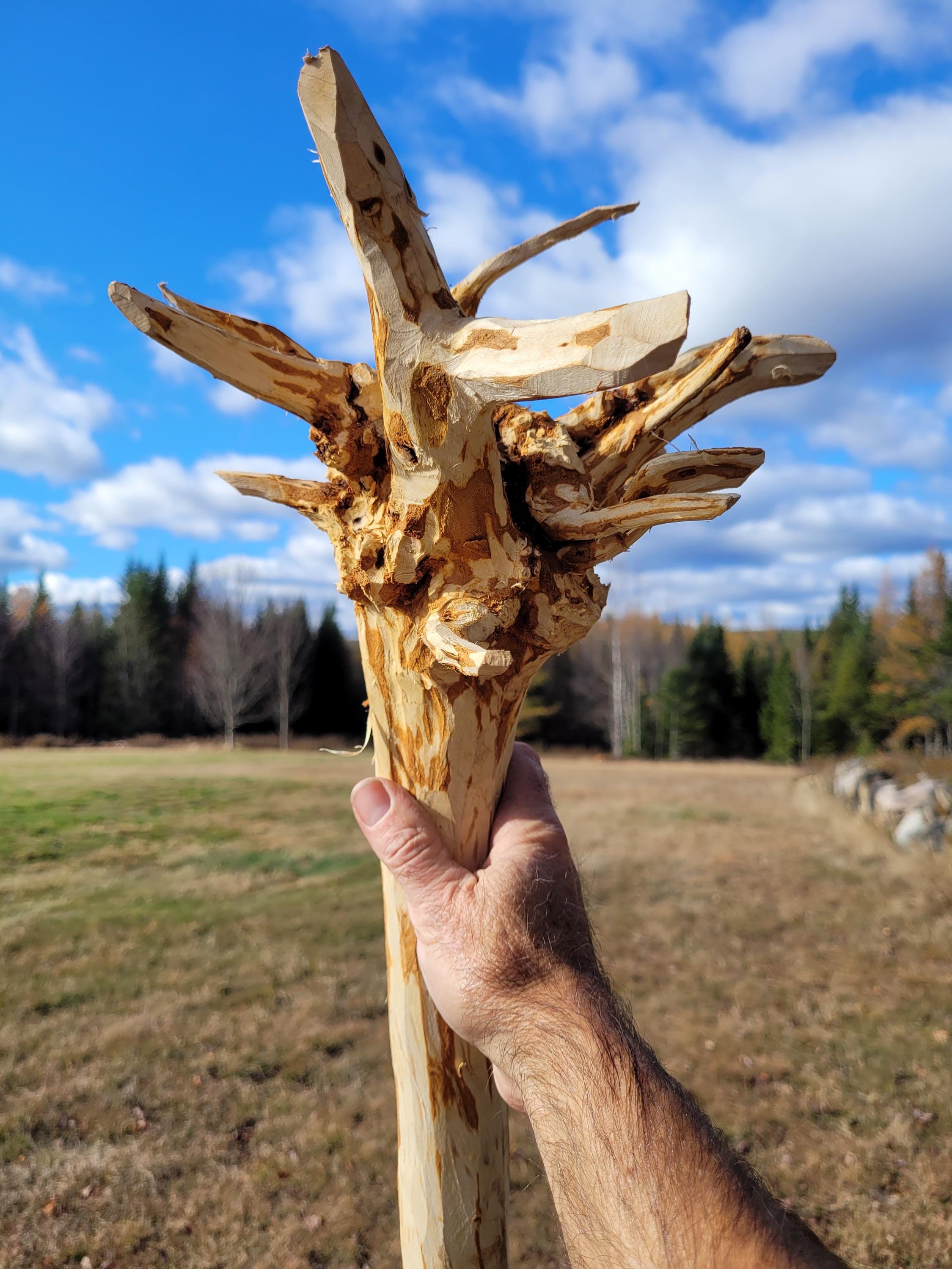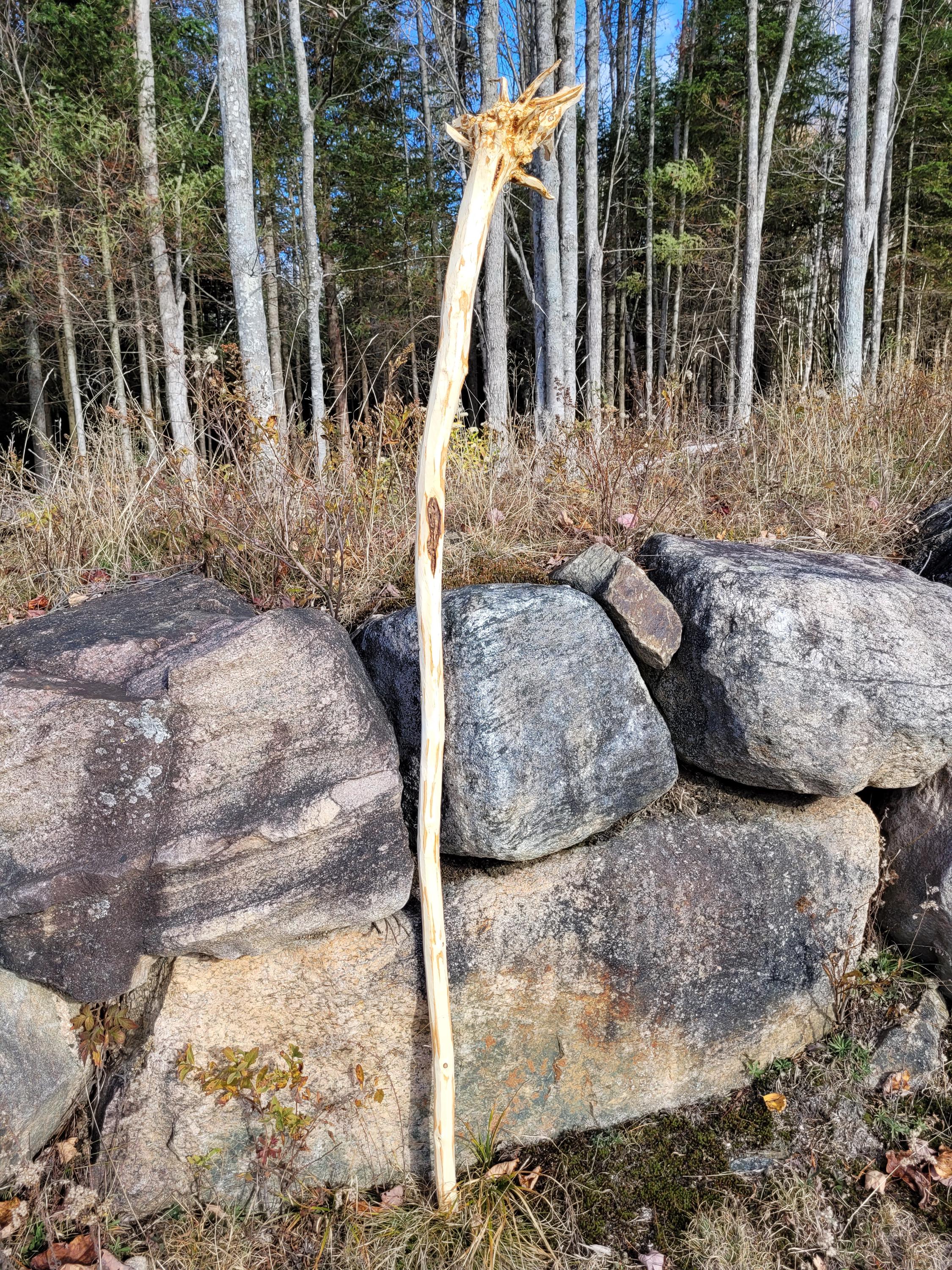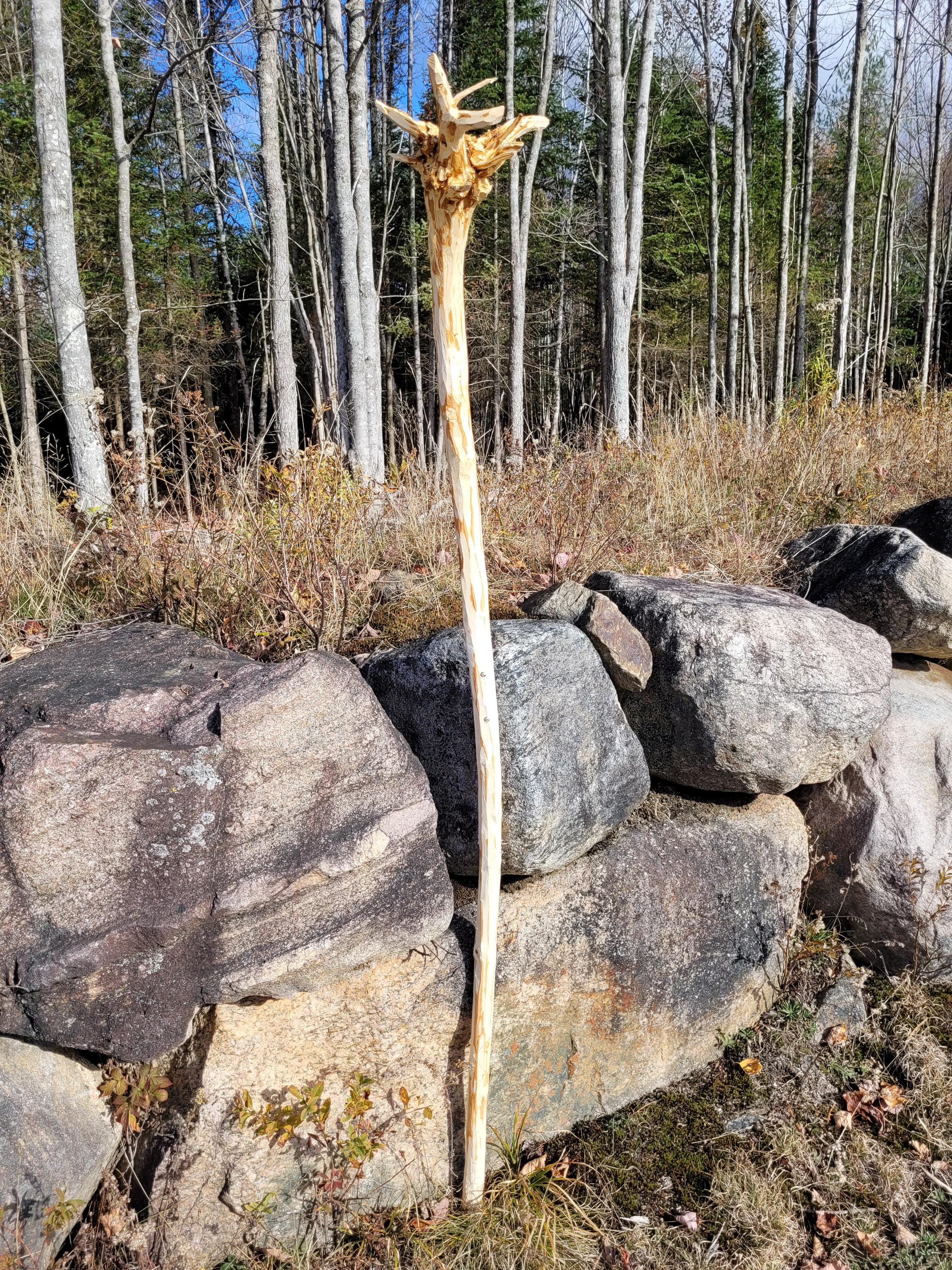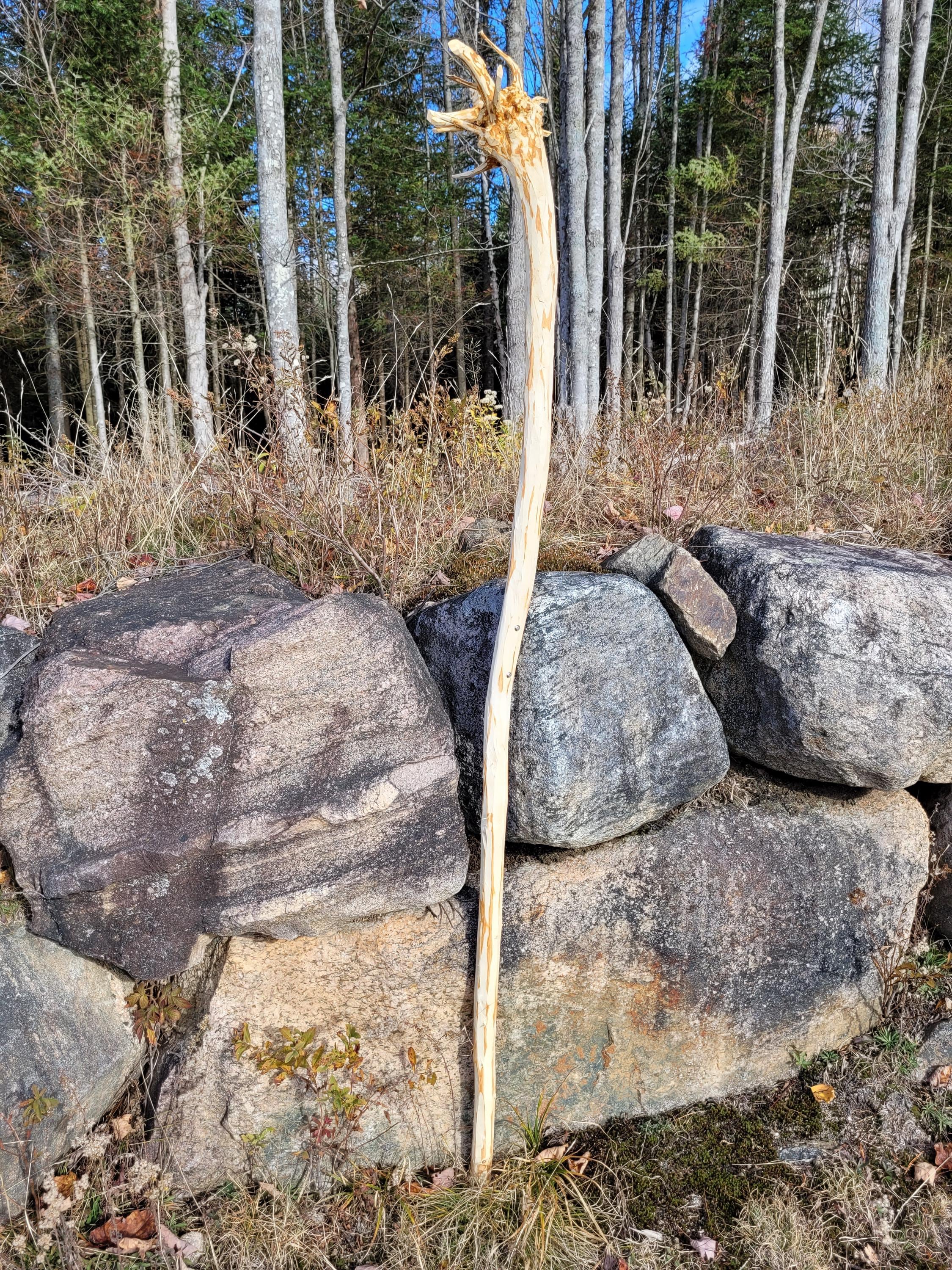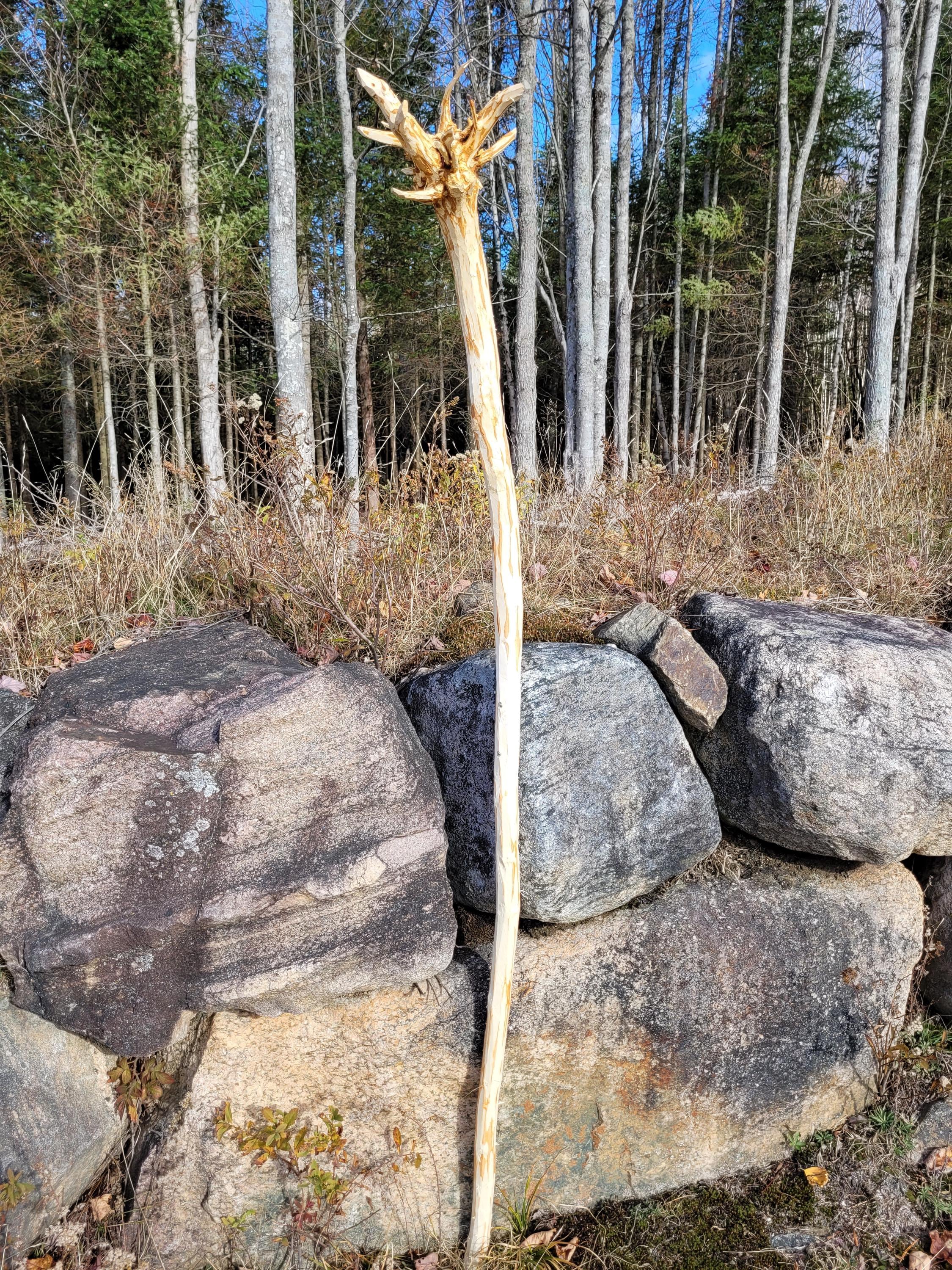 Here is a large wizard staff with an overlapping joint in the middle to reduce shipping. It is a birch specimen that stands 70-3/4" when assembled with the included hardware. When broken down it will ship in a 40" long x 8" x 8" box. Currently it weighs four pounds and the shaft ranges in diameter from 1-3/8" up to 2-1/4". A few of the pics show it with a 3" round dog ball (not included) just to demonstrate it can hold an artifact if that's your vision. This was harvested and the bark was stripped with a drawknife, hence it has flat facets and tooling marks all over to give it a hand-hewn look. It has two bark covered scar on it and the roots have some bark inclusions between where they originate. This is not straight, the entire piece curves somewhat. This is a raw material for you to customize.(ufws339)