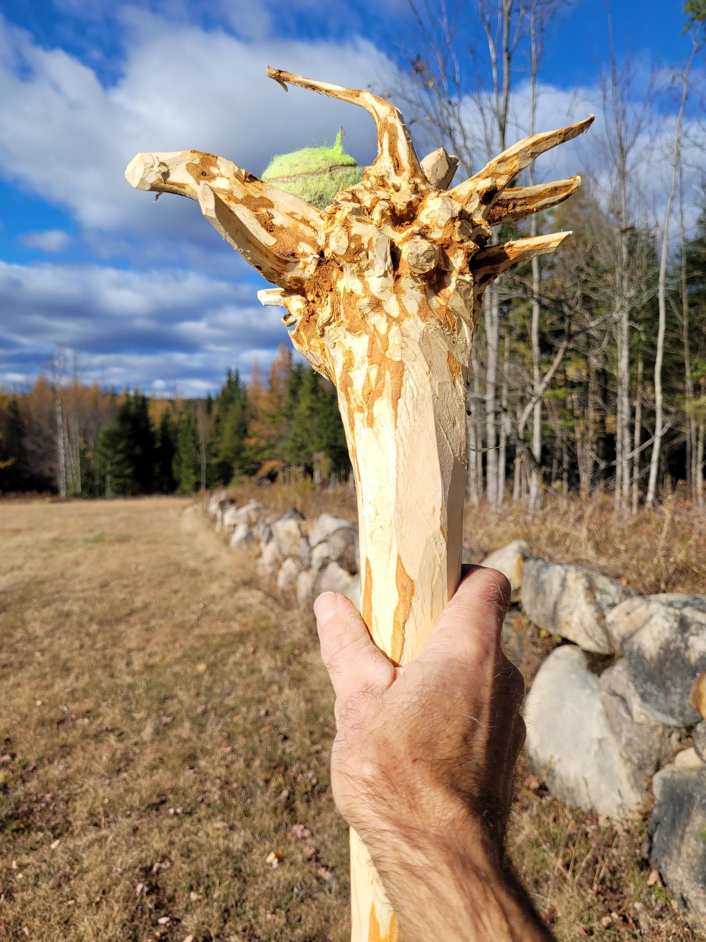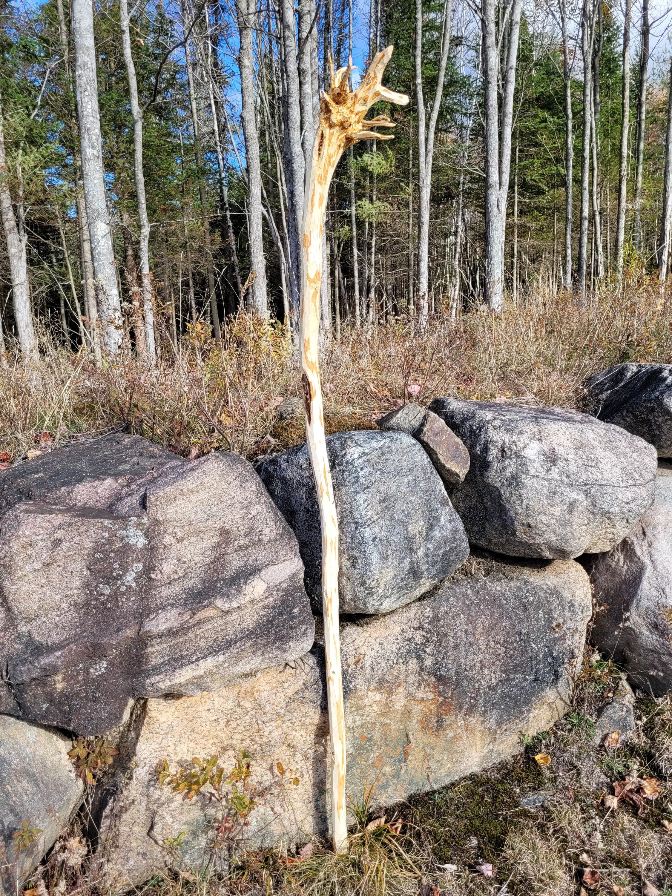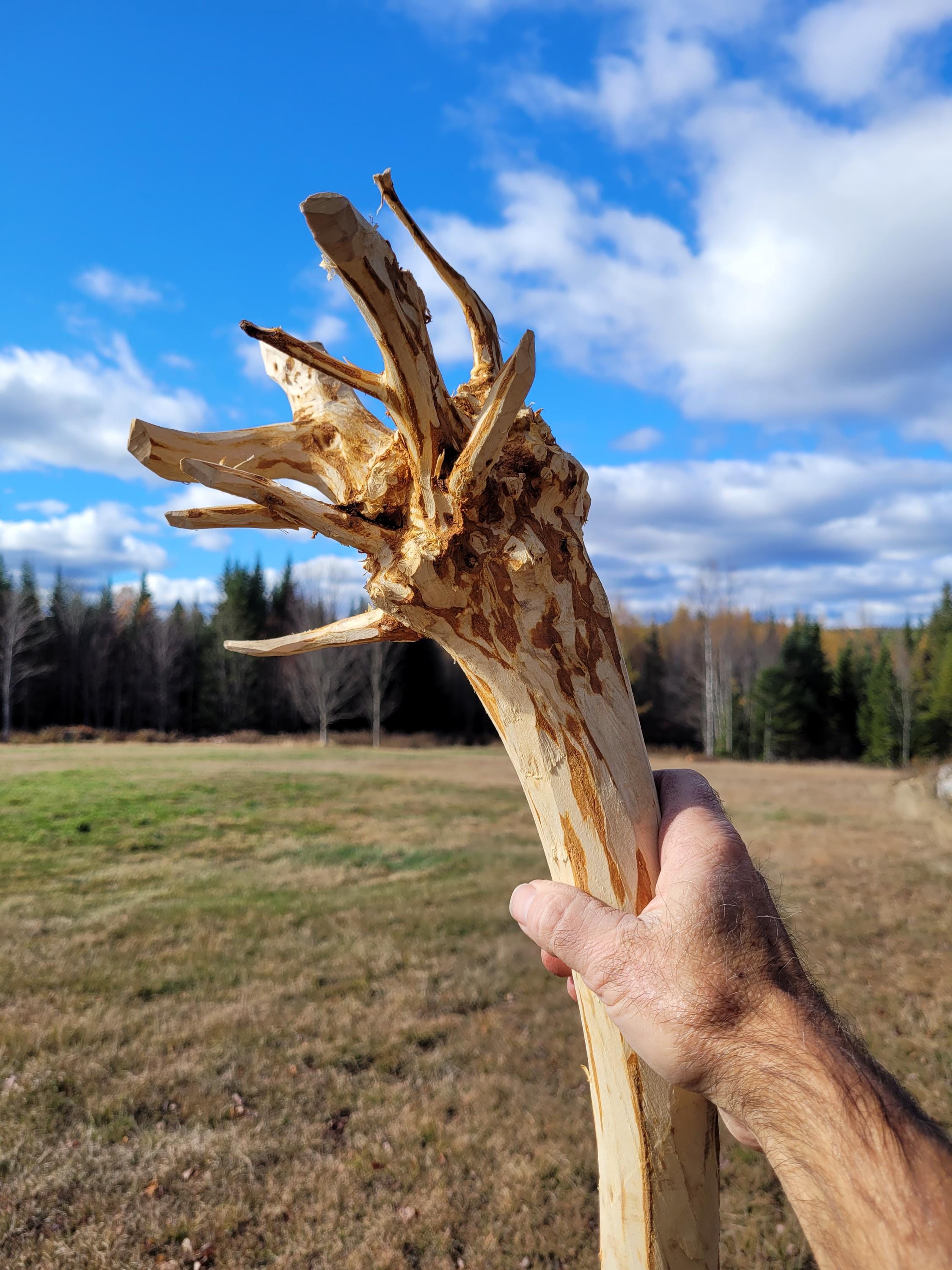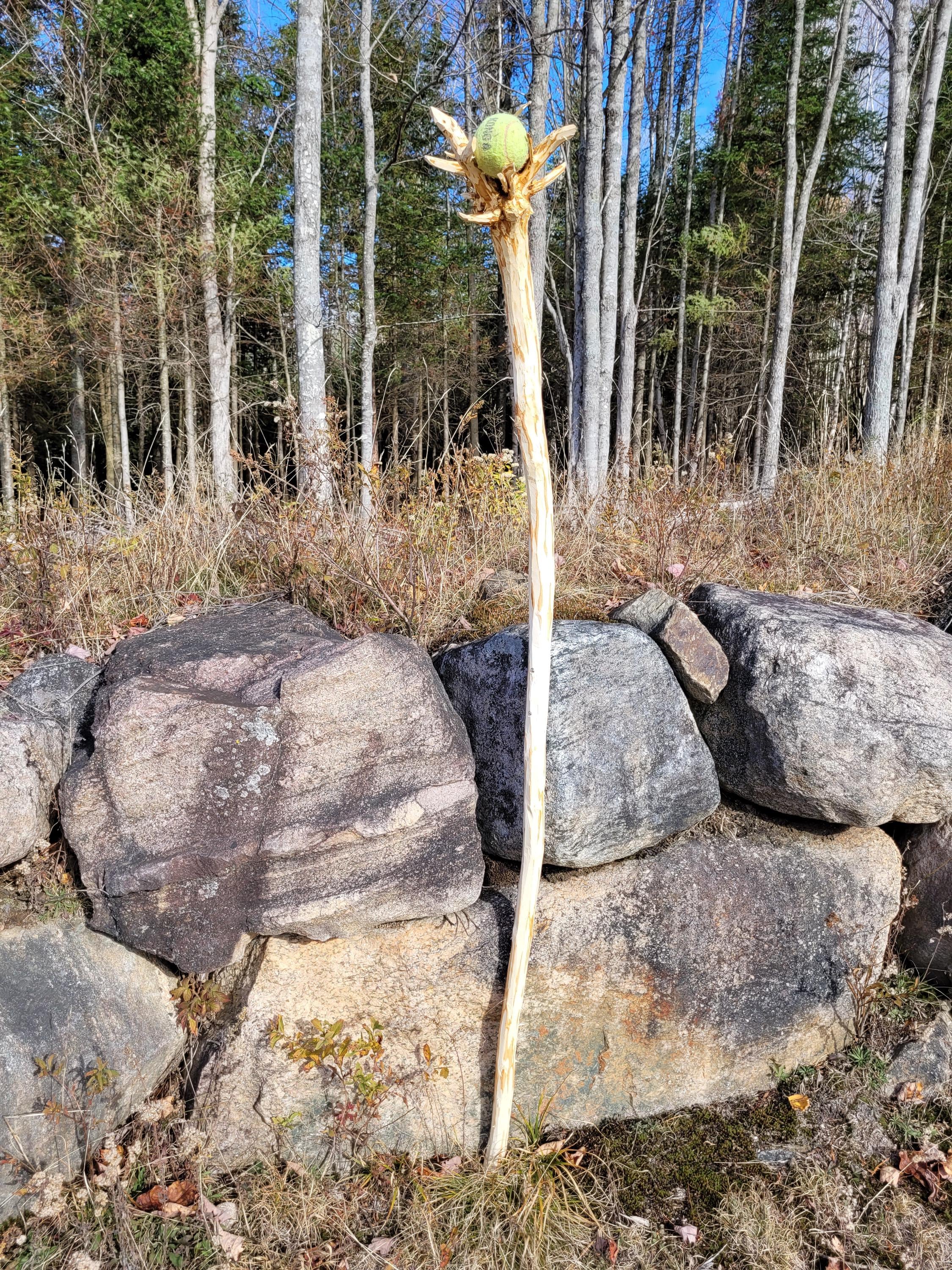 Here is a large wizard staff with an overlapping joint in the middle to reduce shipping. It is a birch specimen that stands 70-3/4" when assembled with the included hardware. When broken down it will ship in a 40" long x 8" x 8" box. Currently it weighs four pounds and the shaft ranges in diameter from 1-3/8" up to 2-1/4". A few of the pics show it with a 3" round dog ball (not included) just to demonstrate it can hold an artifact if that's your vision. This was harvested and the bark was stripped with a drawknife, hence it has flat facets and tooling marks all over to give it a hand-hewn look. It has two bark covered scar on it and the roots have some bark inclusions between where they originate. This is not straight, the entire piece curves somewhat. This is a raw material for you to customize.(ufws339)