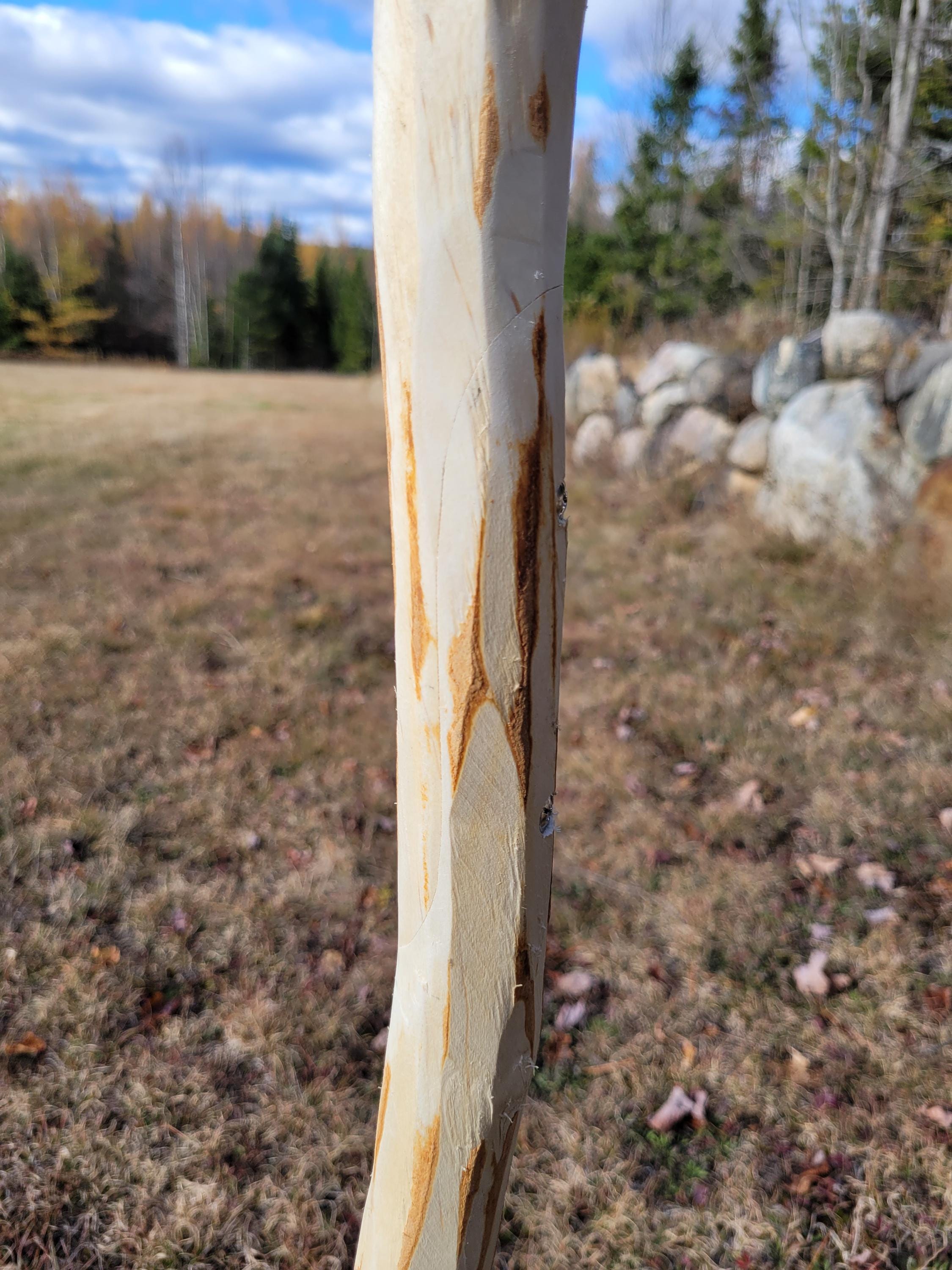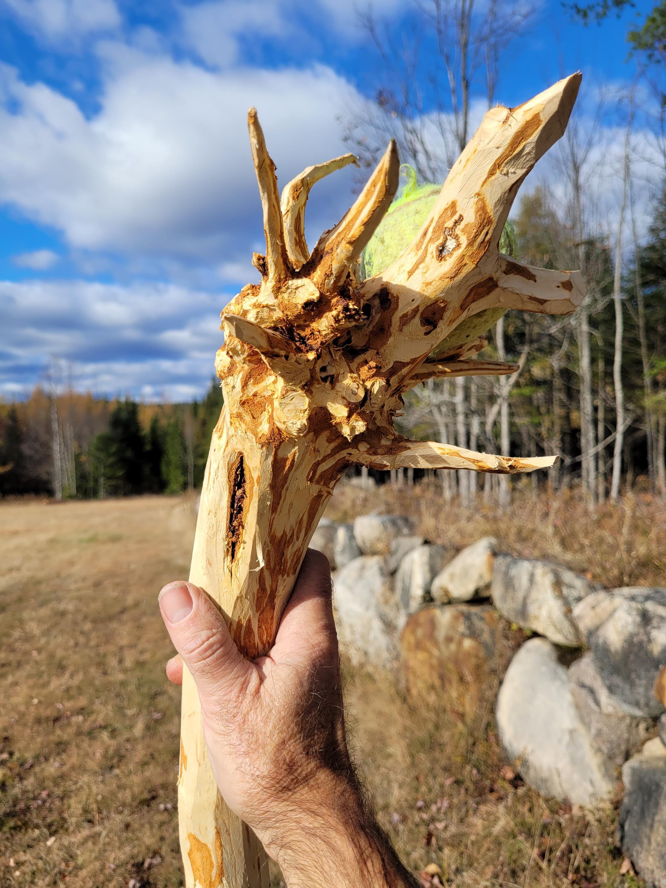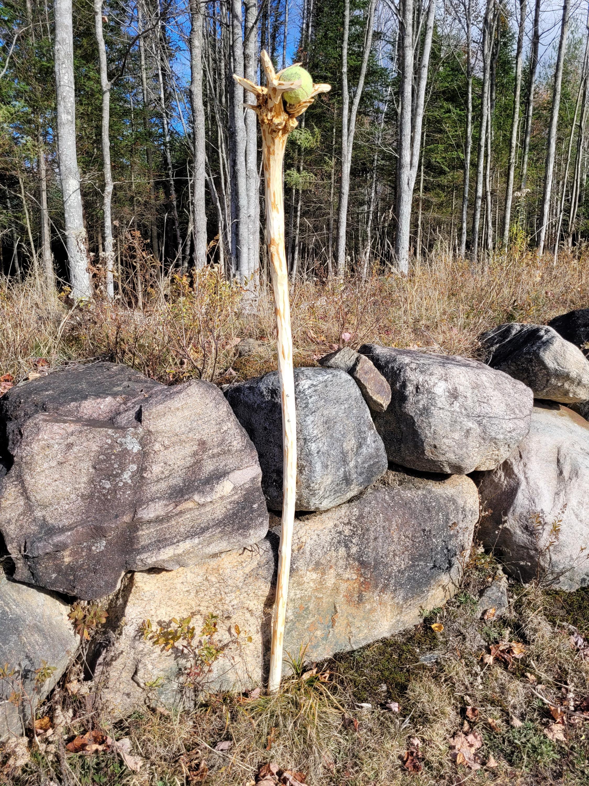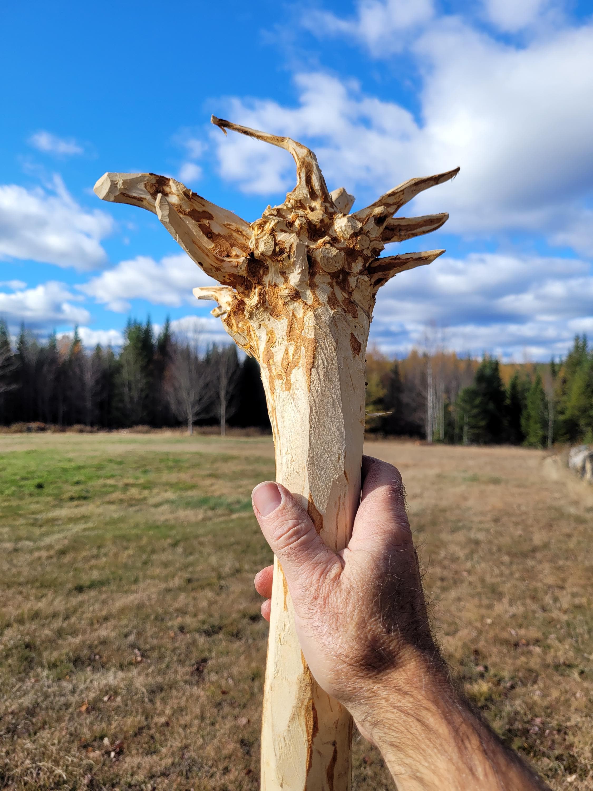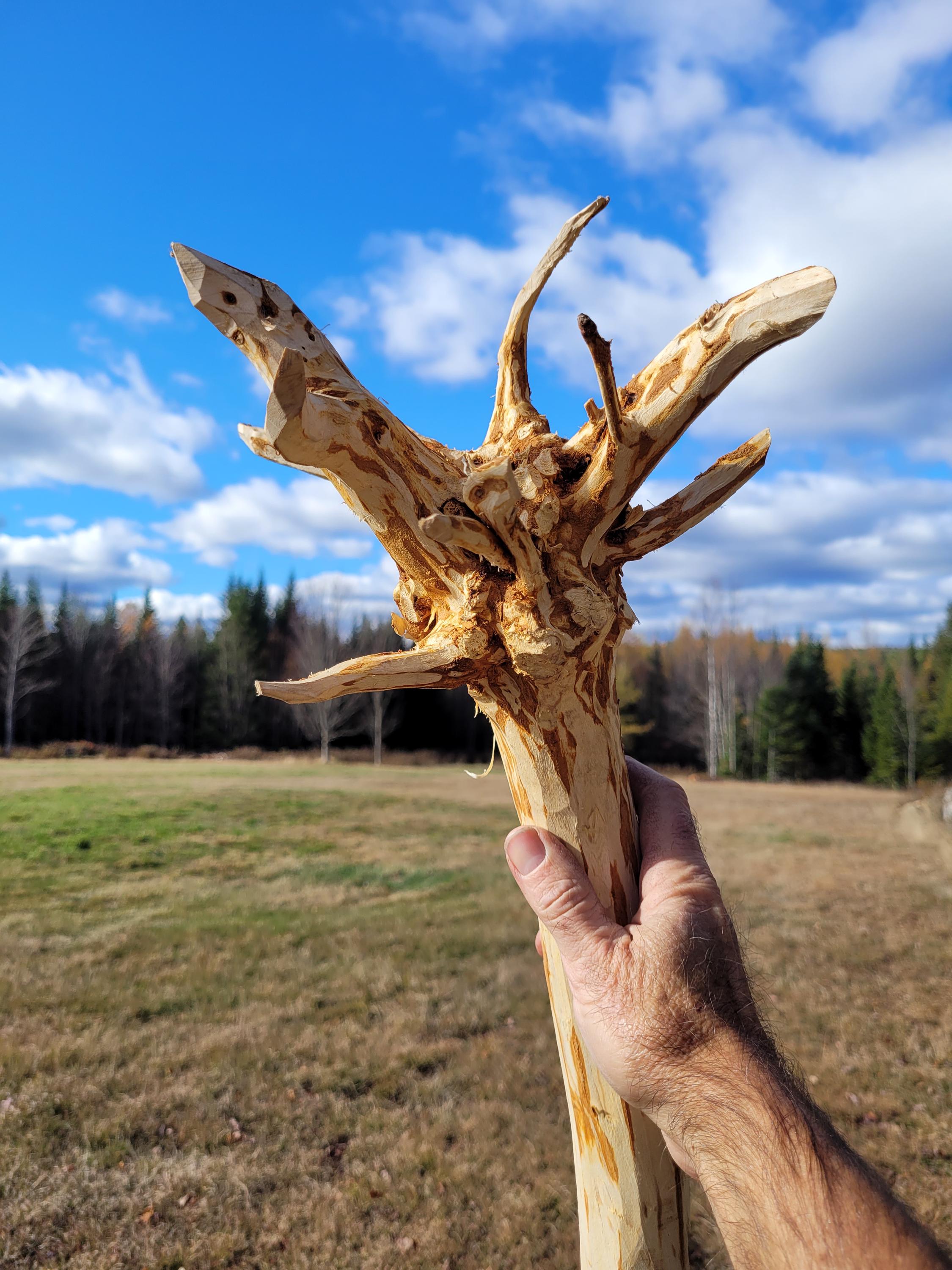 Here is a large wizard staff with an overlapping joint in the middle to reduce shipping. It is a birch specimen that stands 70-3/4" when assembled with the included hardware. When broken down it will ship in a 40" long x 8" x 8" box. Currently it weighs four pounds and the shaft ranges in diameter from 1-3/8" up to 2-1/4". A few of the pics show it with a 3" round dog ball (not included) just to demonstrate it can hold an artifact if that's your vision. This was harvested and the bark was stripped with a drawknife, hence it has flat facets and tooling marks all over to give it a hand-hewn look. It has two bark covered scar on it and the roots have some bark inclusions between where they originate. This is not straight, the entire piece curves somewhat. This is a raw material for you to customize.(ufws339)