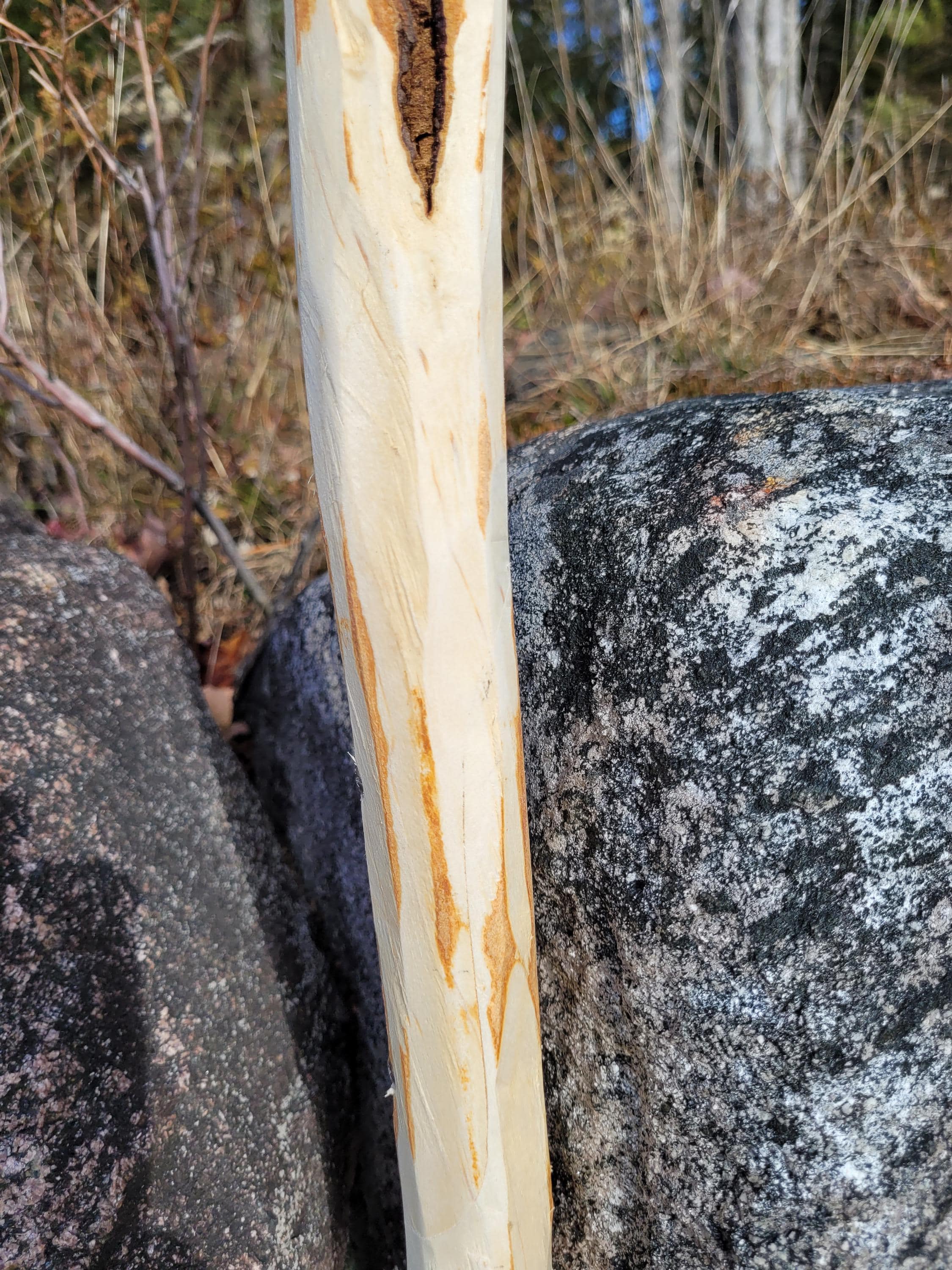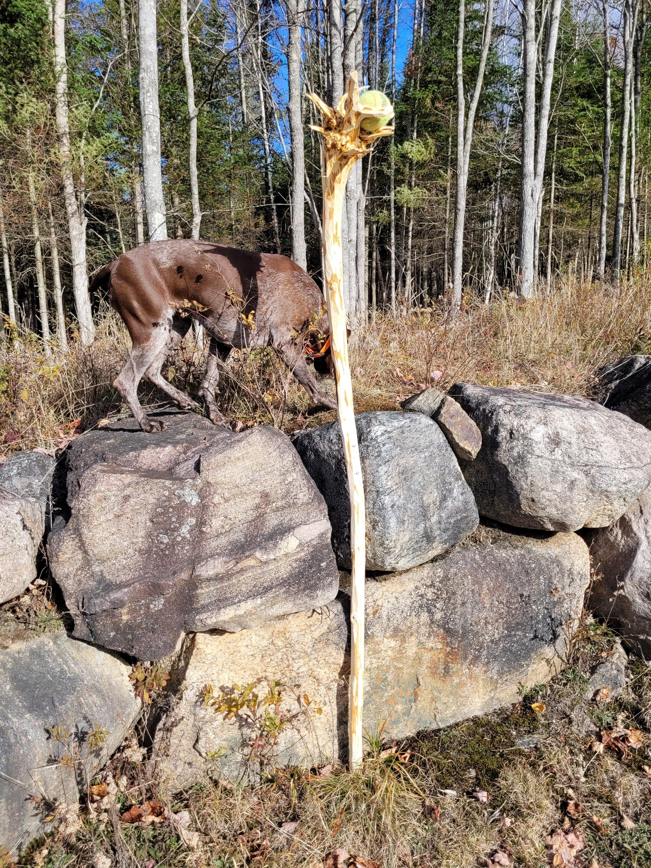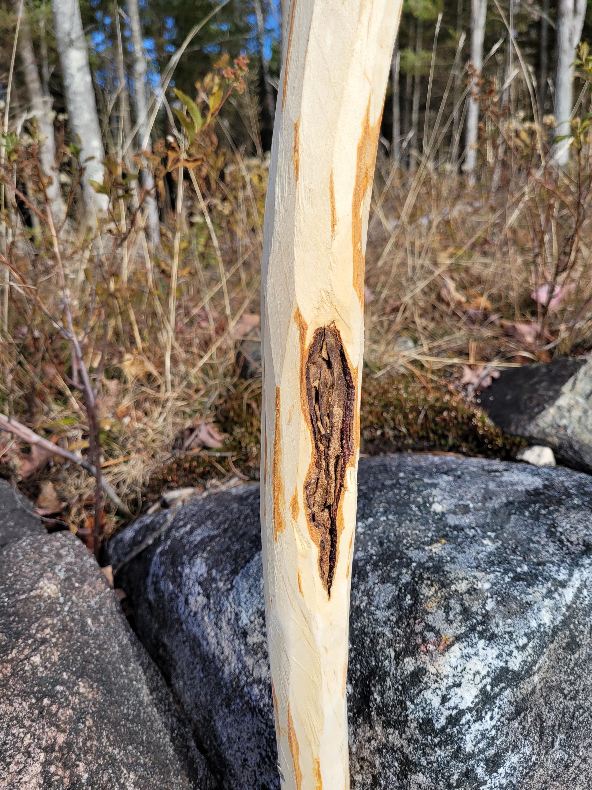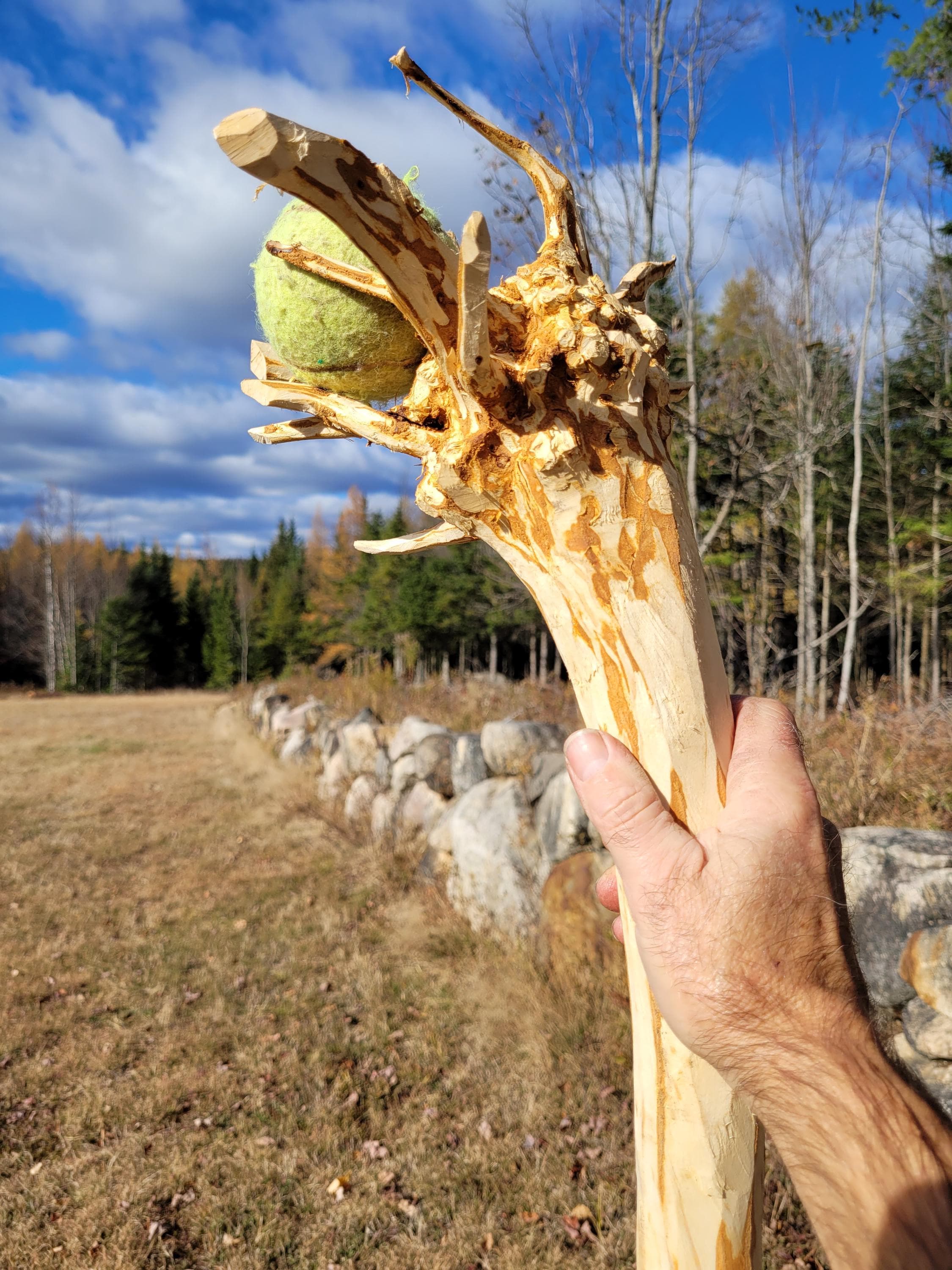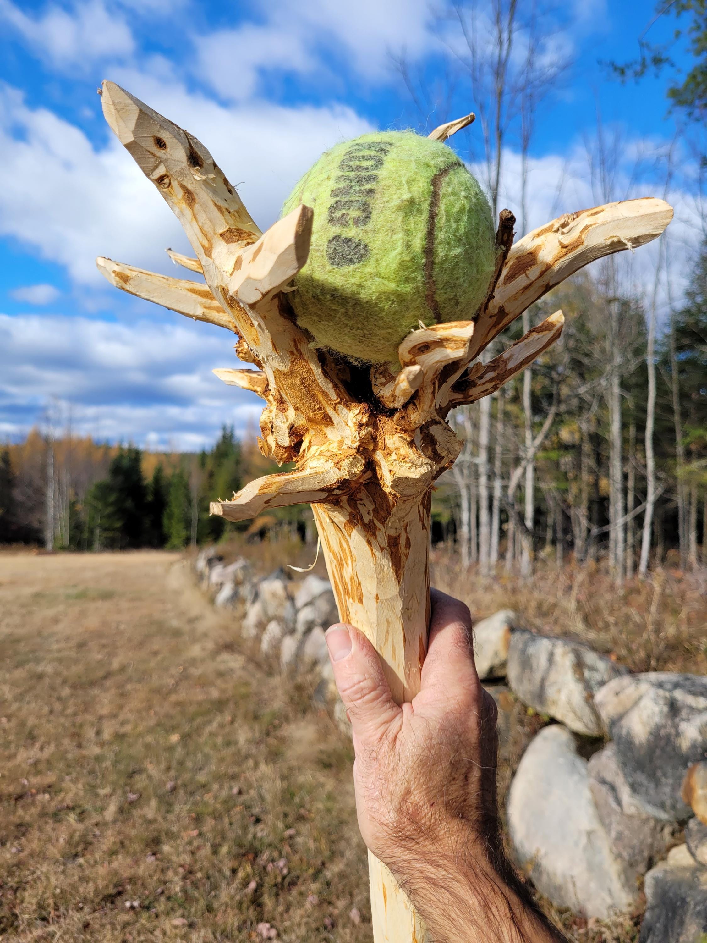 Here is a large wizard staff with an overlapping joint in the middle to reduce shipping. It is a birch specimen that stands 70-3/4" when assembled with the included hardware. When broken down it will ship in a 40" long x 8" x 8" box. Currently it weighs four pounds and the shaft ranges in diameter from 1-3/8" up to 2-1/4". A few of the pics show it with a 3" round dog ball (not included) just to demonstrate it can hold an artifact if that's your vision. This was harvested and the bark was stripped with a drawknife, hence it has flat facets and tooling marks all over to give it a hand-hewn look. It has two bark covered scar on it and the roots have some bark inclusions between where they originate. This is not straight, the entire piece curves somewhat. This is a raw material for you to customize.(ufws339)