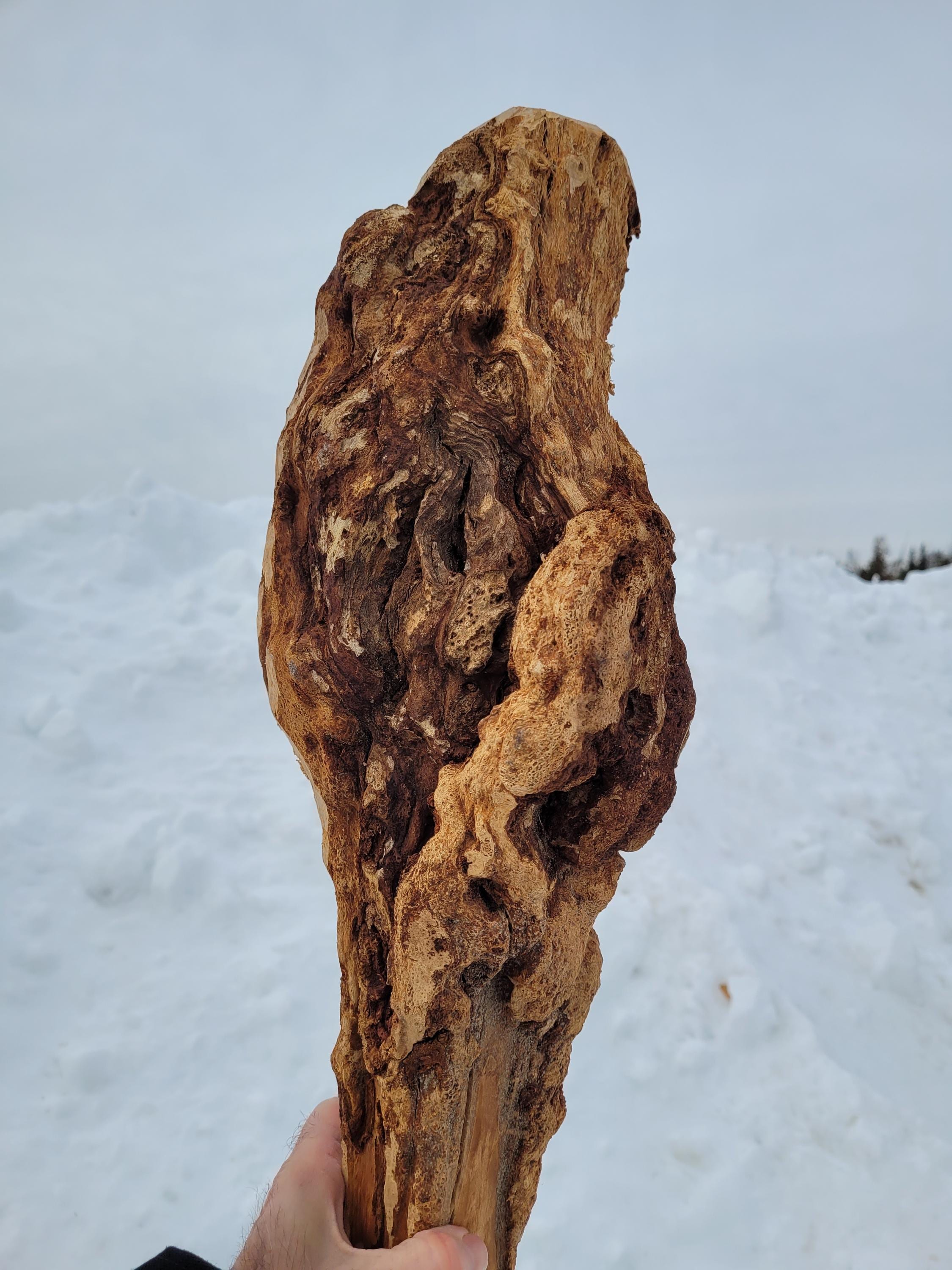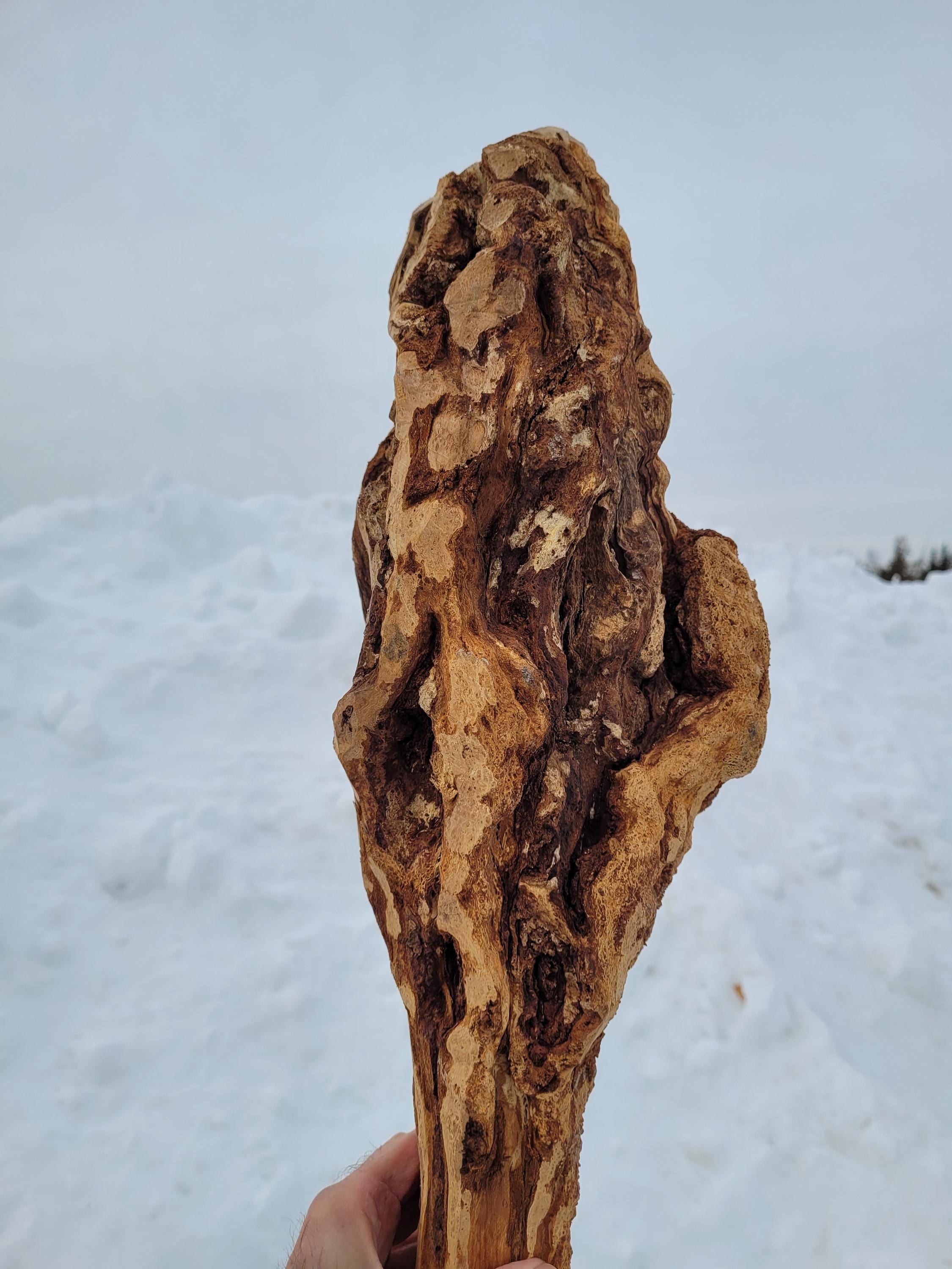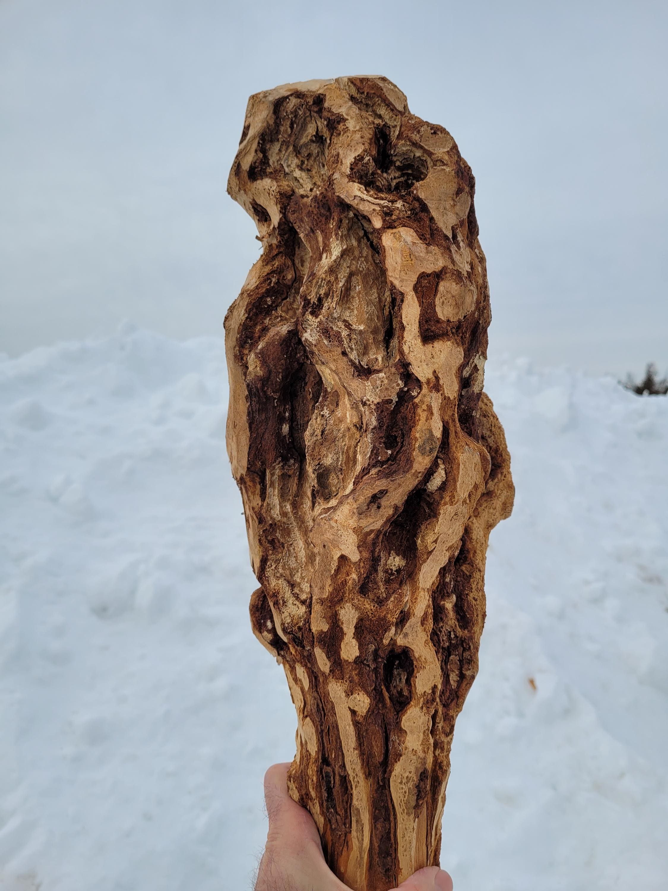 This is a really heavy, well seasoned Black Cherry burl staff in the raw for the creative mind. It is dry, dense and incredibly hard, It stands 71-1/2" tall and it weighs in at an unbelievable 10# 2 ozs. The sapling was barely alive and the burl is far from a solid mass. It has holes, cracks and crevices all over. If you are after a good, solid carving base this may not be it. If you are creative you can probably see potential for maybe an owl? Just realize that you may have to fill some voids with some deep pour epoxy if you are looking to carve an intricate, perfect shape. When I say carve I think you will be limited to rotary burrs and the like. Cherry burls are notoriously hard. They are very pretty when the grain is exposed and they typically get dark with a clear polyurethane or oil. The shaft on this ranges from just over 1-1/2" on the end to an oblong 2x2-1/2 girth below the burl. It has a few heart splits from drying and it is very top heavy, so you probably won't be hiking with it, but it would be cool at a Ren Faire. The burl itself is a very irregular 6" plus diameter and it is around 16-18" tall depending on where you say it stops. The bark was stripped with a drawknife on the shaft so it has the authentic hewn look with all the facets. Please note it will ship in a 72" x 8" x 8" box so it can be expensive if you are far away, or you can pick it up here and save the shipping.