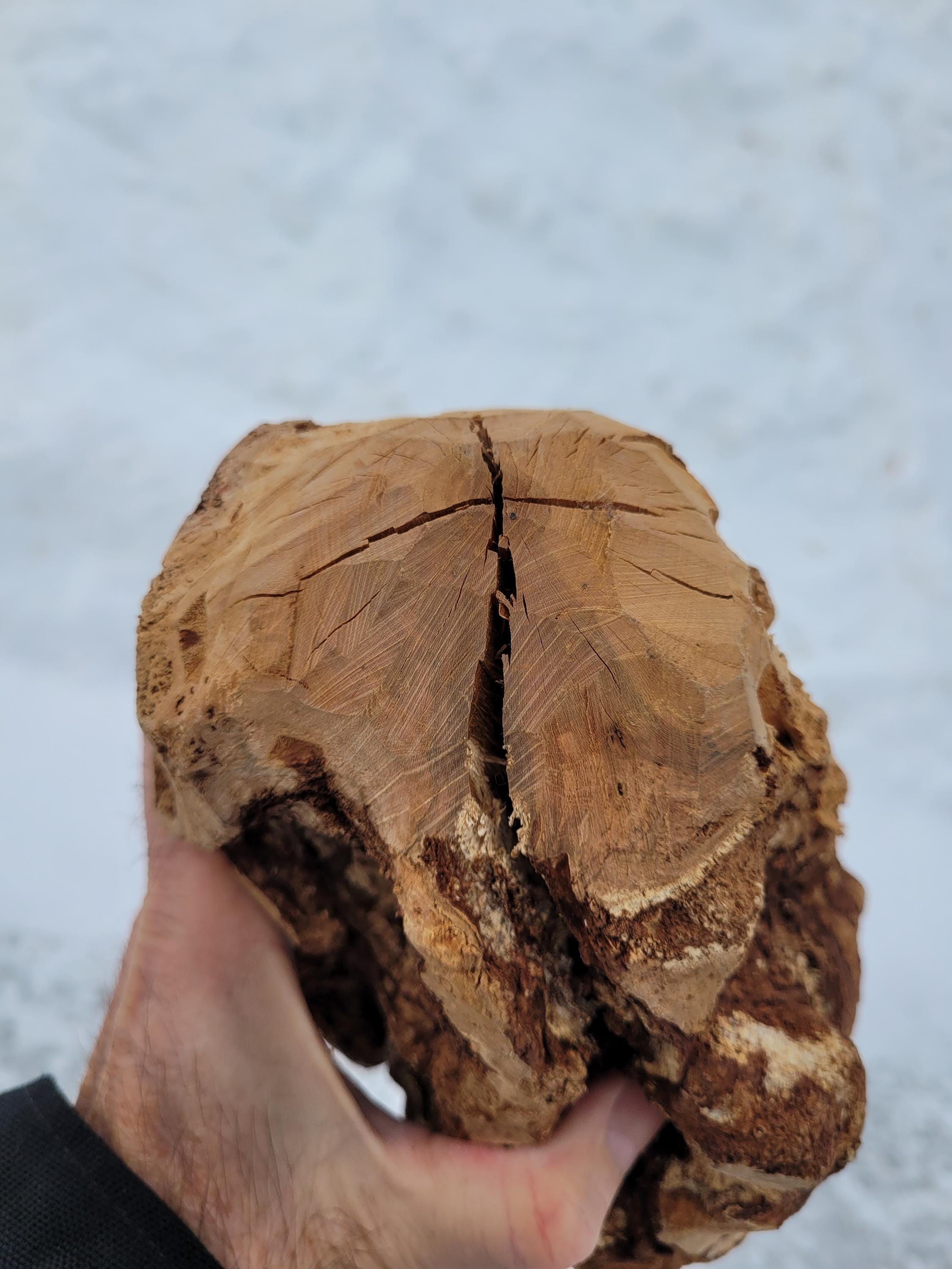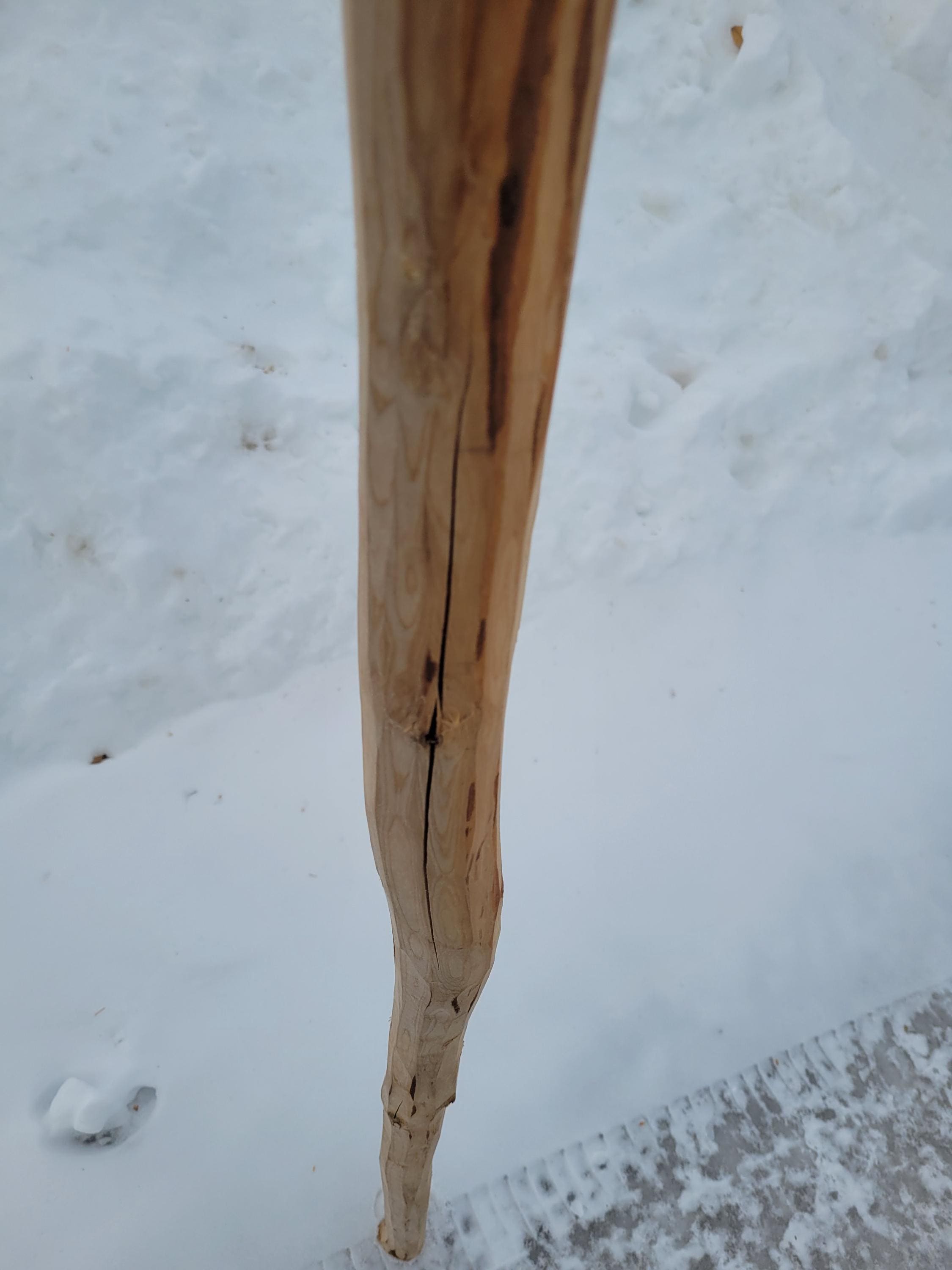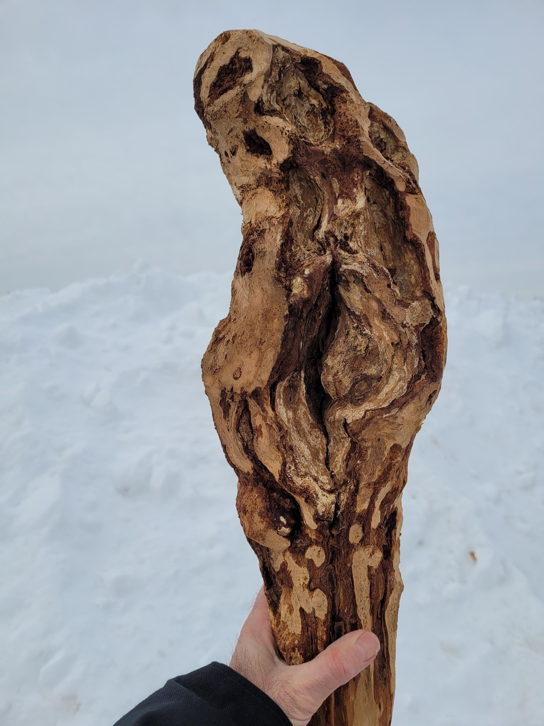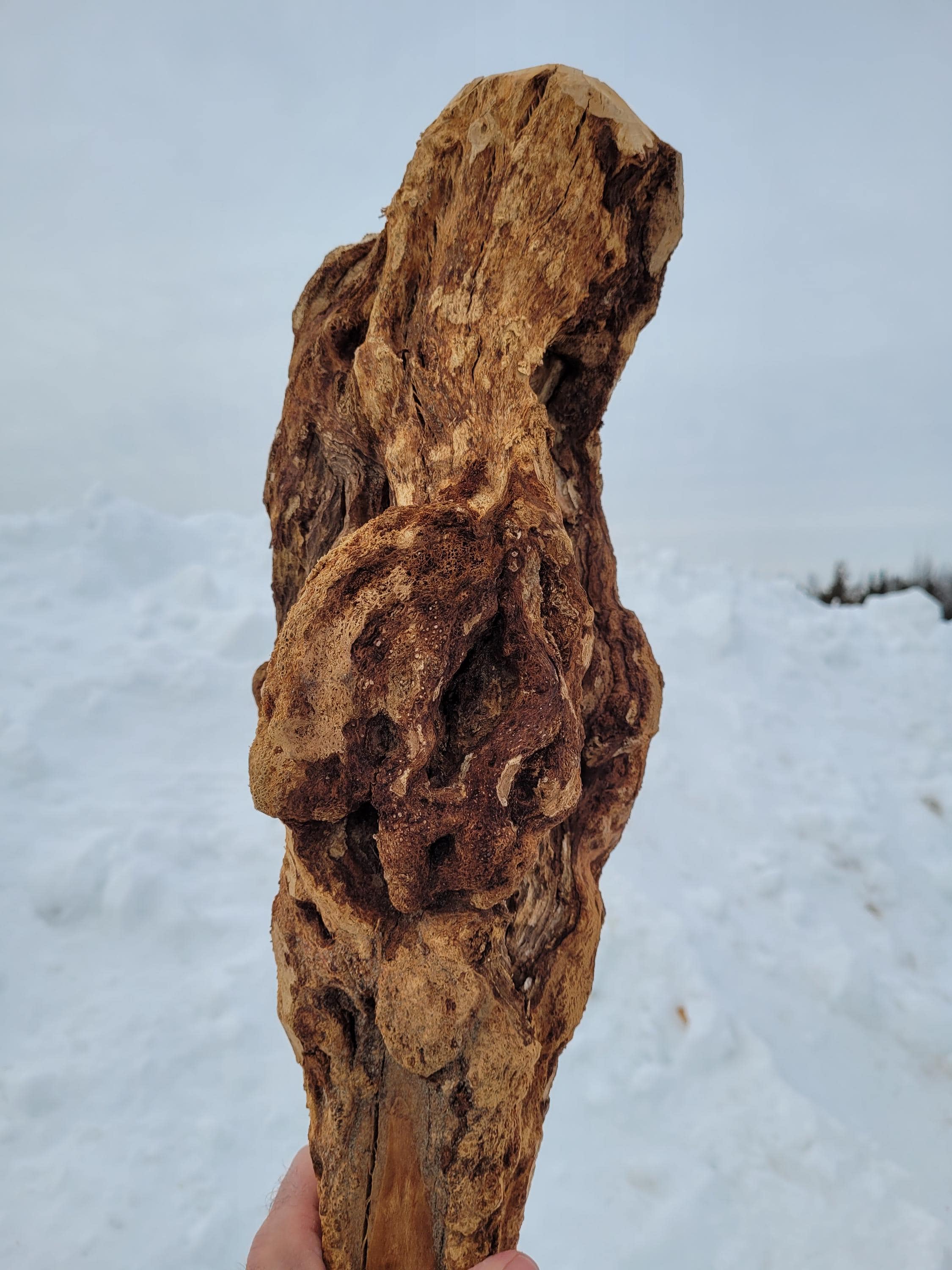 This is a really heavy, well seasoned Black Cherry burl staff in the raw for the creative mind. It is dry, dense and incredibly hard, It stands 71-1/2" tall and it weighs in at an unbelievable 10# 2 ozs. The sapling was barely alive and the burl is far from a solid mass. It has holes, cracks and crevices all over. If you are after a good, solid carving base this may not be it. If you are creative you can probably see potential for maybe an owl? Just realize that you may have to fill some voids with some deep pour epoxy if you are looking to carve an intricate, perfect shape. When I say carve I think you will be limited to rotary burrs and the like. Cherry burls are notoriously hard. They are very pretty when the grain is exposed and they typically get dark with a clear polyurethane or oil. The shaft on this ranges from just over 1-1/2" on the end to an oblong 2x2-1/2 girth below the burl. It has a few heart splits from drying and it is very top heavy, so you probably won't be hiking with it, but it would be cool at a Ren Faire. The burl itself is a very irregular 6" plus diameter and it is around 16-18" tall depending on where you say it stops. The bark was stripped with a drawknife on the shaft so it has the authentic hewn look with all the facets. Please note it will ship in a 72" x 8" x 8" box so it can be expensive if you are far away, or you can pick it up here and save the shipping.